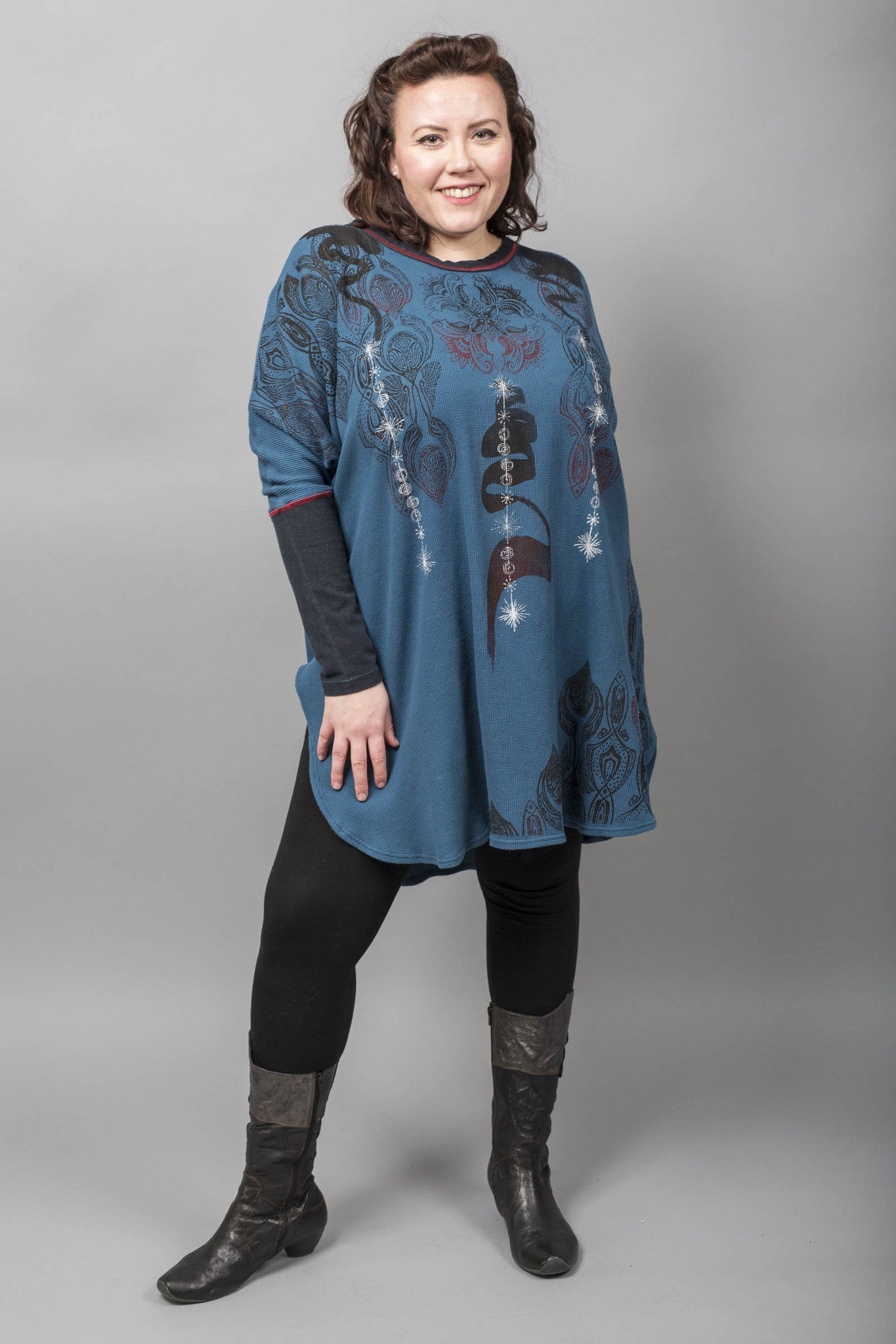 This roomy, stylish, one-size, thermal tunic is an instant classic. It has a scripted print with tones of black, red, and light gray in streams of illusions of calligraphy script. It's color block trimmed at the neck and sleeves with a thick cotton/hemp blend and contrasting red stitching.