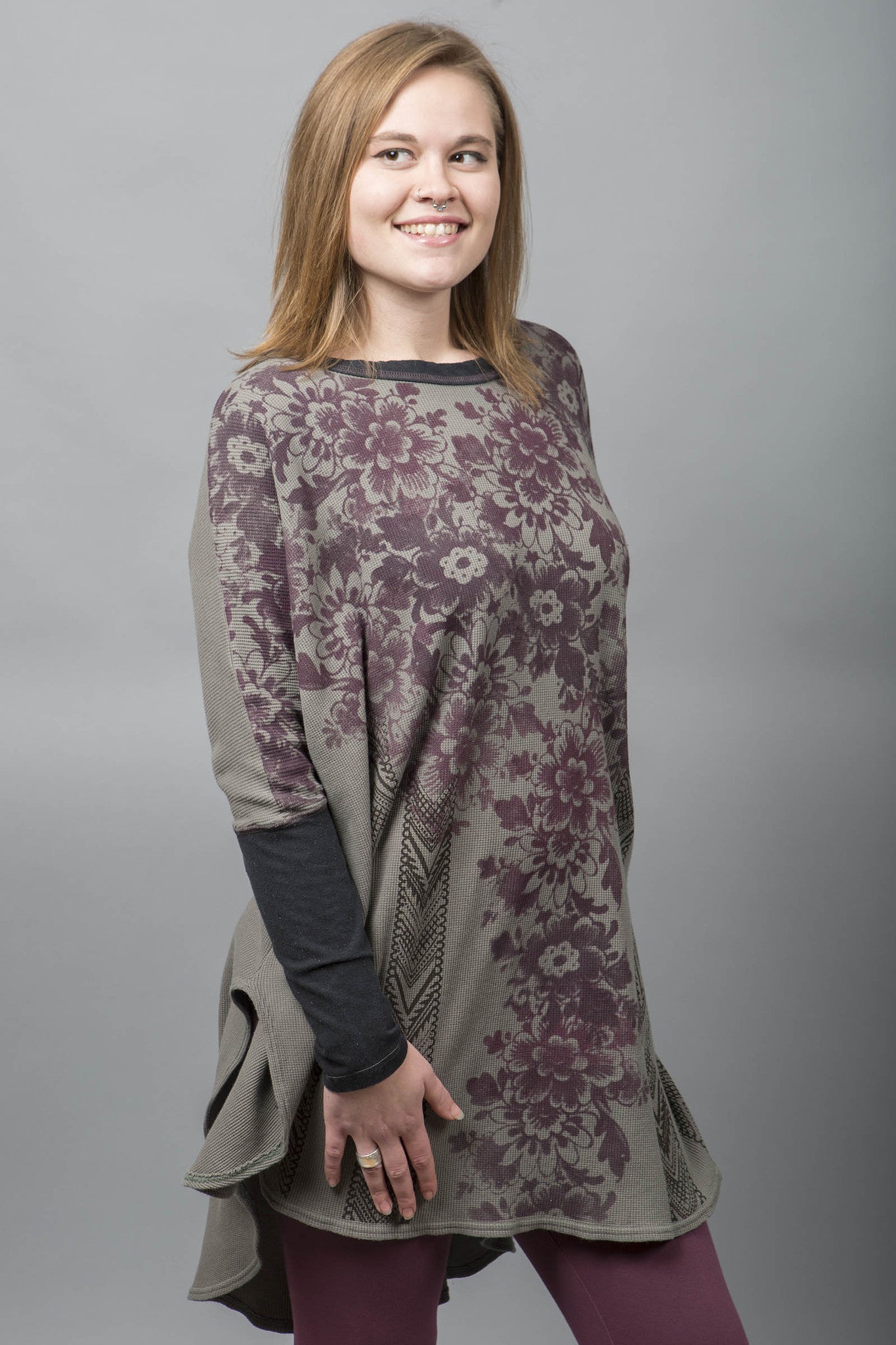 This roomy, stylish, one-size, thermal tunic is an instant classic. It has a plum flower motif print with dark and light tones of plum-purple that dance across the floral field anchored by black tribal columns. It's color block trimmed at the neck and sleeves with a thick cotton/hemp blend and contrasting warm charcoal stitching.