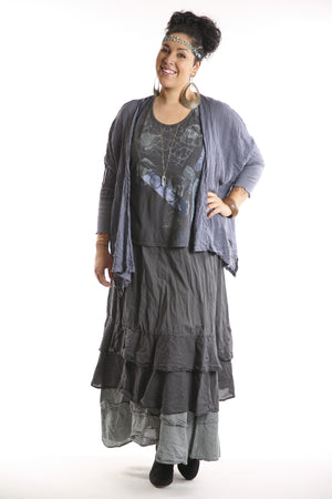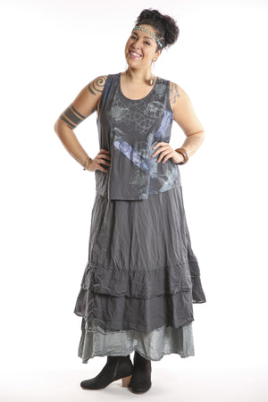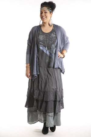 We are asked all year about our organic cotton tanks...This version's got a scooped hemline front and back and beautiful prints in shades of periwinkle blues and greens. These tanks will be your layering go-to all year long. Perfect worn under our Crinkle Cardi.