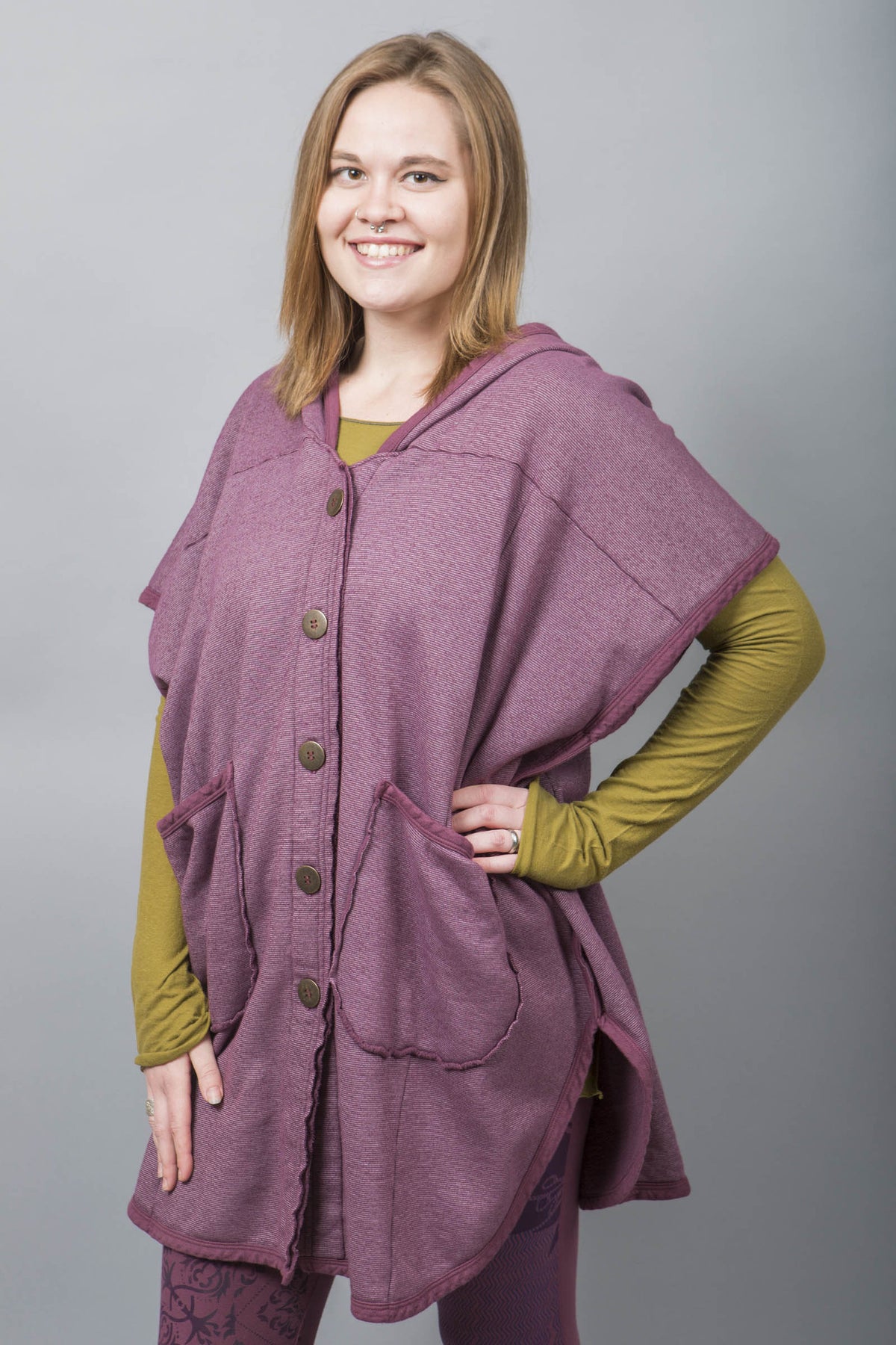 Yes. Don't wait! Limited edition, thick, not heavy, cozy warm organic sherpa knit just for us- a NEW fabric with sherpa softness on the inside, mini stripe texture and simple artful designs on the outside. POCKETS! Generous fit, POCKETS, button front, hemline scoops down to (xxx"). You can even turn it inside-out for a different look and texture. Whatever you call it vest/ poncho-cape...keep it close, you will want to live in it.
