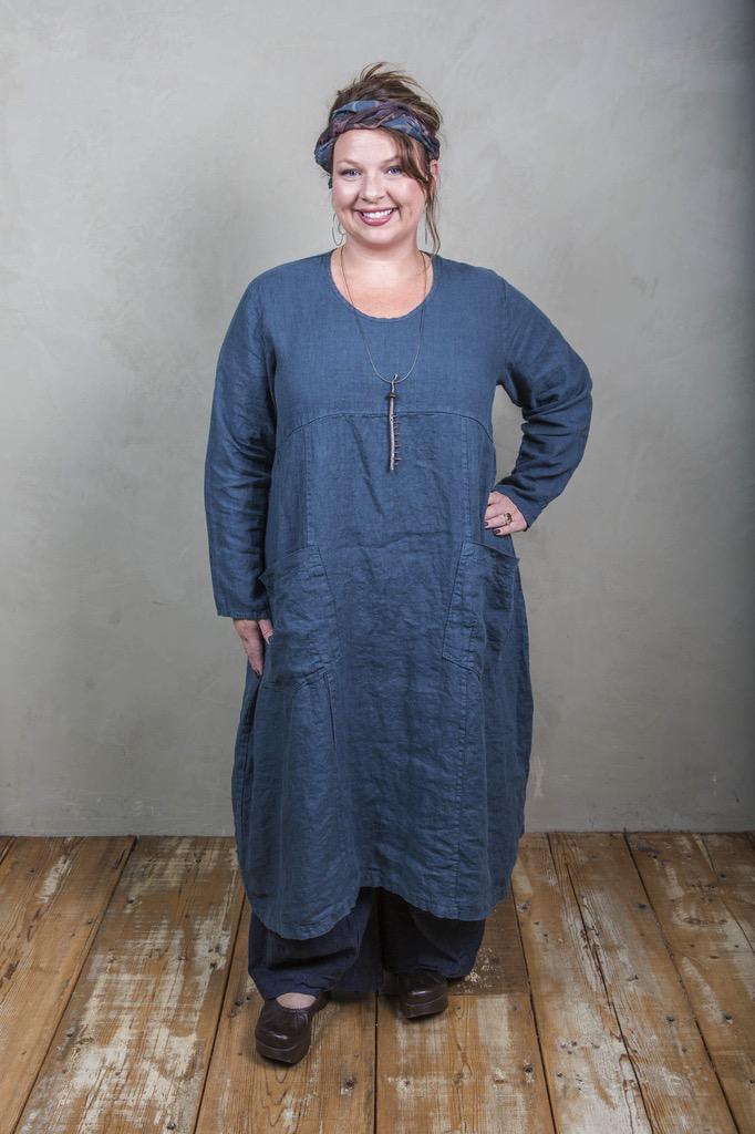 We love this elegant linen dress, timeless in its simplicity. Patch pockets add functionality, while the gently belled shape is perfectly flattering for every body. The artful hand printed designs are inspired by the crystalline and molecular structures of rare-earth minerals. Just beautiful!