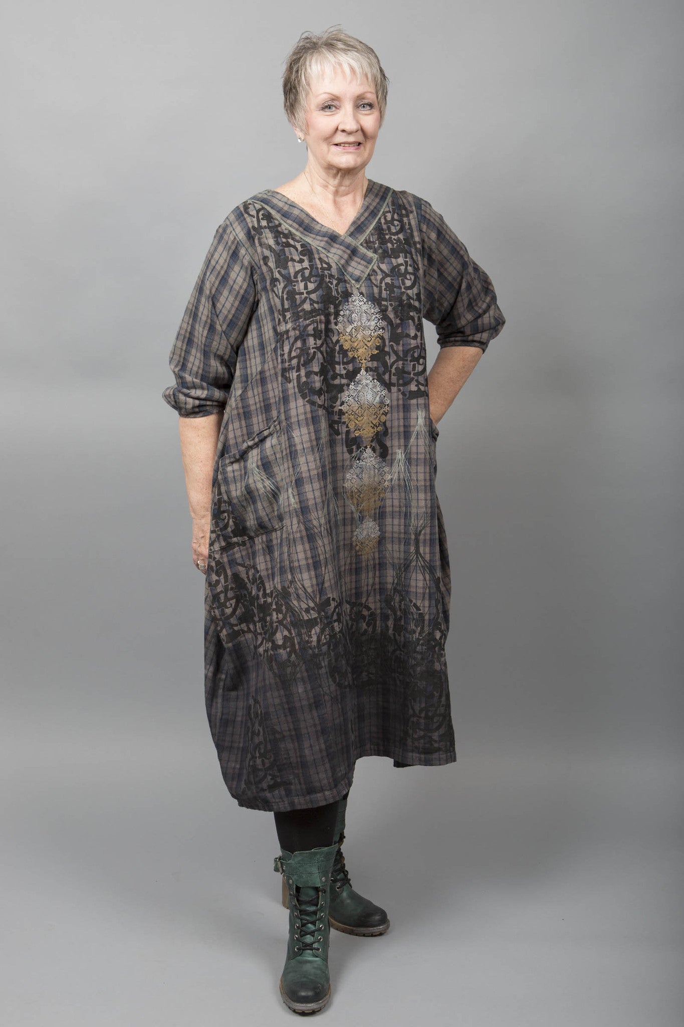 When I first saw them, I thought- 'these dresses are blue moon dresses'... they are rare and gorgeous. We have crafted them in the USA from a perfect-weight brushed cotton plaid which we have dyed several times by hand, and hand printed in intricate layers of shade, design, and texture. Each is unique. The style is perfect, a favorite lengthened to 50" which flatters us all whether shorter or taller. Lovely details at sleeve opening and crossover neckline. Made in extremely limited quantities. A dress to fall in love with.