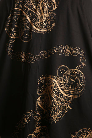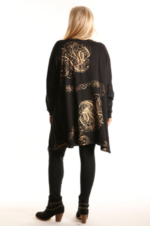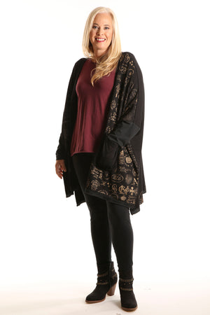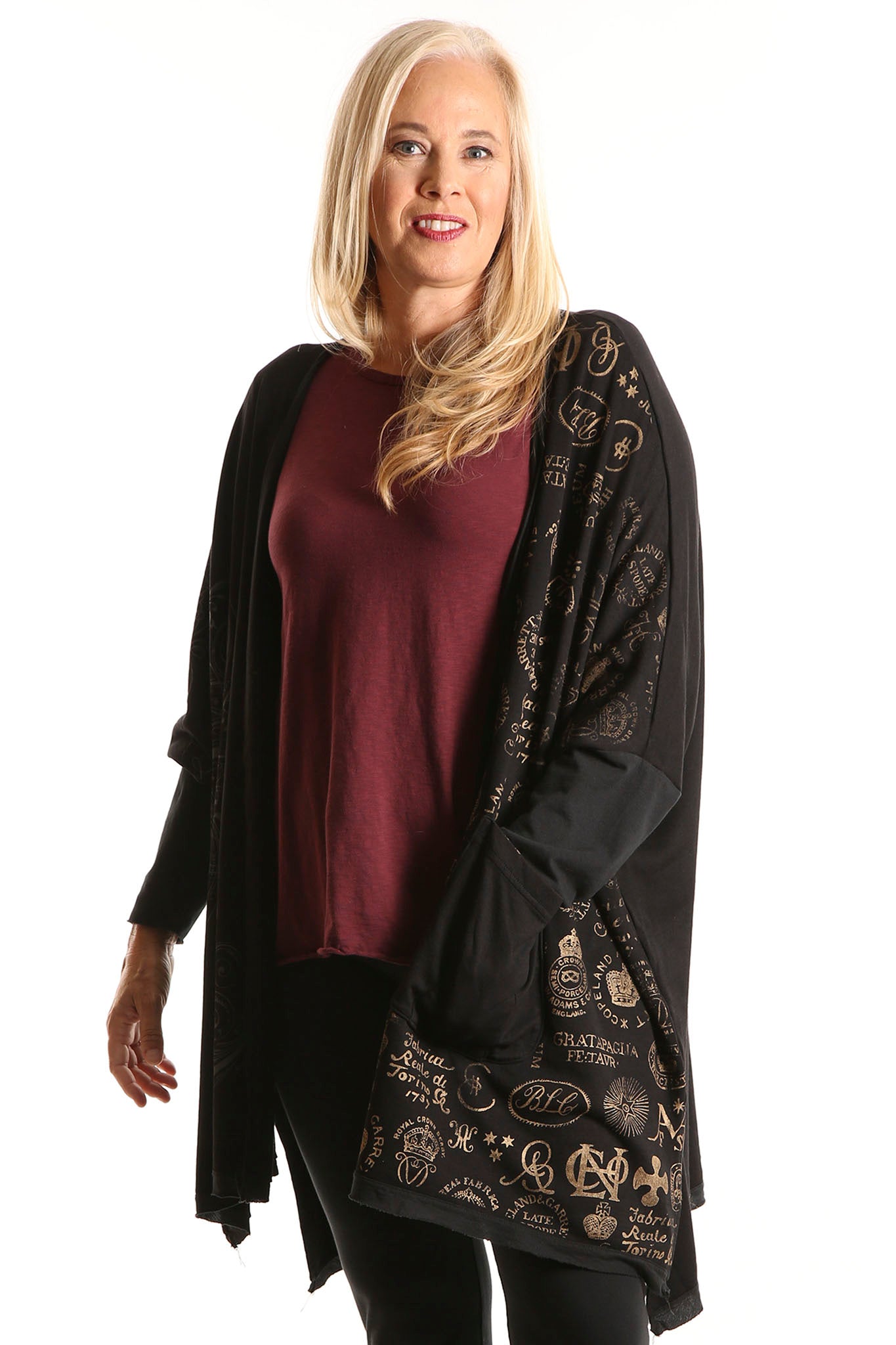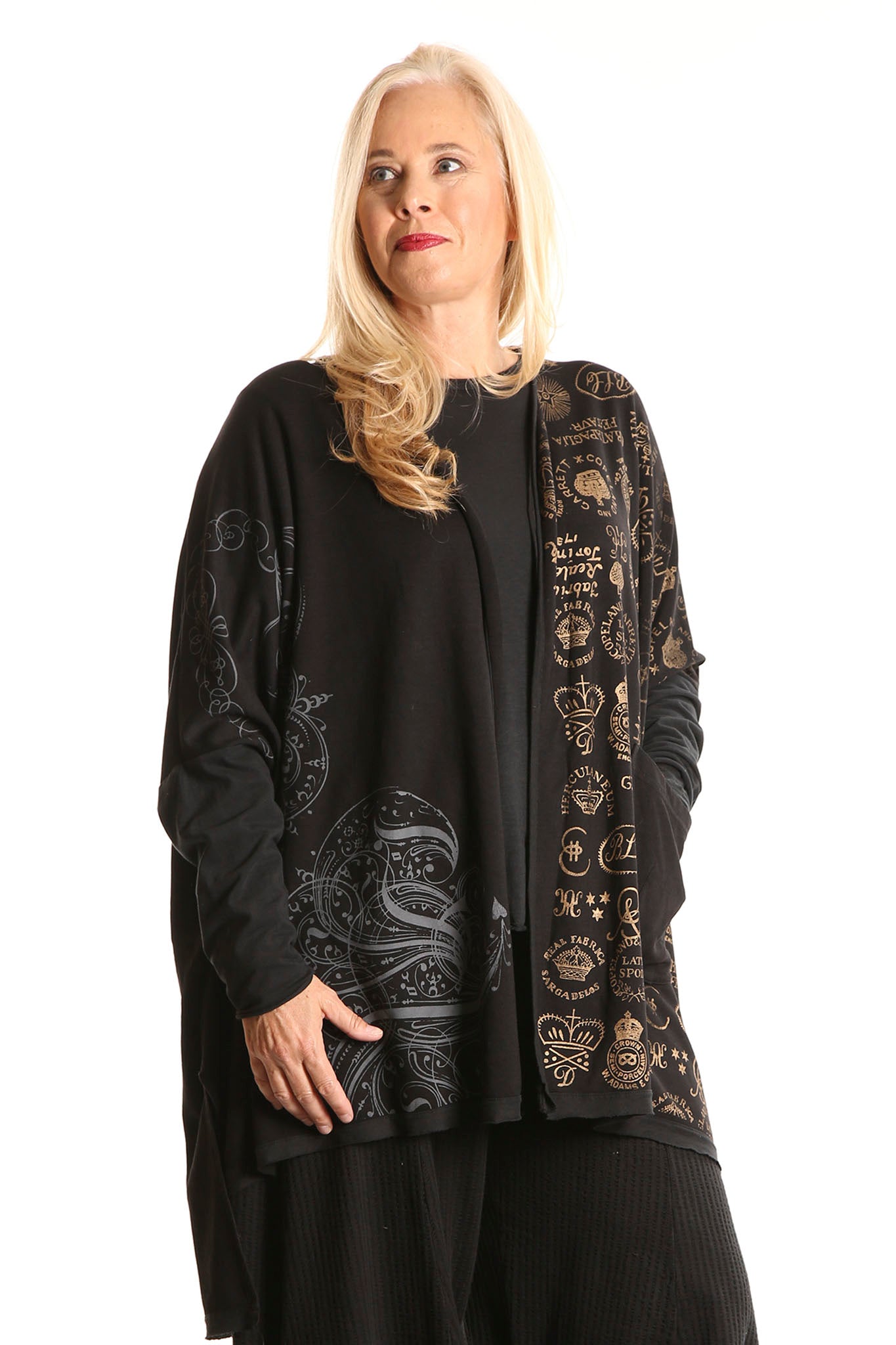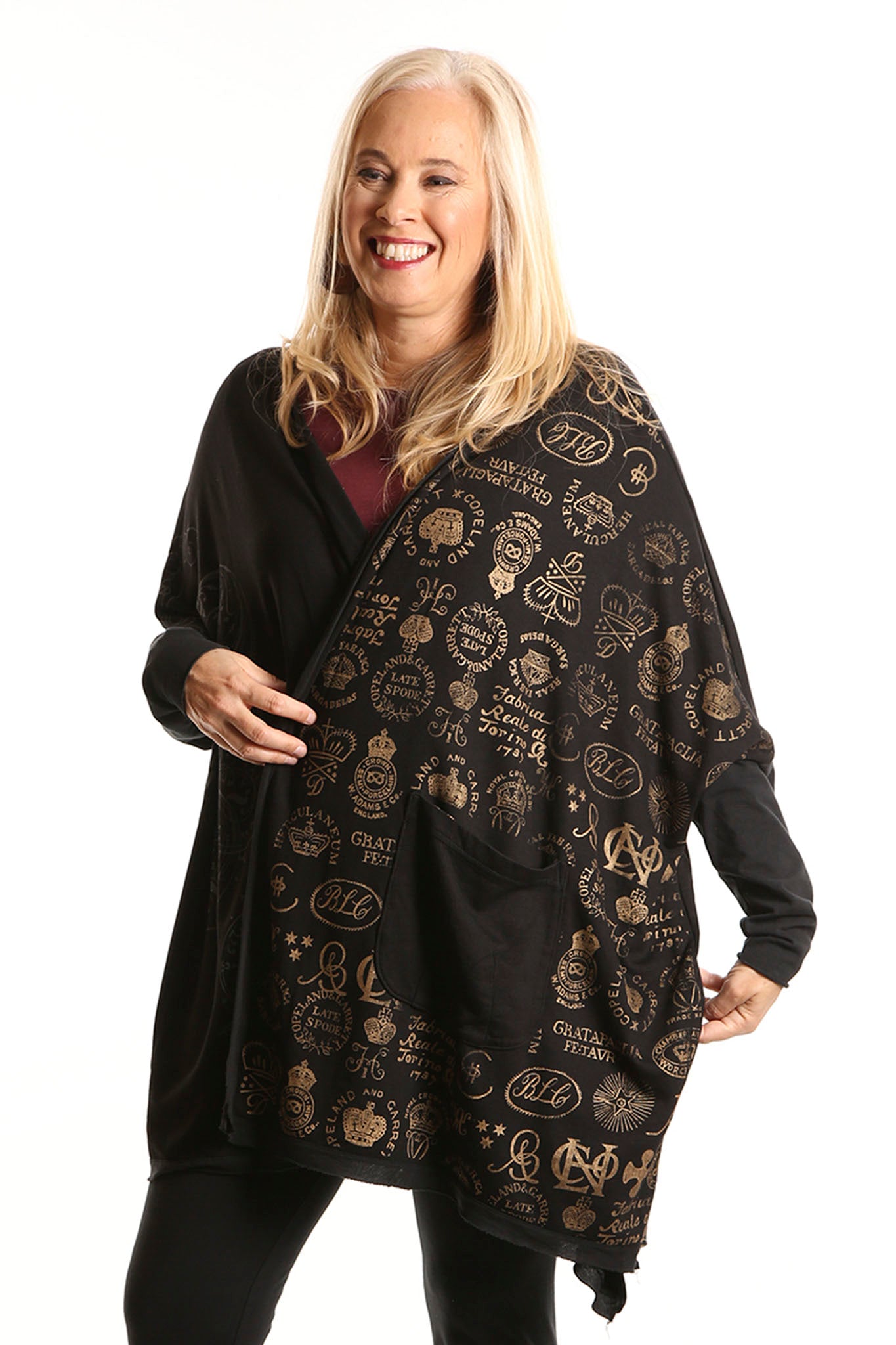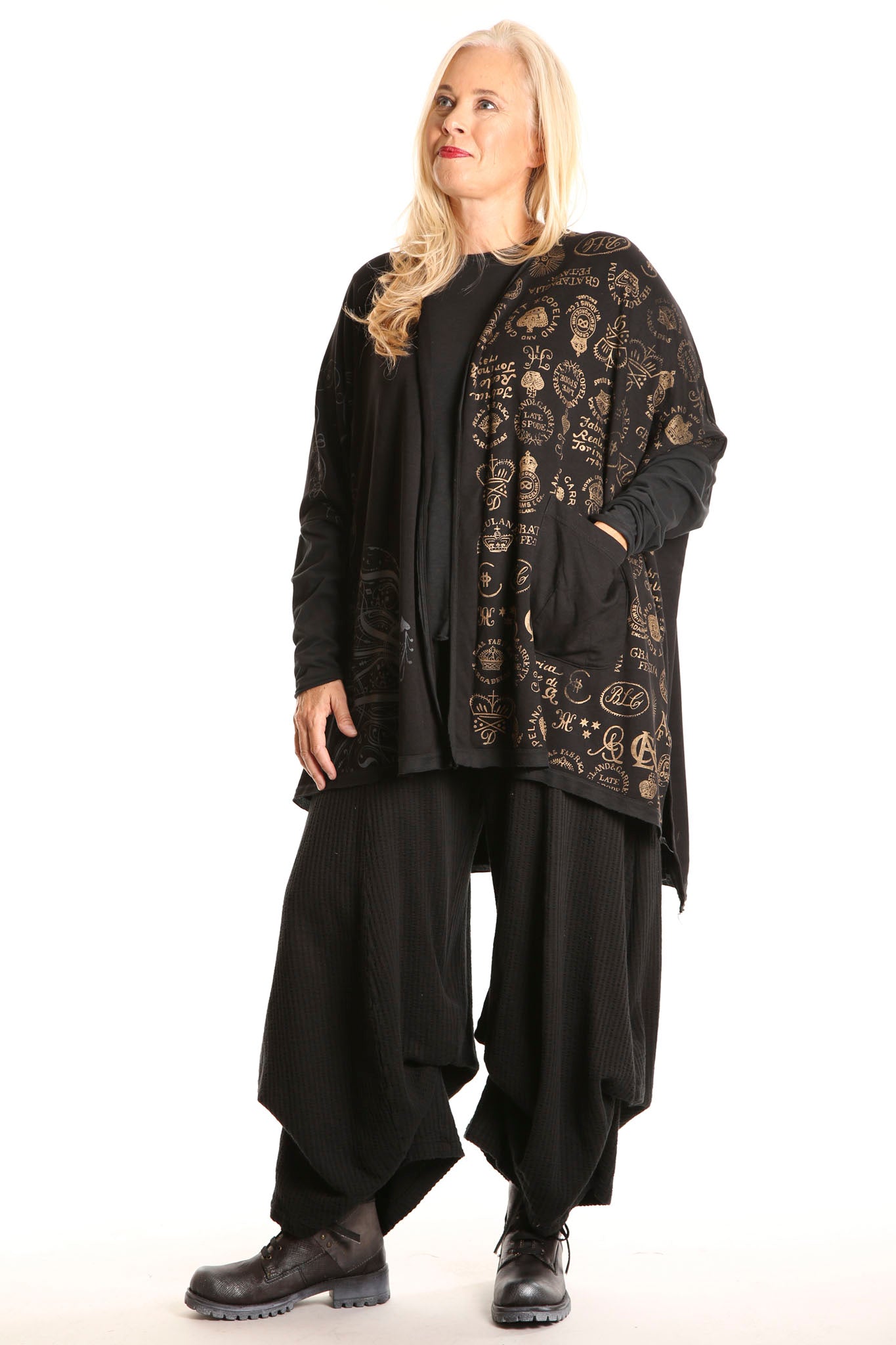 This extremely oversized square one size cardi is a statement piece and has so much lovely drape! Made in USA of heavier, dense, soft fabric comprised of rayon and lycra, this cardigan is a throw-on piece that flatters all sizes. Designed to be worn open, layered over. Large patch pocket on front. The sleeves are fitted to the arm from elbow to wrist. It features beautiful hand printing including antique gold metallic calligraphic designs and porcelain makers marks from the 1700's on the front and the back. Throw over any black outfit and you are all set to go.