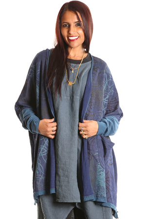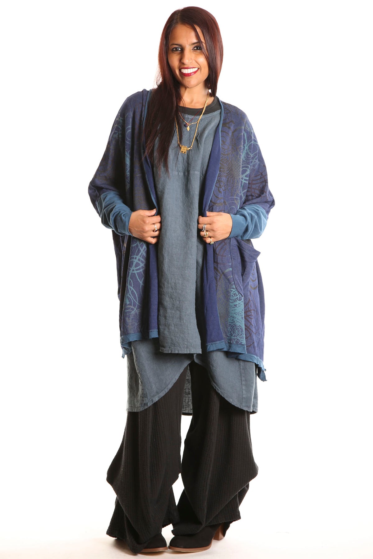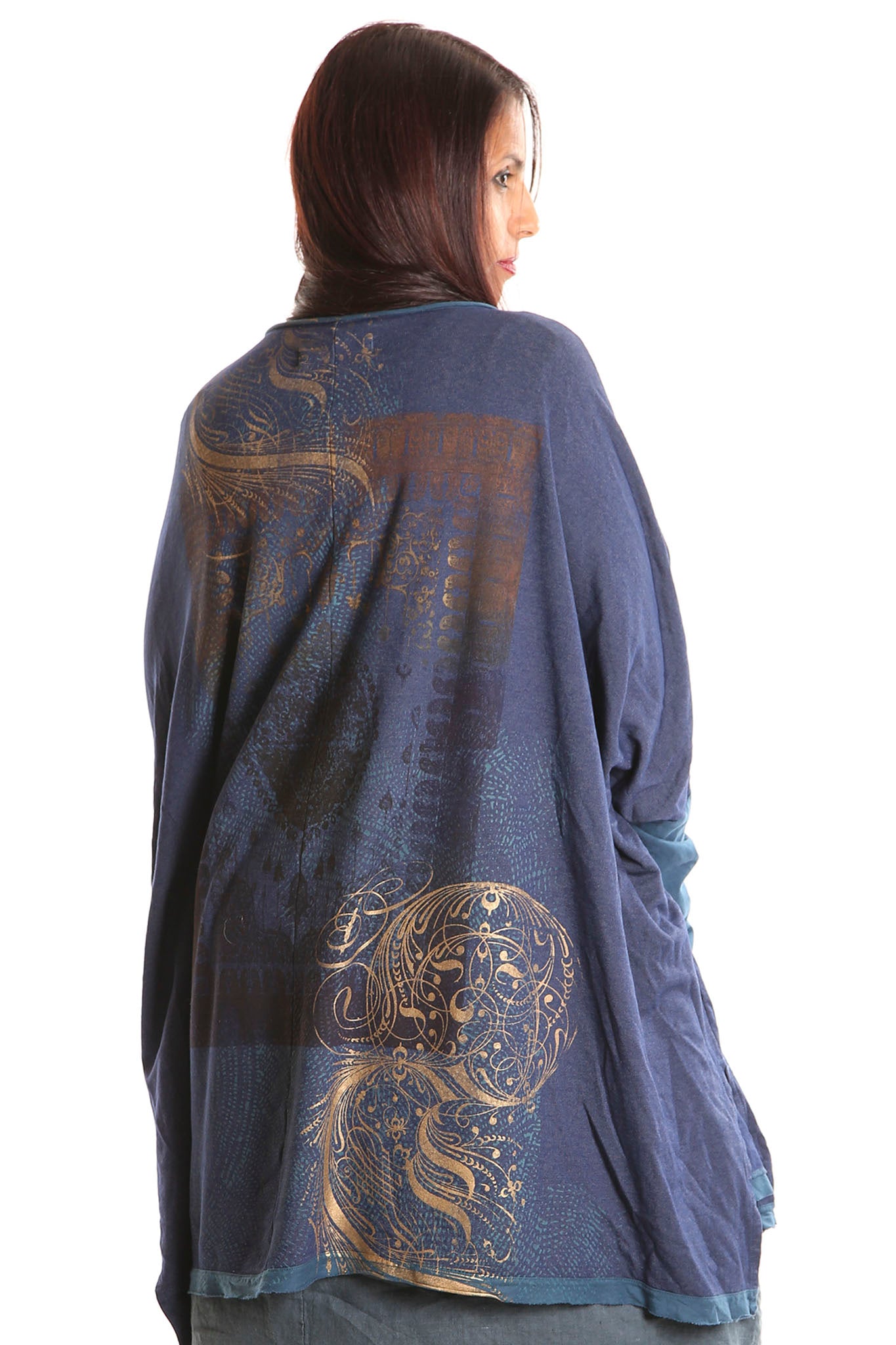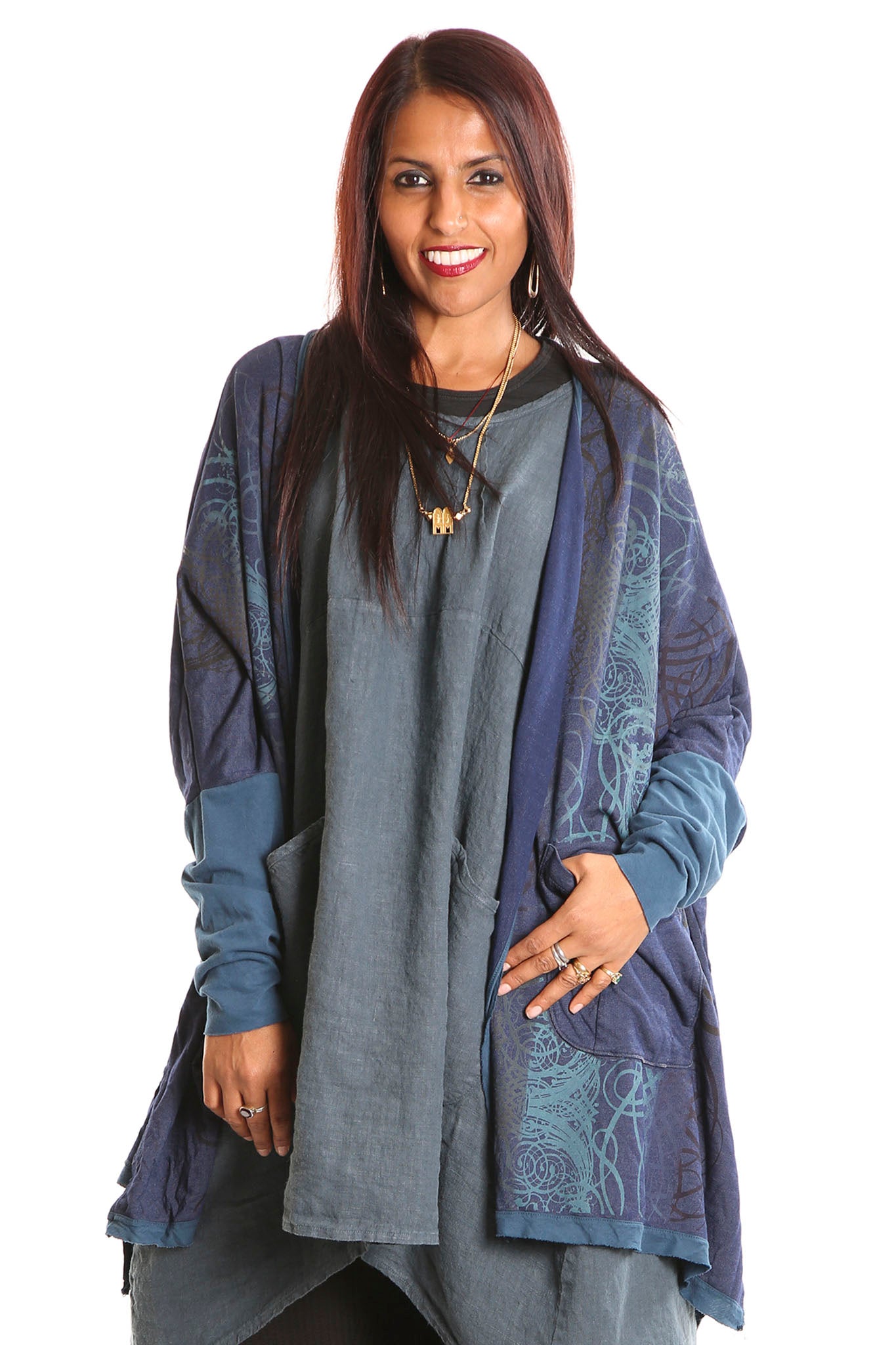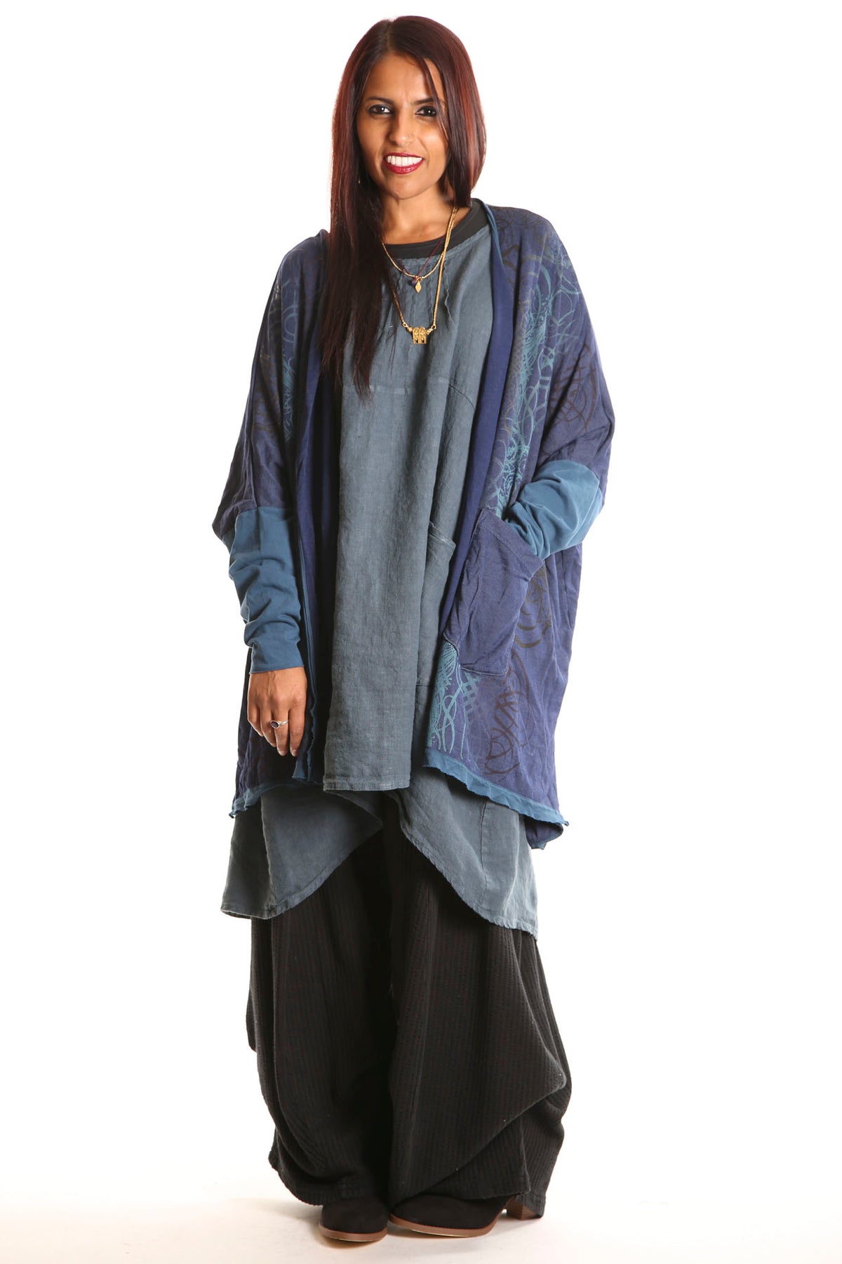 This extremely oversized square one size cardi is a statement piece and has so much lovely drape! Made in USA of heavier, dense, soft fabric comprised of rayon and lycra, this cardigan is a throw-on piece that flatters all sizes. Designed to be worn open, layered over. Large patch pocket on front. The sleeves are fitted to the arm from elbow to wrist. It features beautiful hand printing including antique deeply colored persian rug designs and beautiful calligraphic forms from the 1800's on the front and the back.