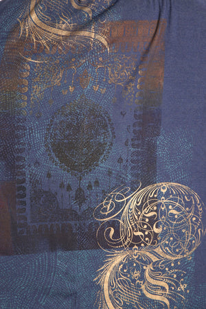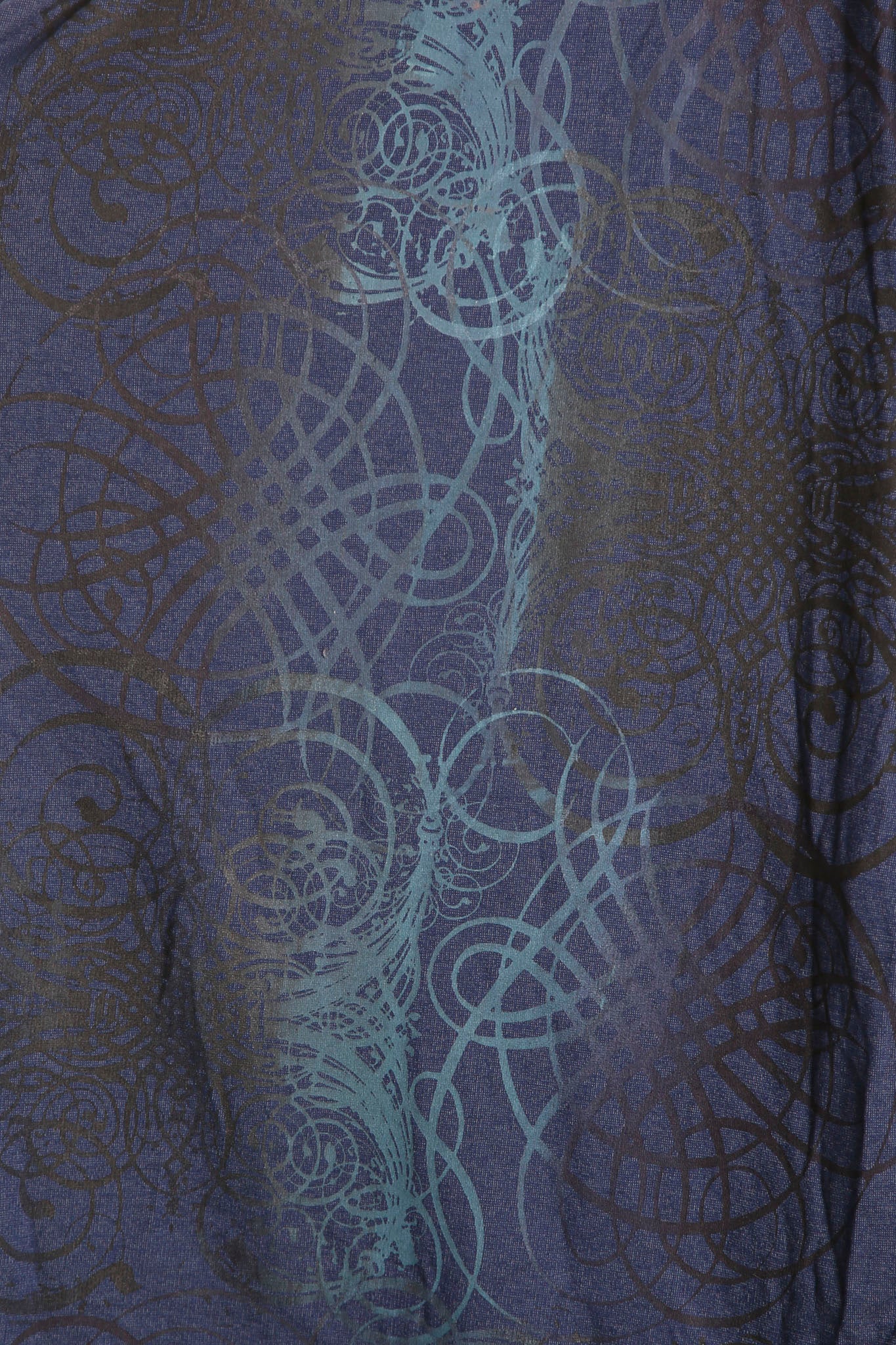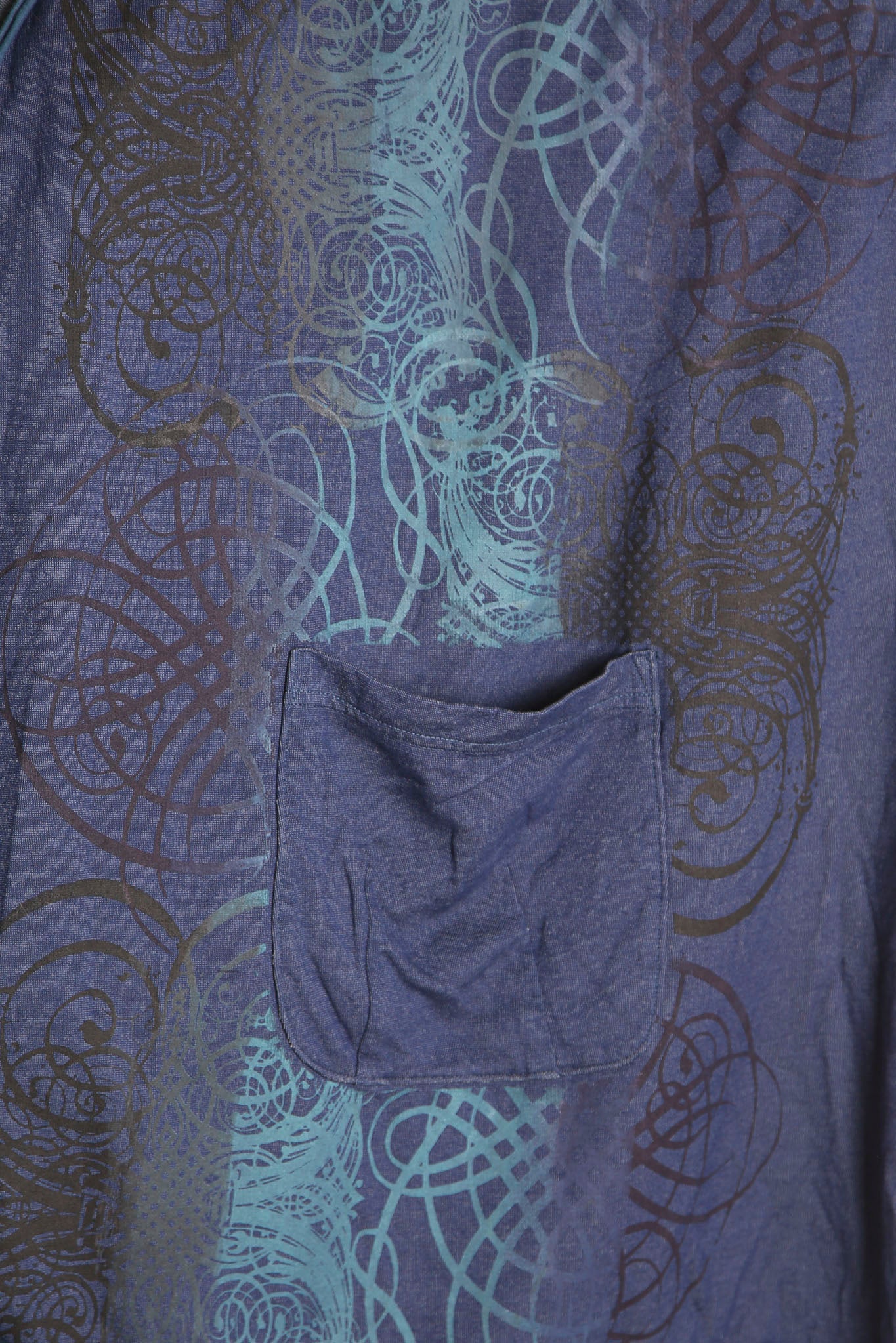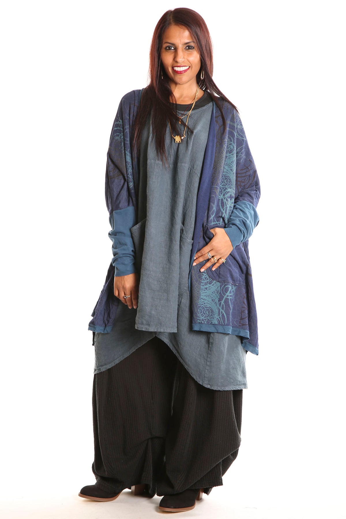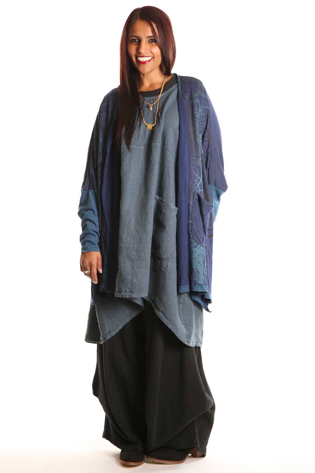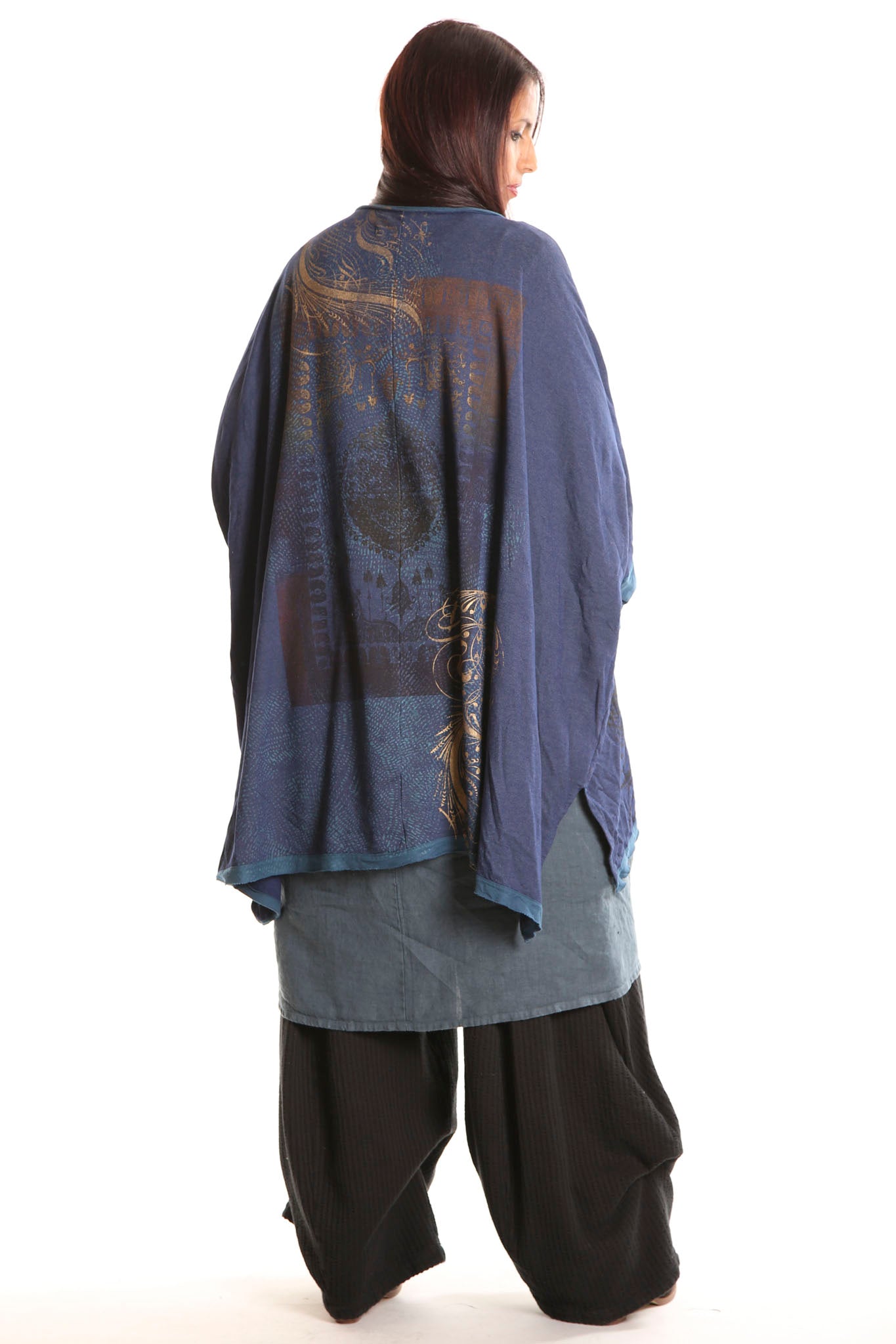 This extremely oversized square one size cardi is a statement piece and has so much lovely drape! Made in USA of heavier, dense, soft fabric comprised of rayon and lycra, this cardigan is a throw-on piece that flatters all sizes. Designed to be worn open, layered over. Large patch pocket on front. The sleeves are fitted to the arm from elbow to wrist. It features beautiful hand printing including antique deeply colored persian rug designs and beautiful calligraphic forms from the 1800's on the front and the back.