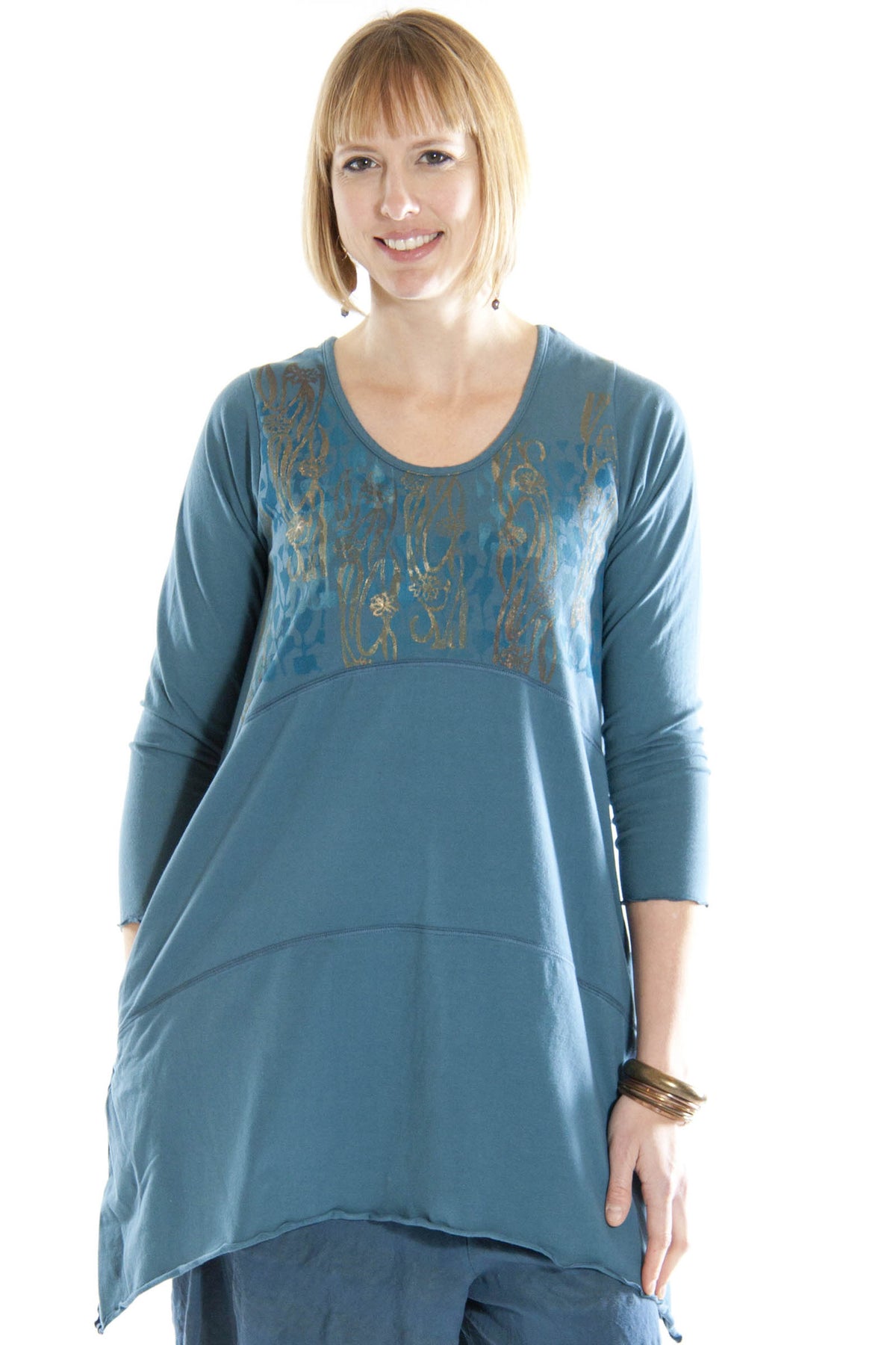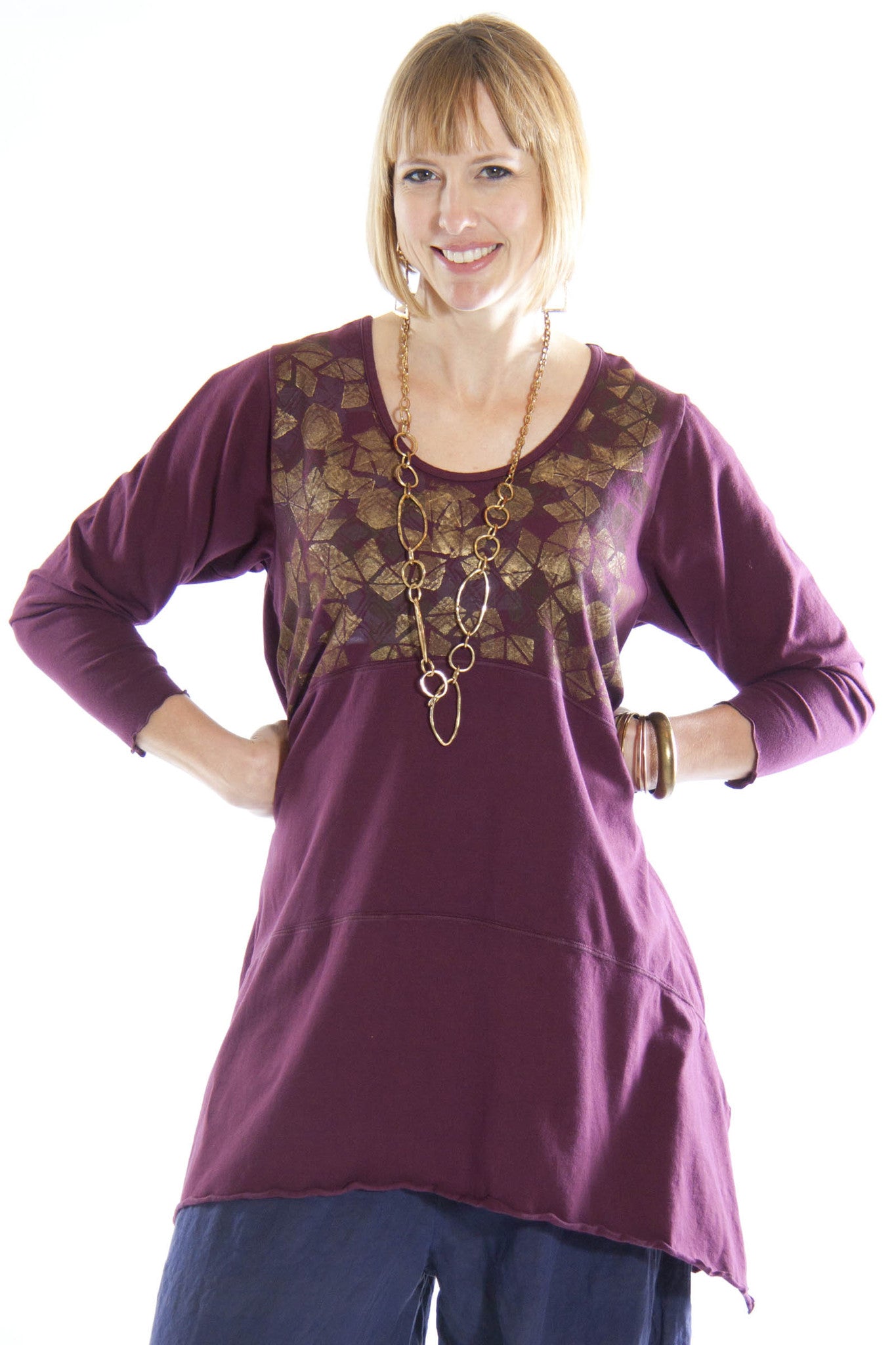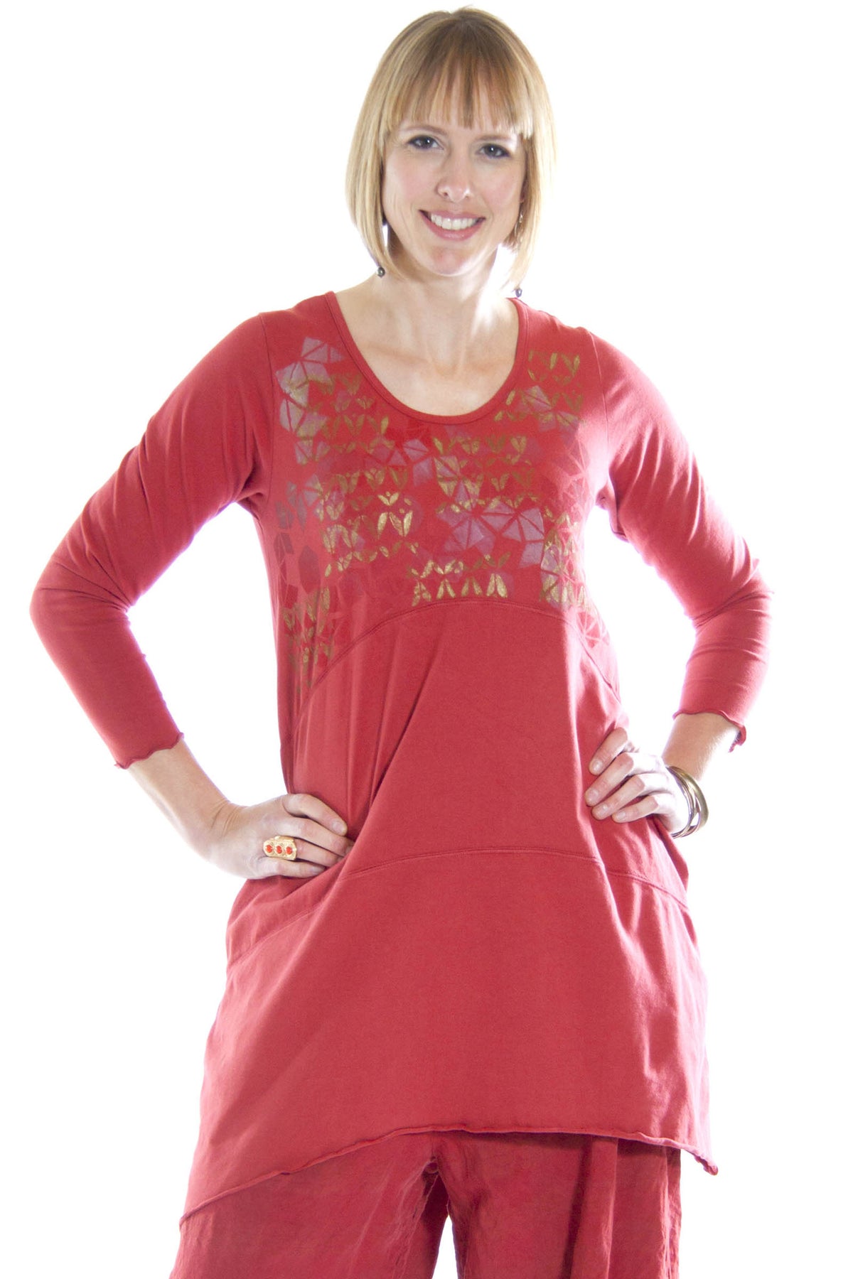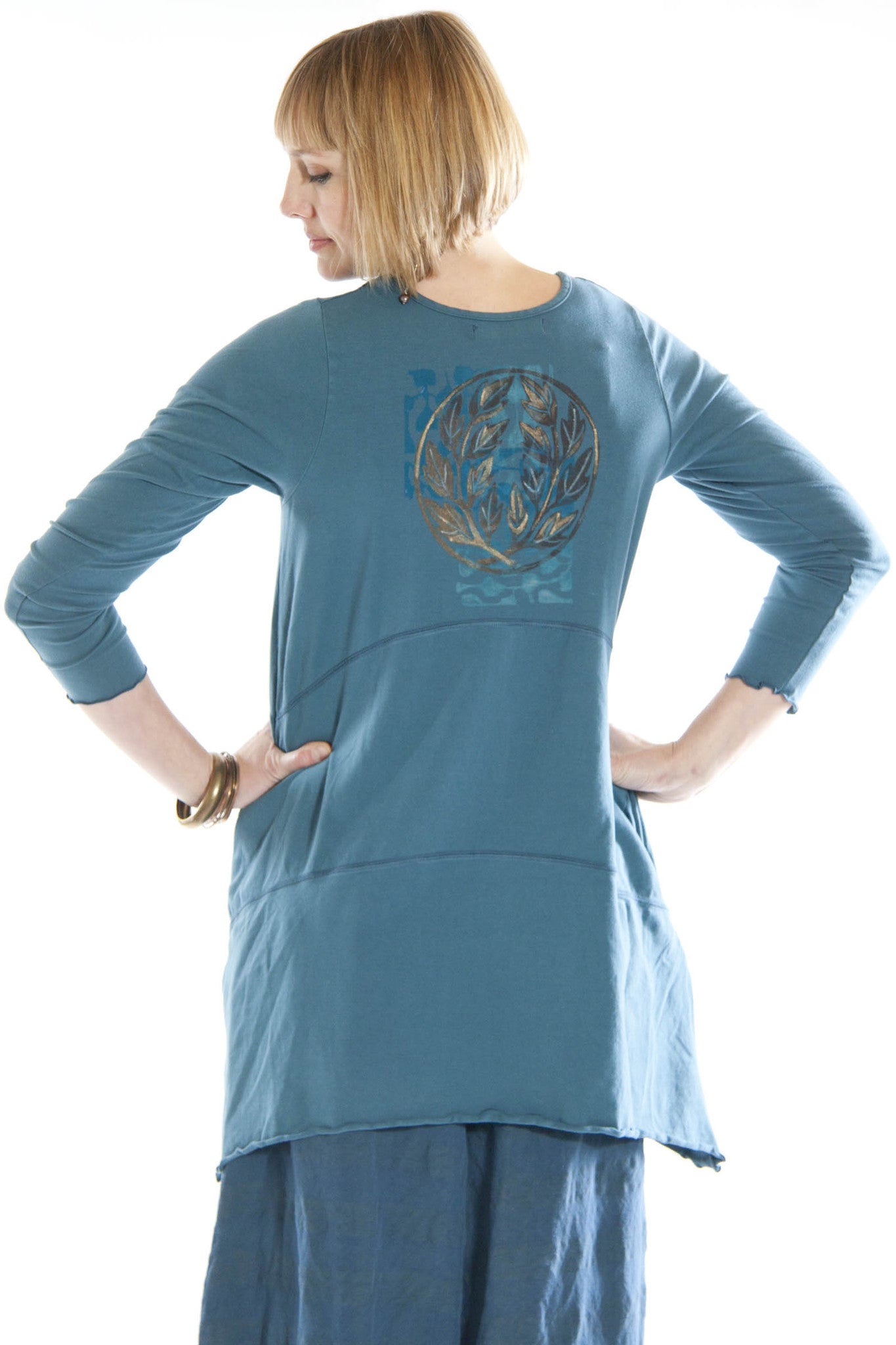A variation of our best selling Shape Dress this tunic is easy-wear, easy-care cotton with a touch of spandex. A great three-season tunic/dress, just layer it differently for the level of warmth you need. Unprinted, this makes a bold solid color to which you can add exciting accessories. Printed, it completely turns your tunic into art. Two side pockets.