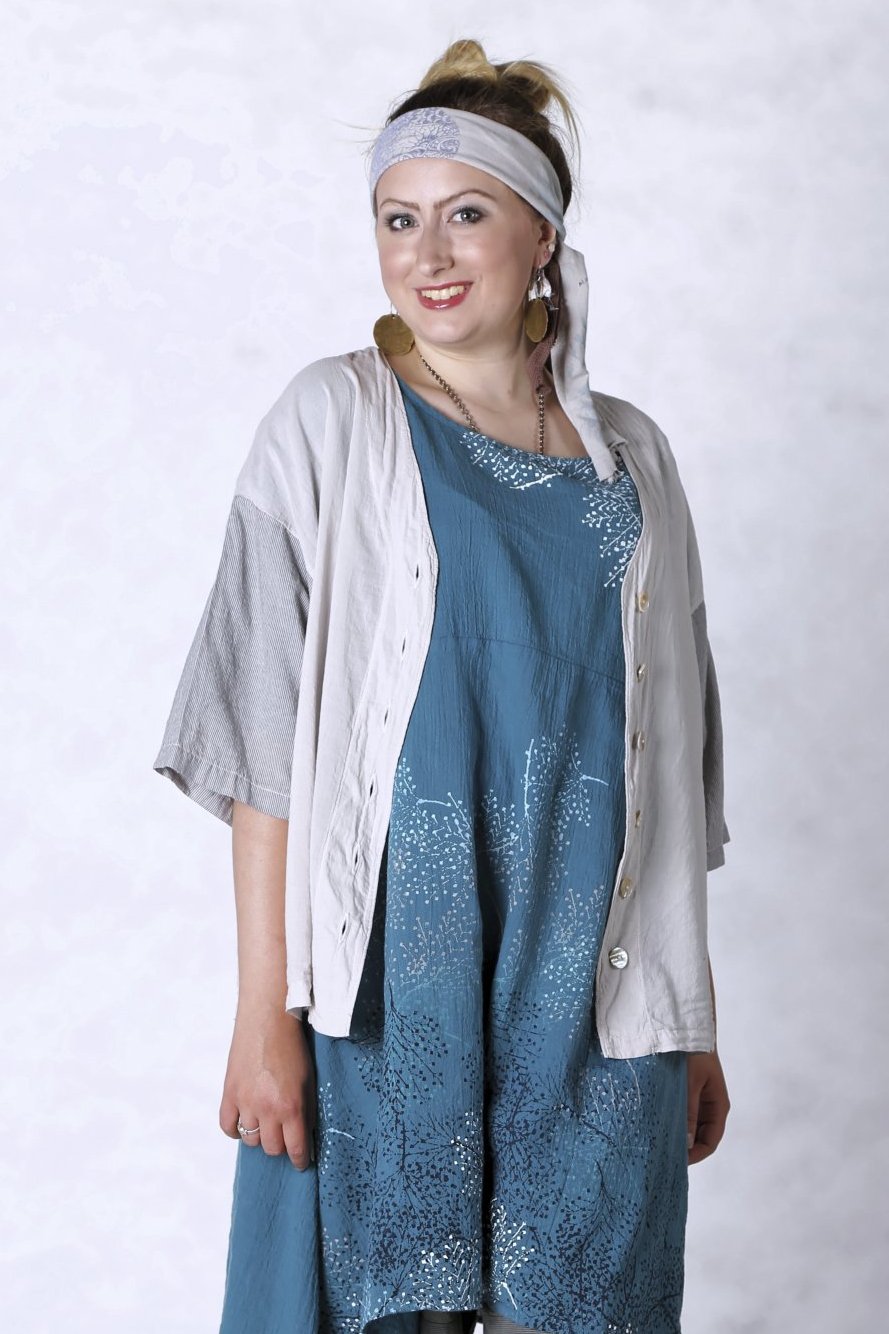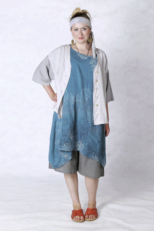 This top is made from a lightweight hemp organic cotton blend with a mini stripe woven in, combined with lightest cotton lawn. Airy and cool, an easy piece to layer over the Venetian Tunic as a cardi or wear it alone as a top with pants or a skirt. Coordinates well with everything from this collection.