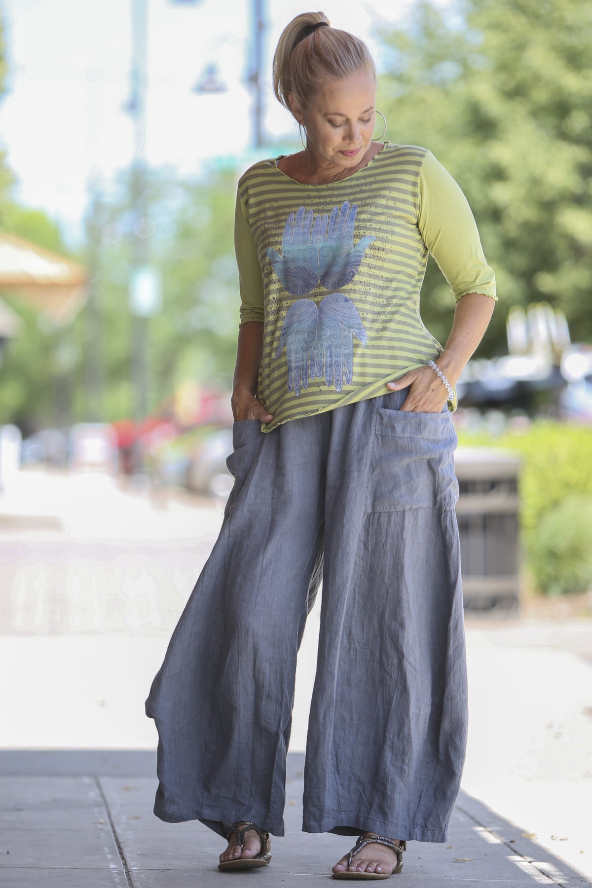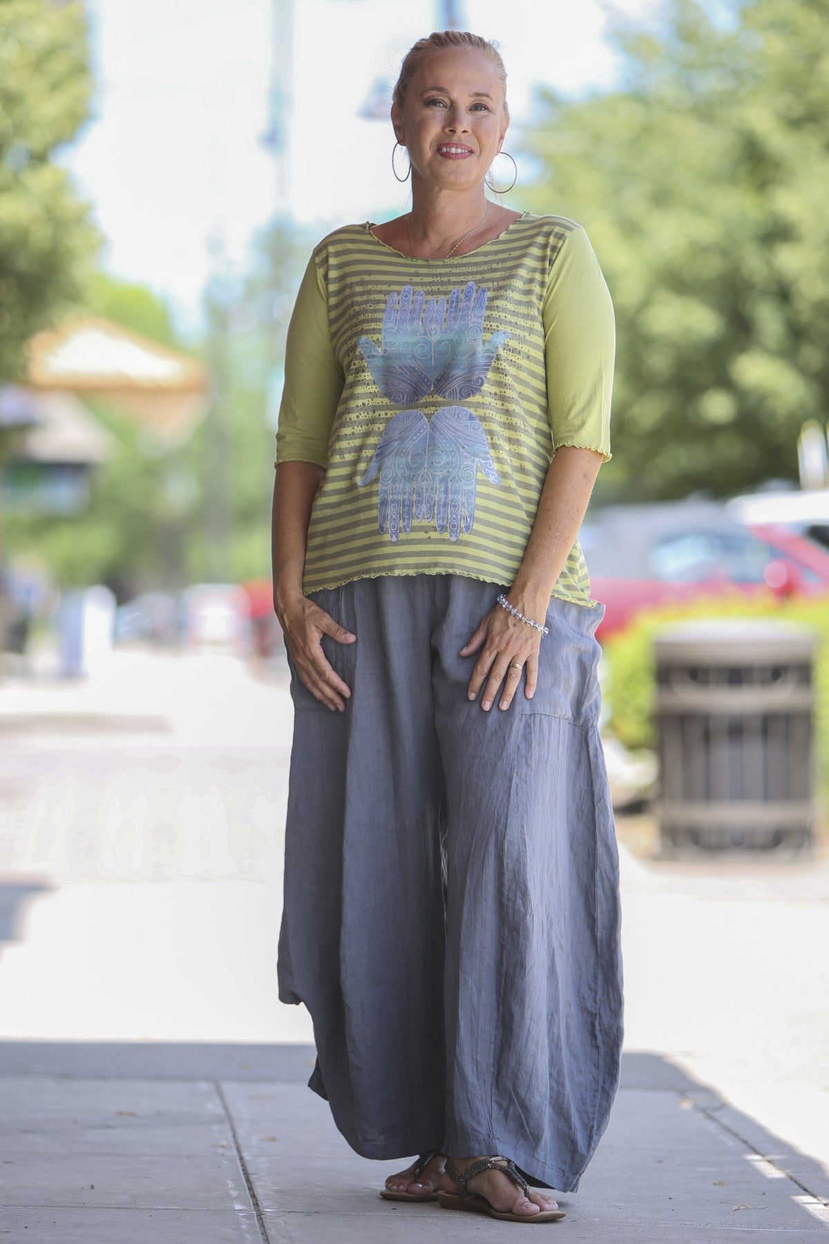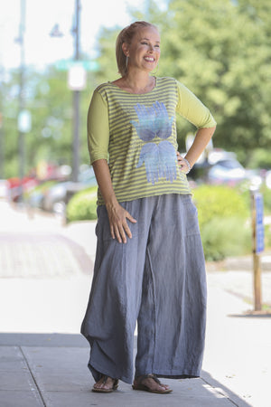 the purpose of these lightweight cotton tops is twofold: use them as a layer under your sleeveless shifts, jumpers, or wear as a tee with practically any skirt or pant. This is a basic wardrobe piece that we think is perfect. A relaxed neckline, sleeves just past the elbow, lightweight and comfortable striped fabric in a soft knit.