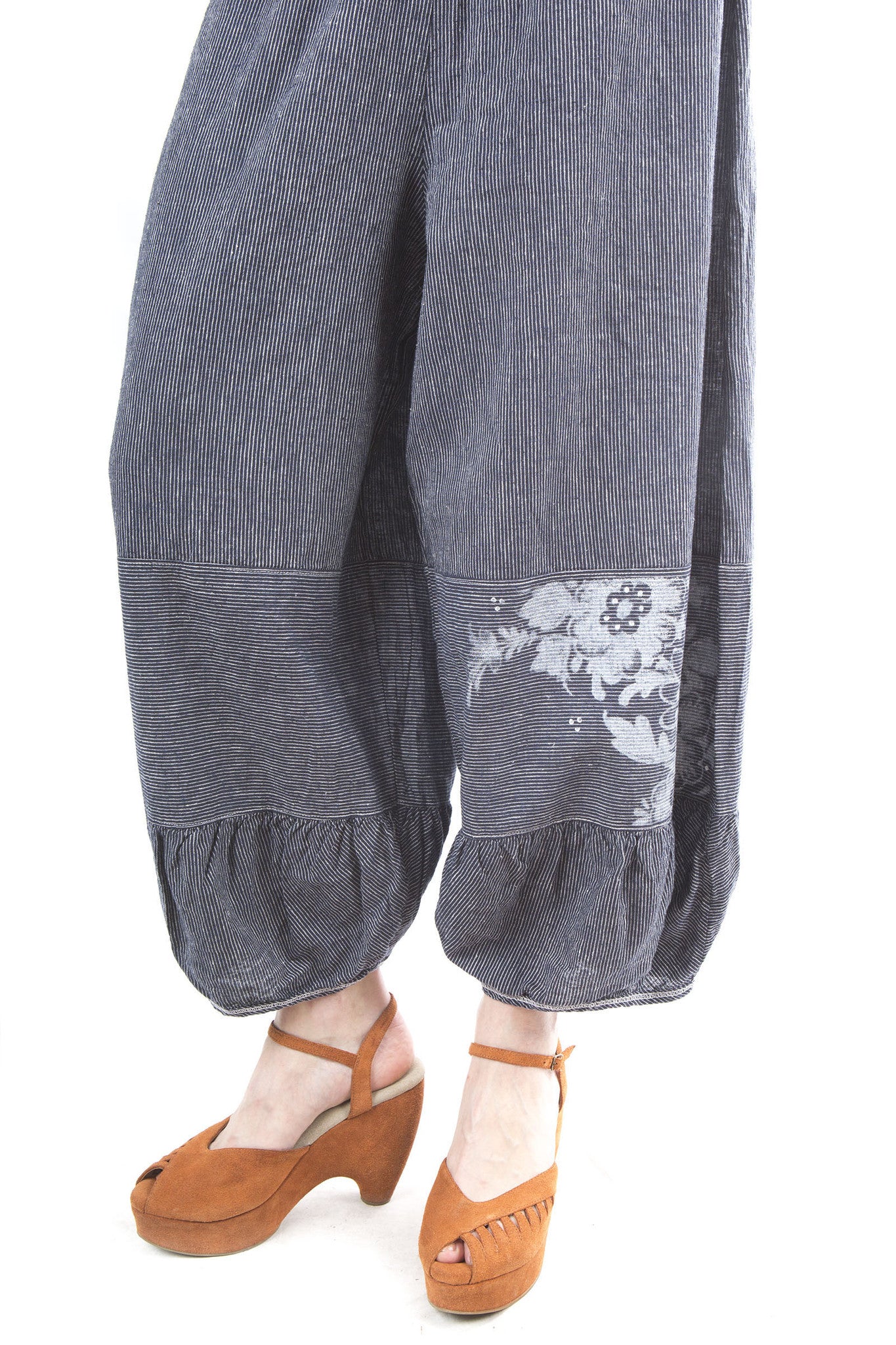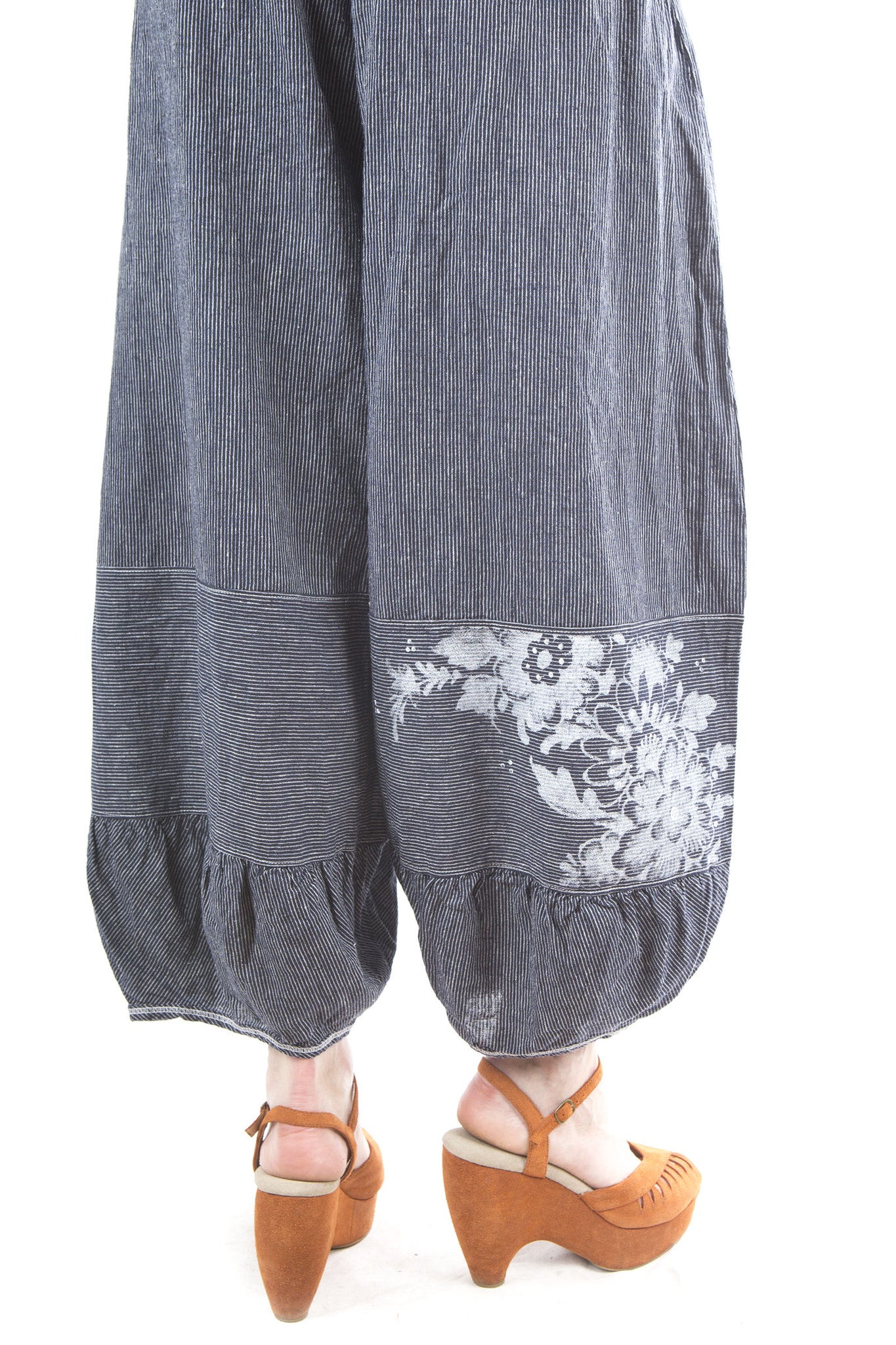These Meadow Pants are fun to wear anywhere! The is the same beloved cotton voile pant our customers ask for every summer! The woven stripe, and full leg with gathered hem at the ankle and hand print create a fun boho look. A must-have!