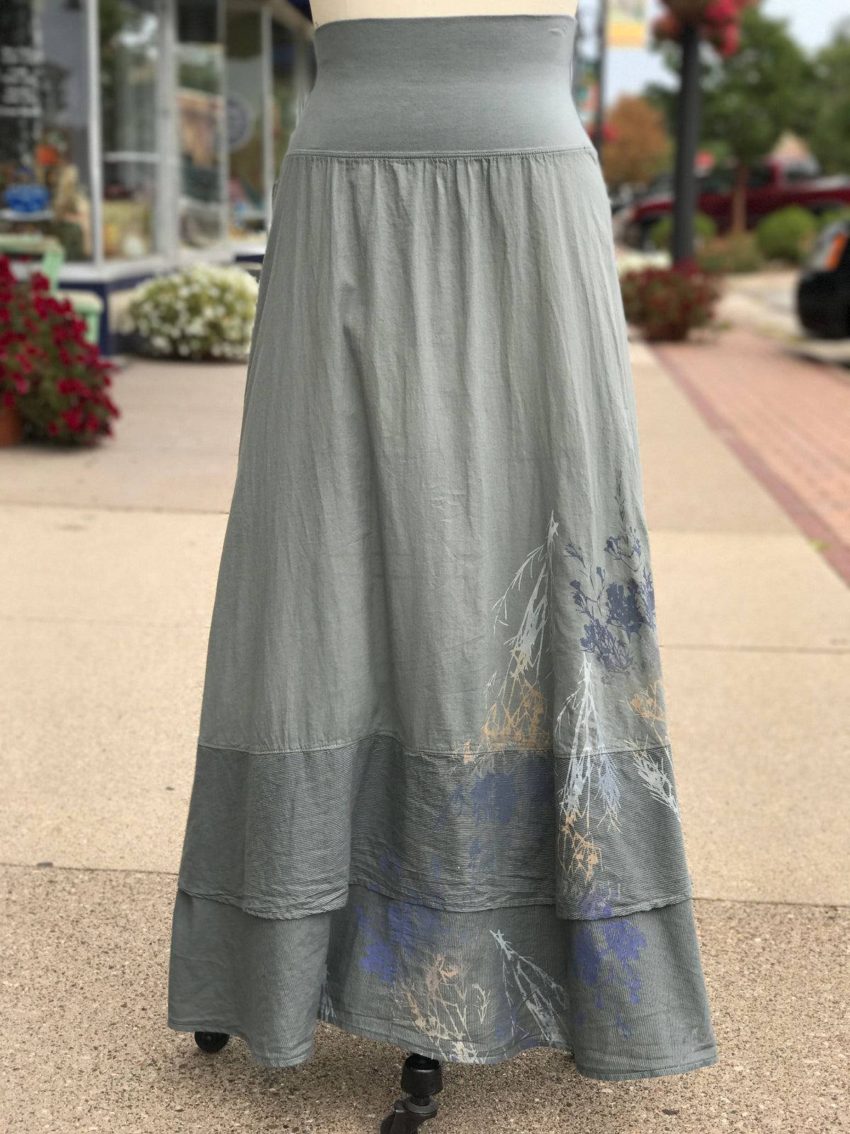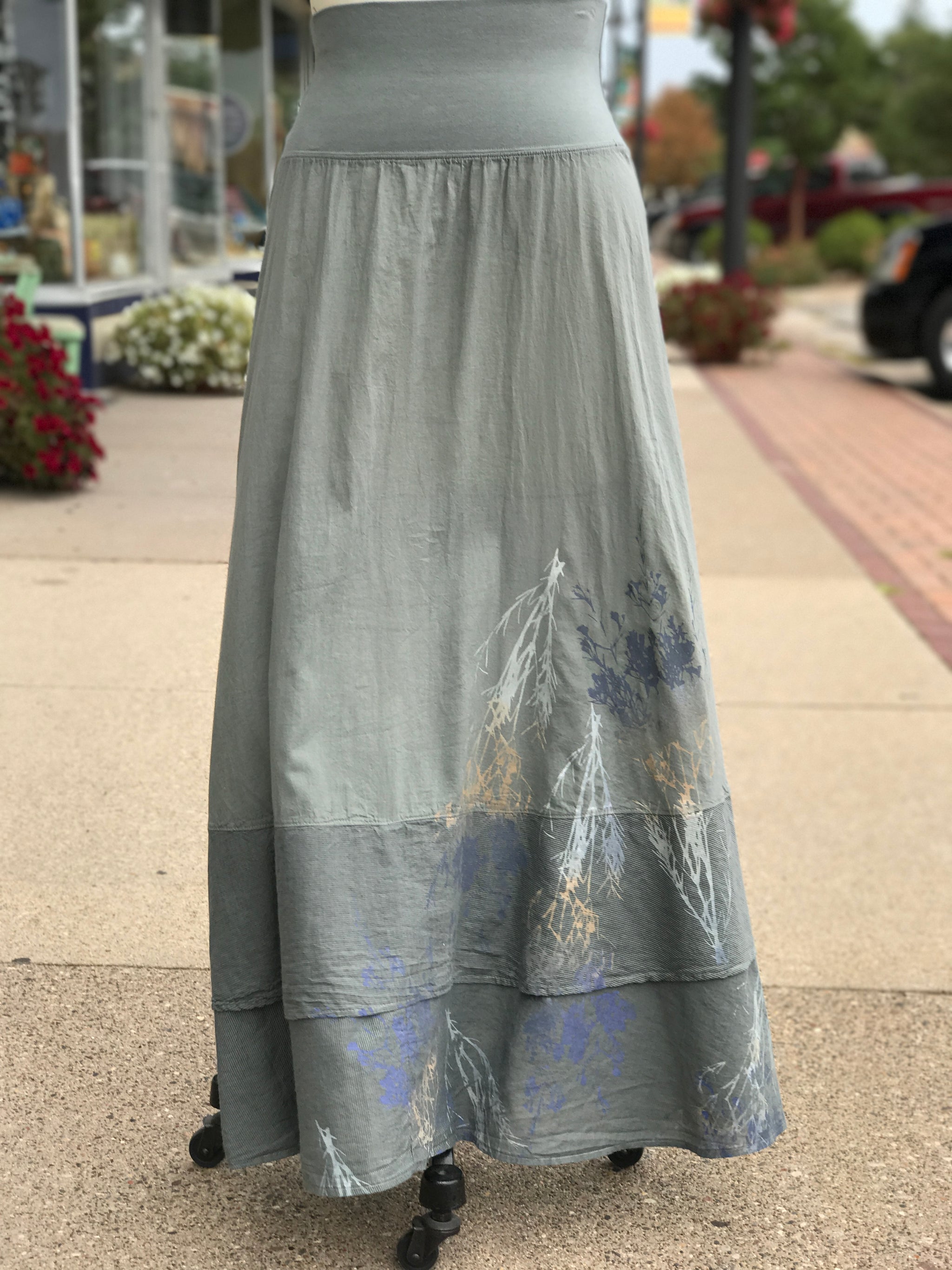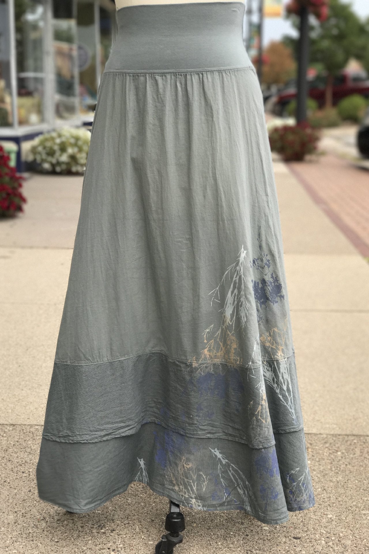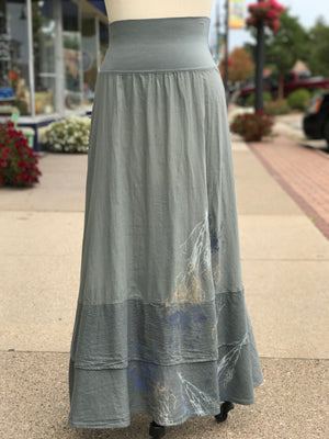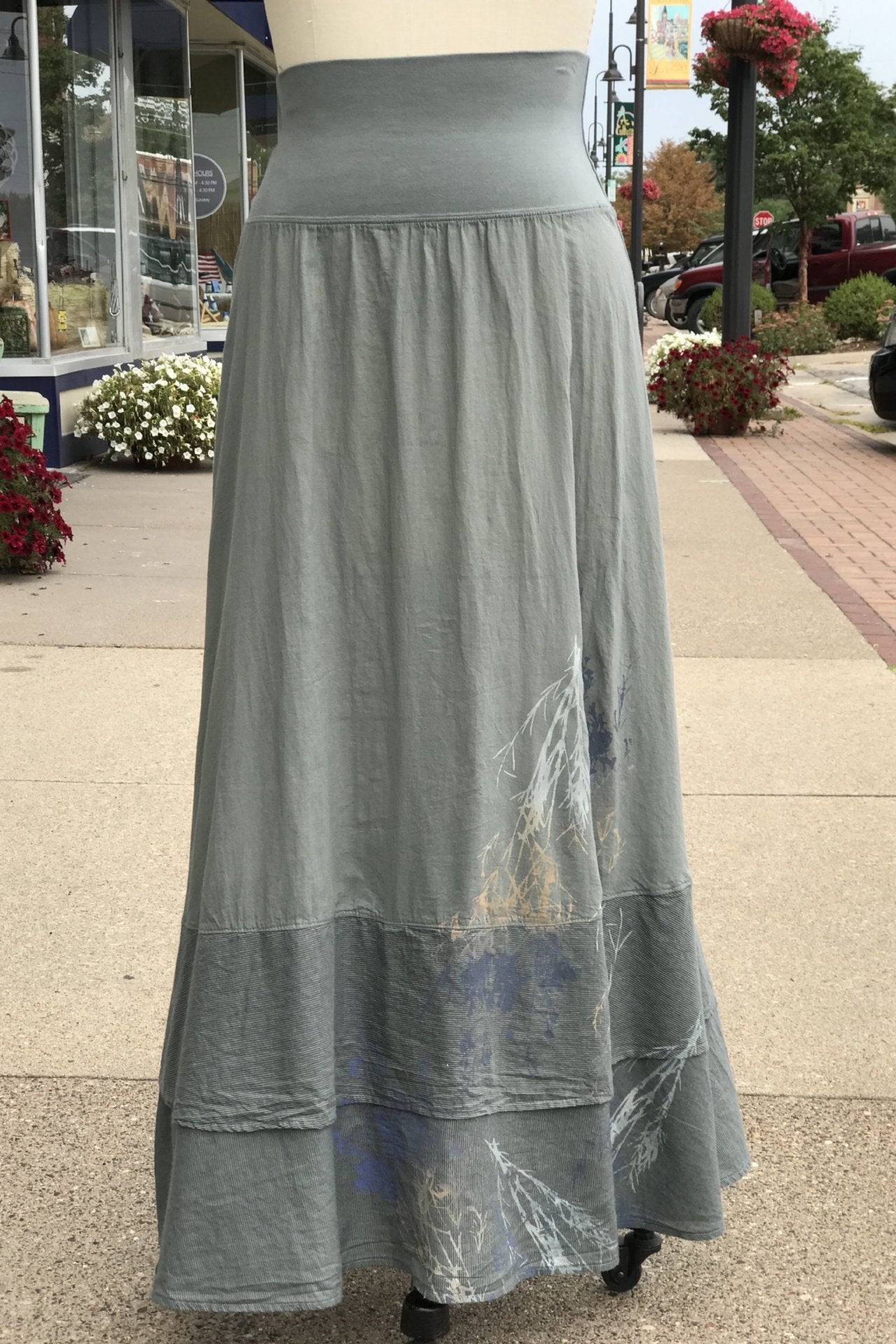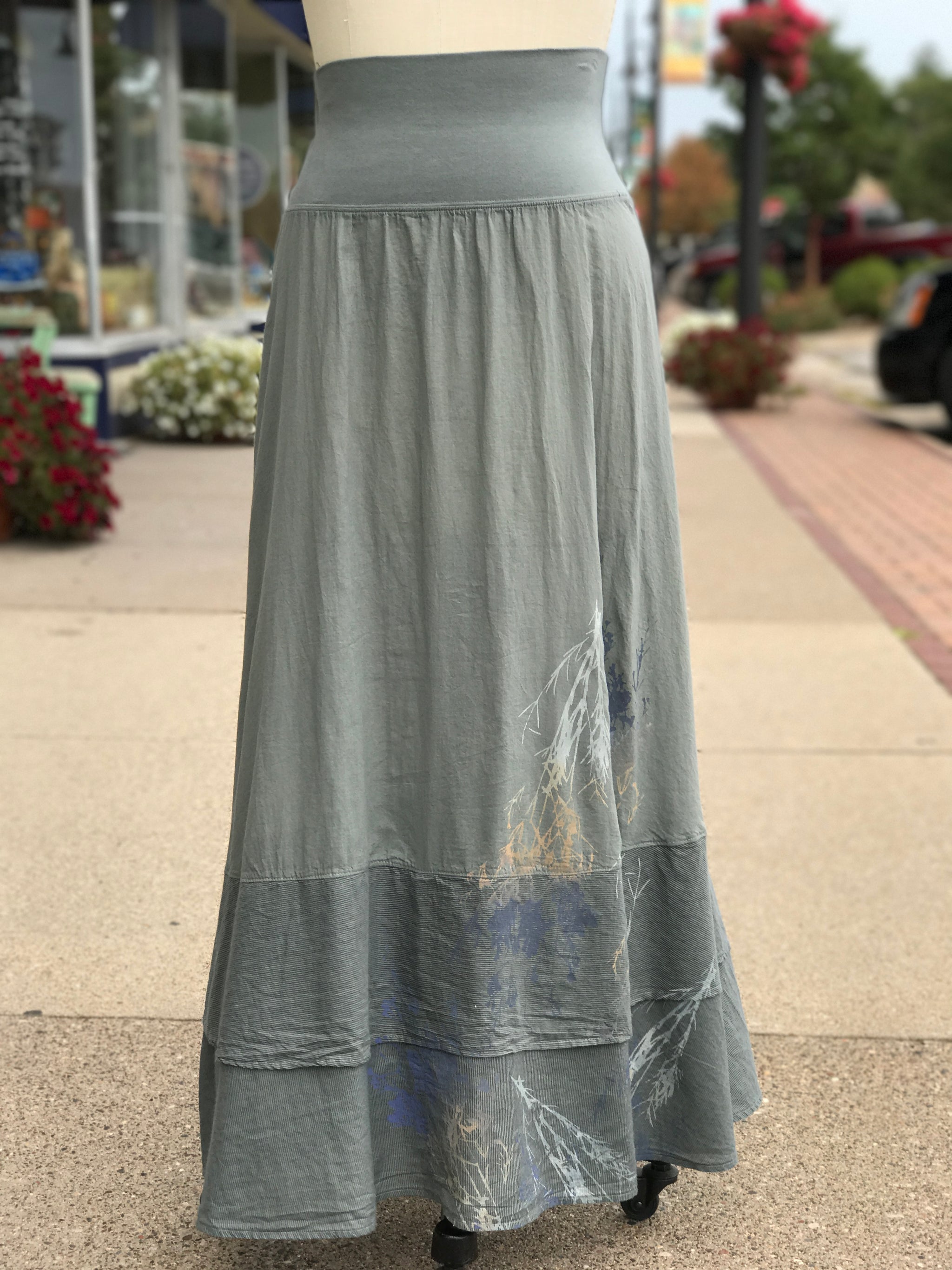 This skirt hardly needs explanation. We love it. You'll love it. Period. Goes with everything. But just in case you want to know more . . . It has two tiers of lightweight cotton lawn, finished with an organic cotton mini striped voile fabric to add visual appeal and interest. The doubled organic cotton-lycra stretchy waistband allows the fit and length to easily be adjusted for the most comfort. This waistband can work on everyone.