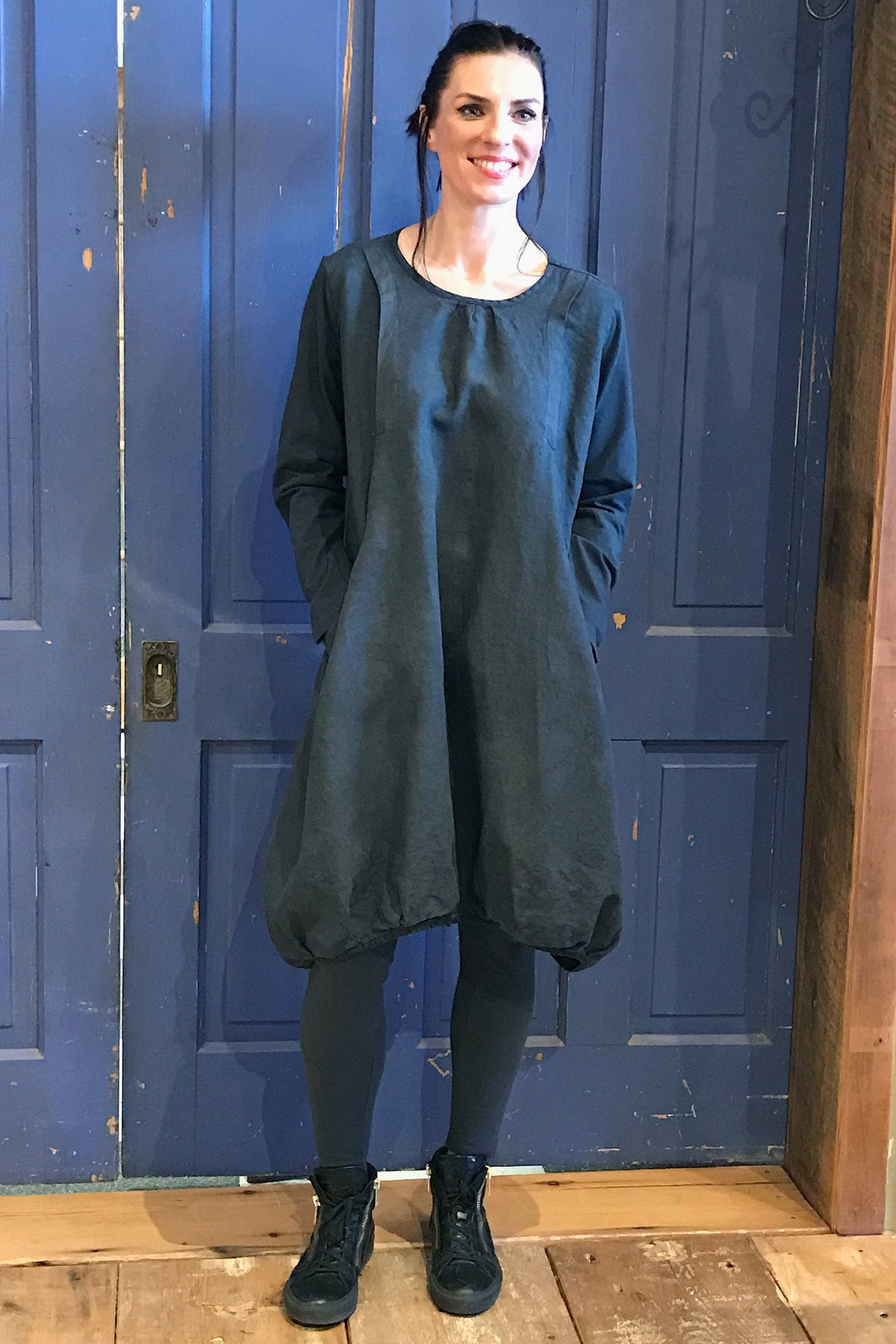A new style, year round dress made in a heavier weight linen, with sleeves of organic cotton lycra which give comfort and a bit of stretch.