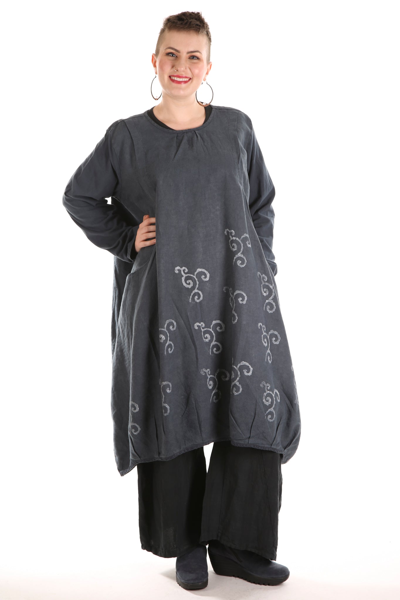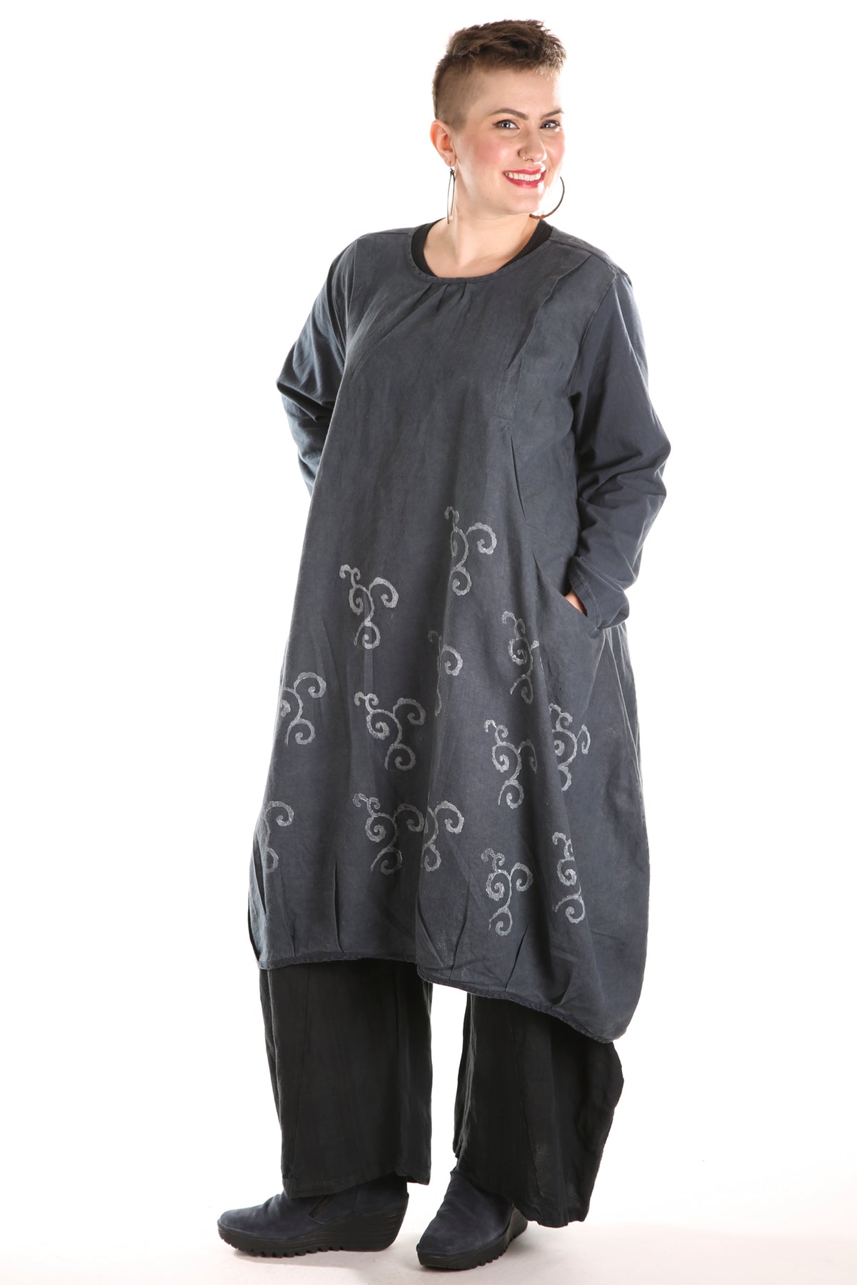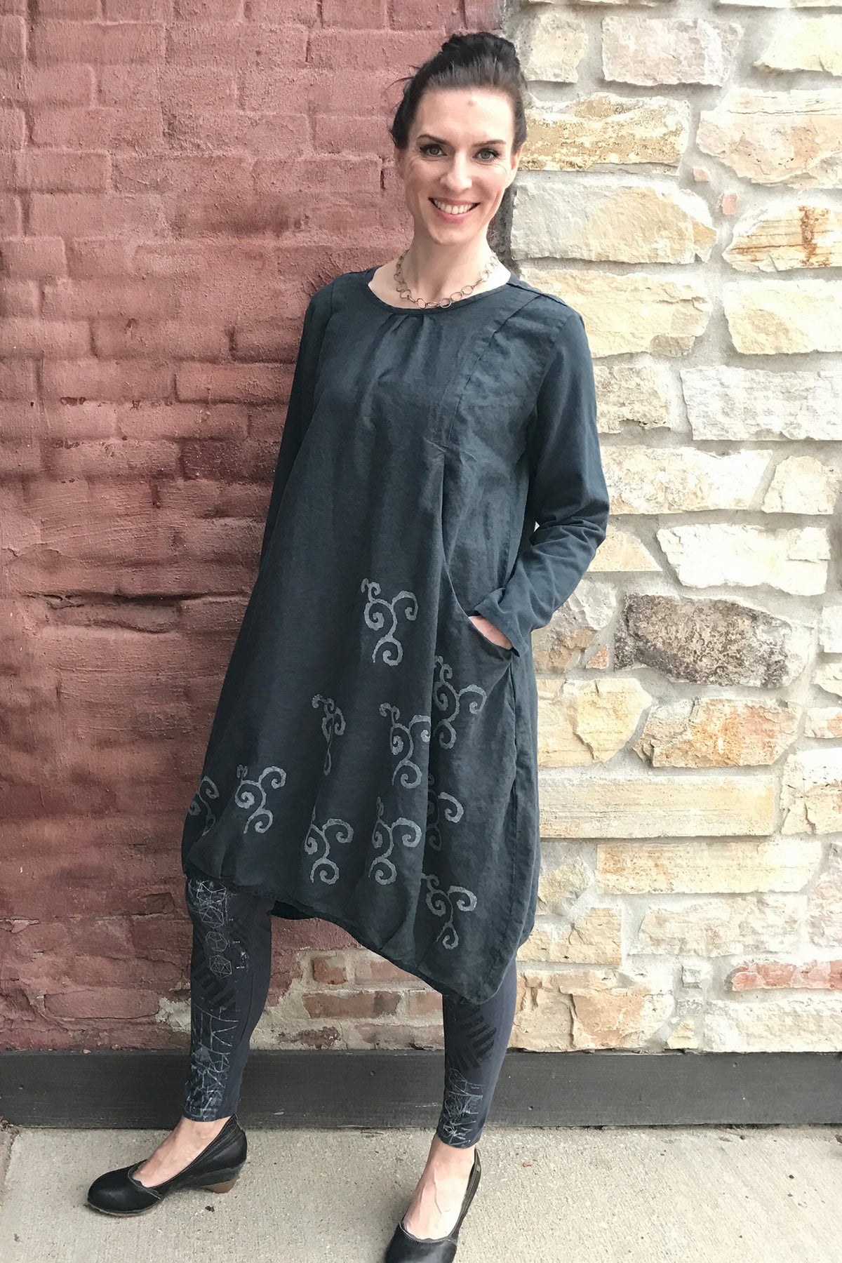 A new style, year round dress made in a heavier weight linen, with sleeves of organic cotton lycra which give comfort and a bit of stretch.