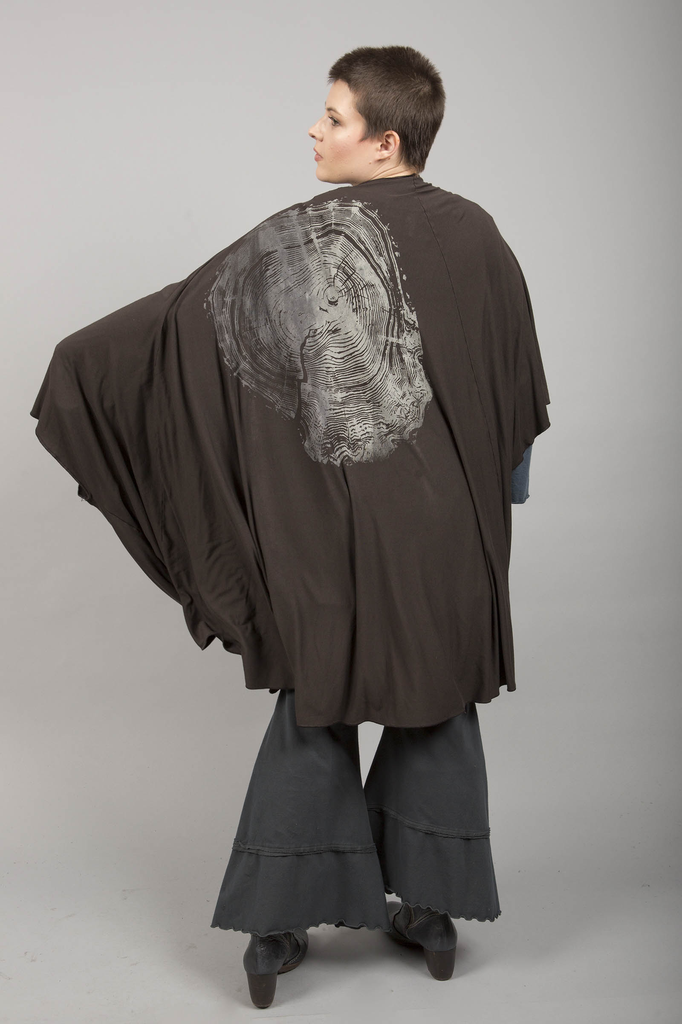 With flowing, elegant lines, this softest rayon kimono adds a layer of romance to any outfit. This beautiful piece layers easily, with a generous shape, wide sleeve and elliptical hemline. The artful hand printed designs are inspired by the crystalline and molecular structures of rare-earth minerals. Easily packable, this is a must-have piece for travel, whether it's to the local gallery or around-the-world!