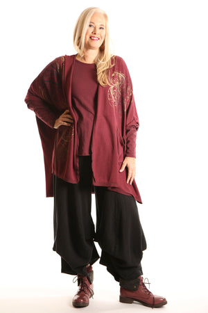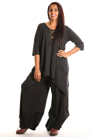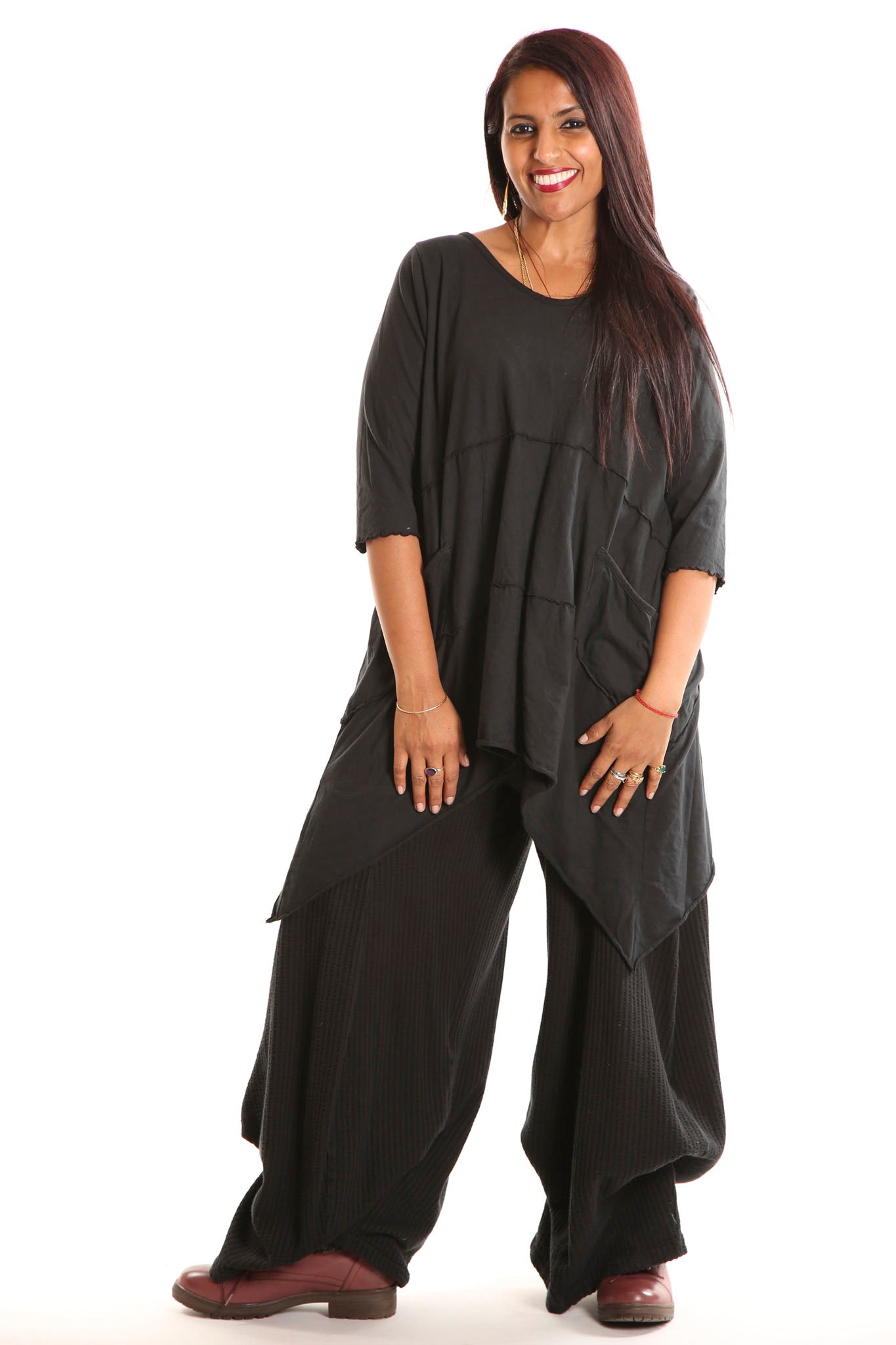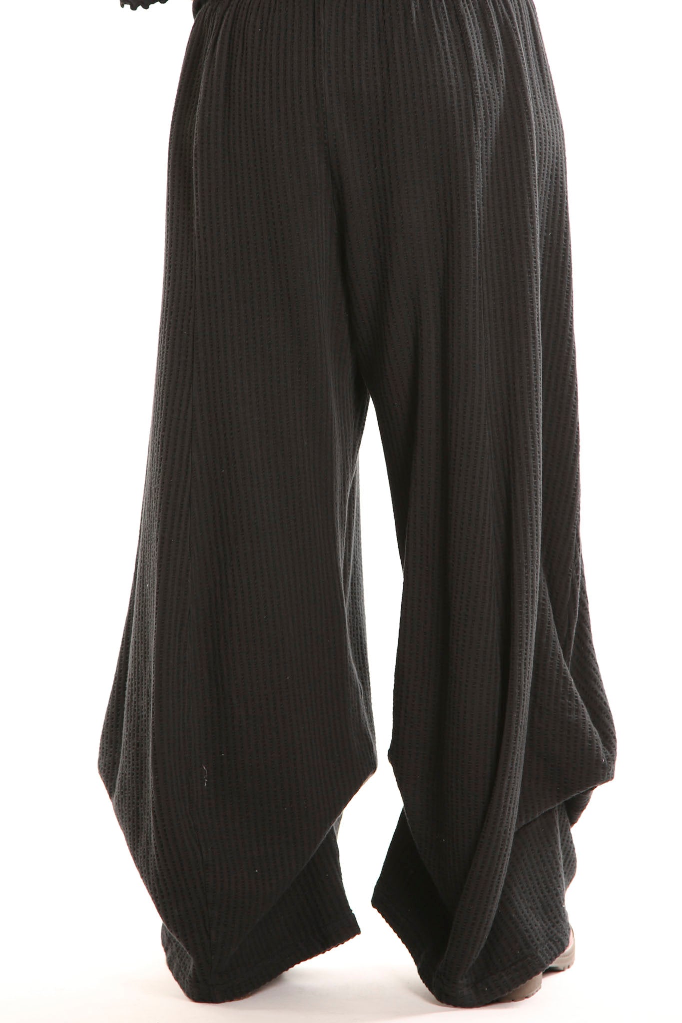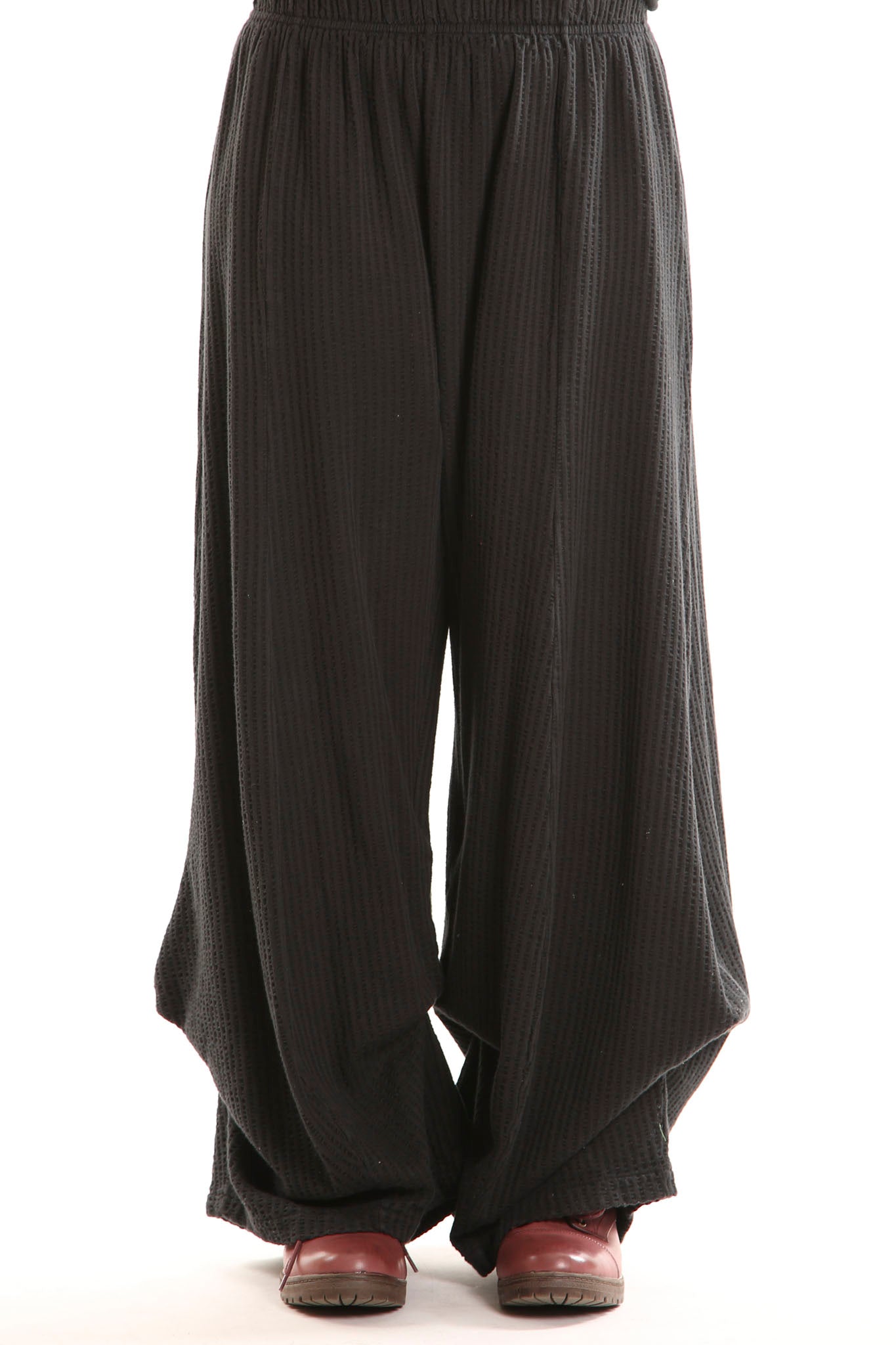 A favorite style, wide legged and long with hidden ties inside to drape up and drape/shorten the sides. Excellent for tall people when un-draped and equally great for those not-as-tall. Can be draped on both the inner and outer leg (or not at all ) to create different looks. The knit texture is wonderfully NEW to us! A knit-in texture of seersucker pucker-stripe adds interest. 2" waistband.