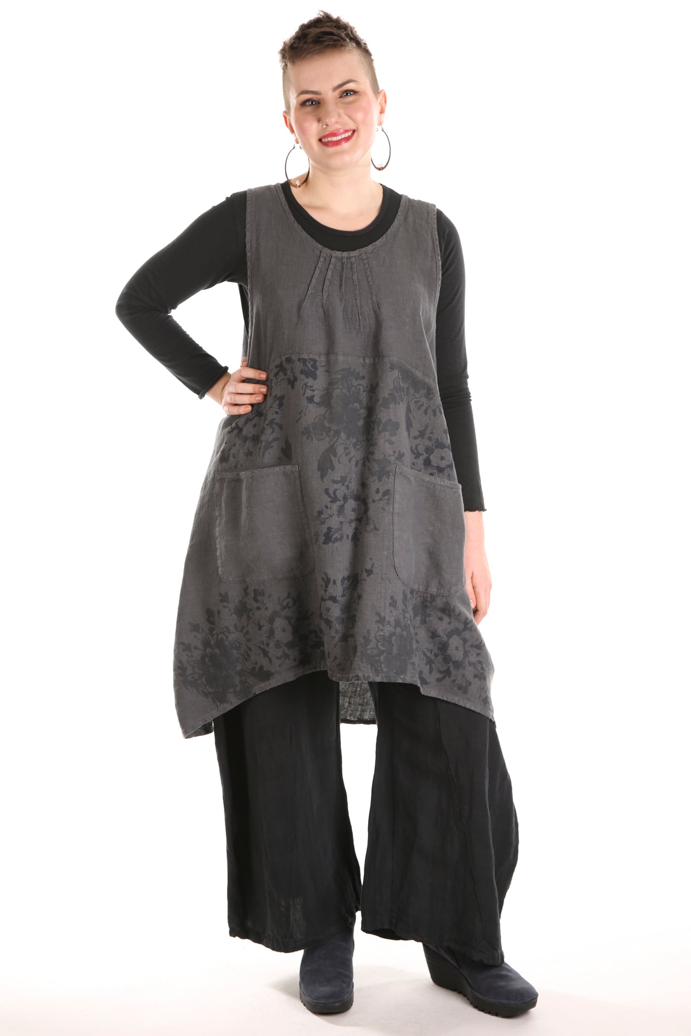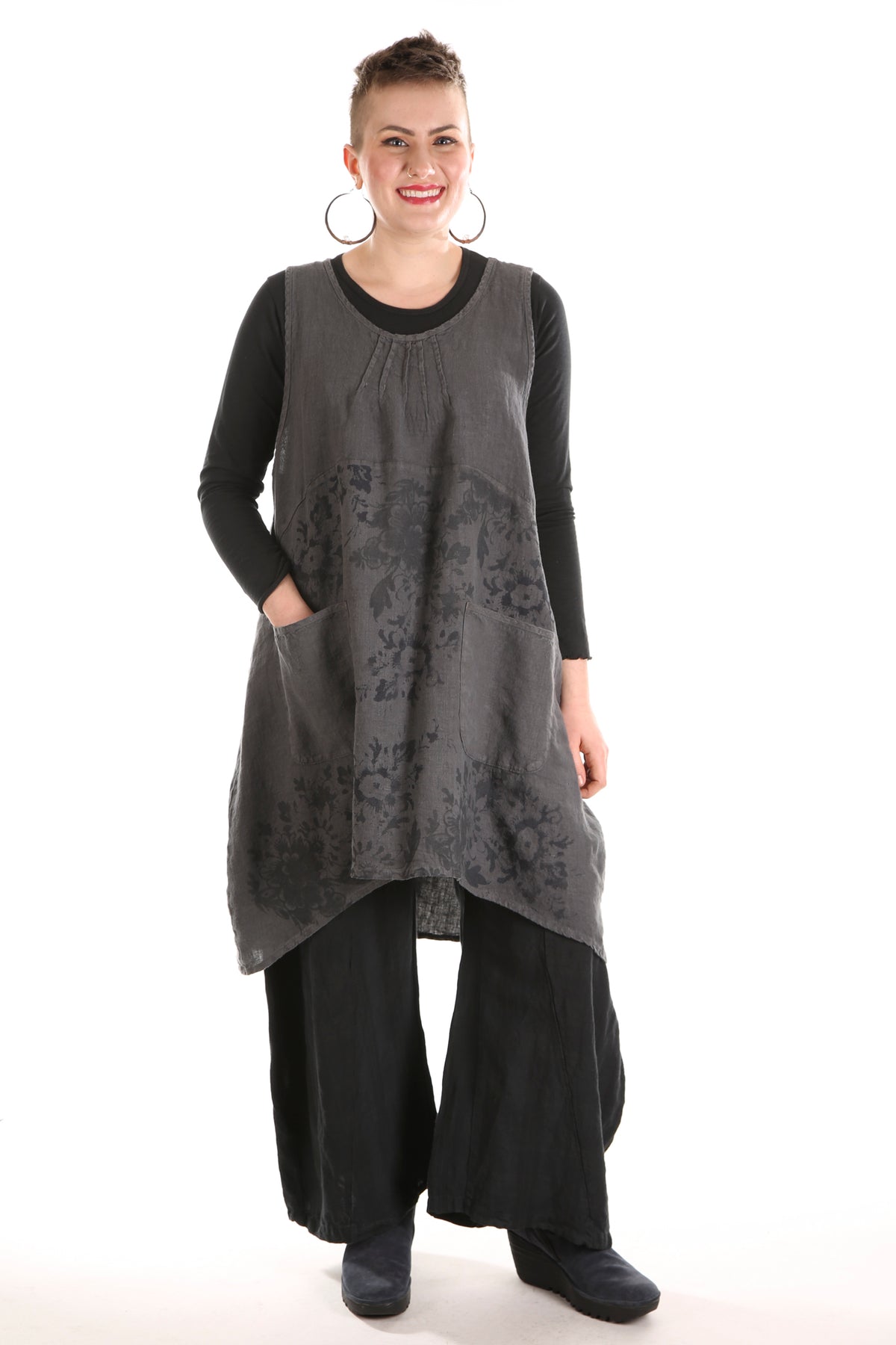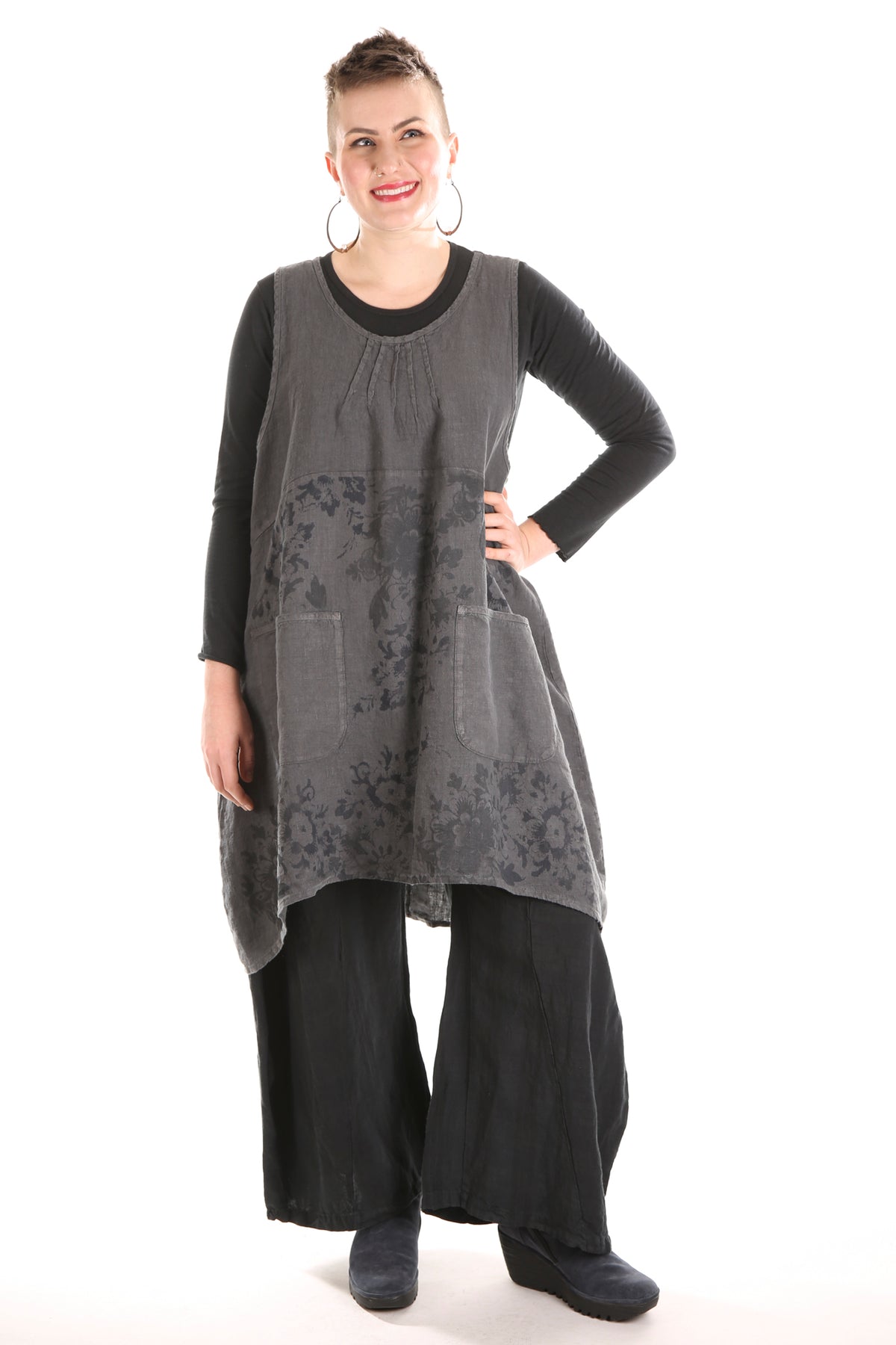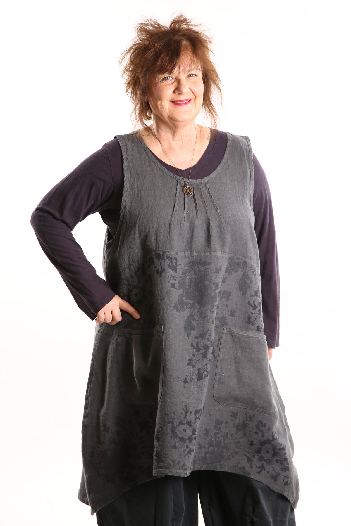 A beautiful mid-weight linen jumper to dress up any outfit. The delicate pin tucks, curved hemline, and patch pockets add to the perfectly flattering A-line shape. Hand printed with dark ink black floral, so it mixes easily with anything black. 100% mid-weight linen, pre-shrunk
