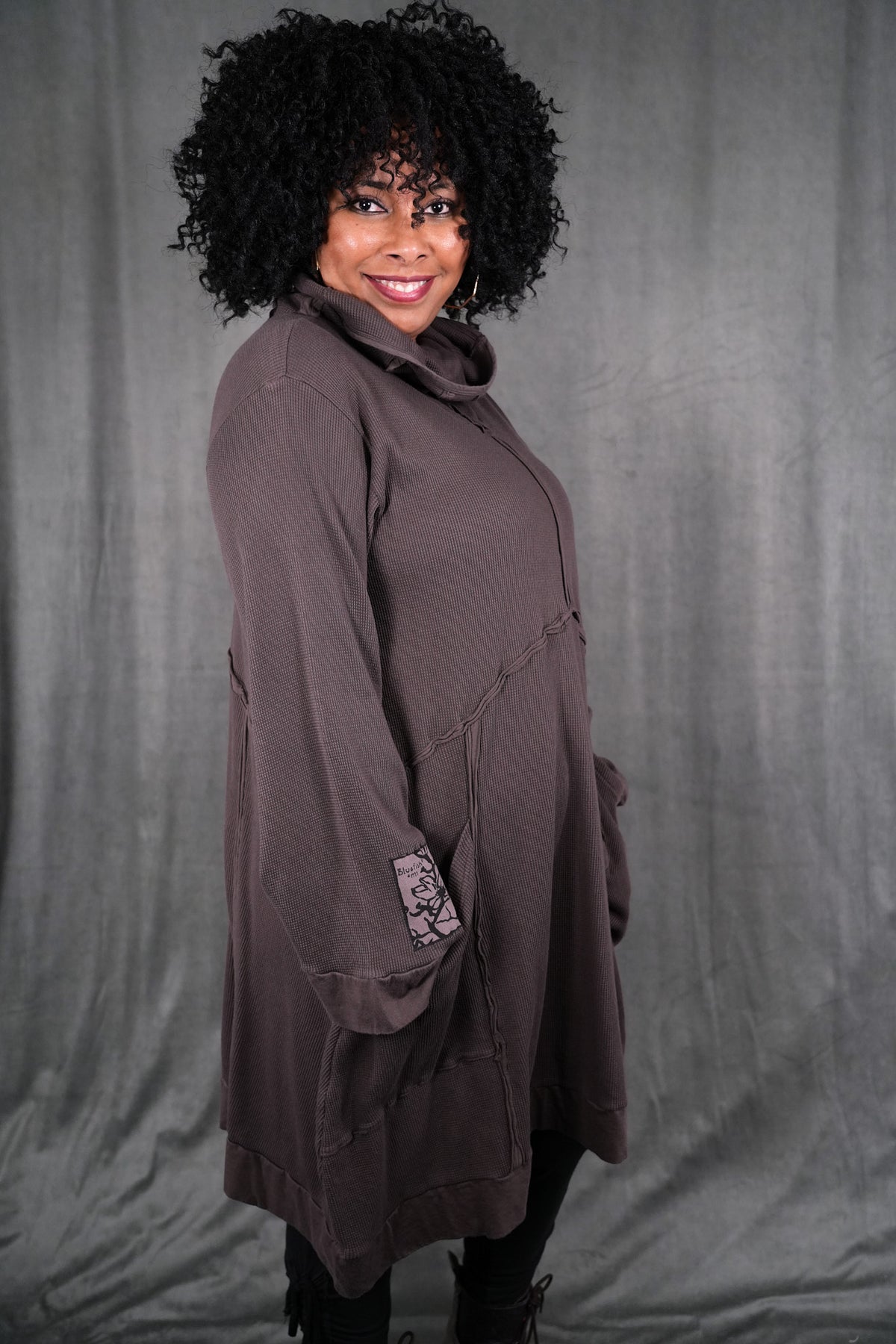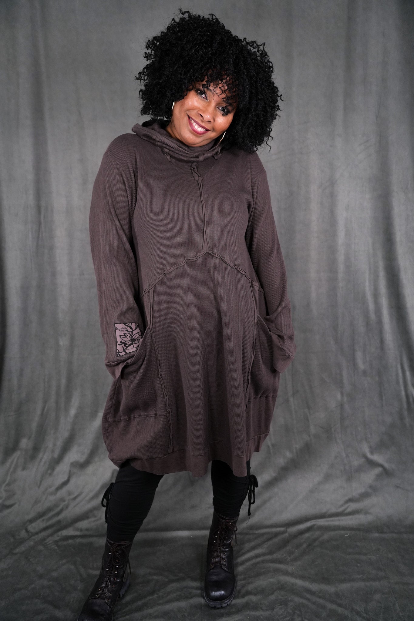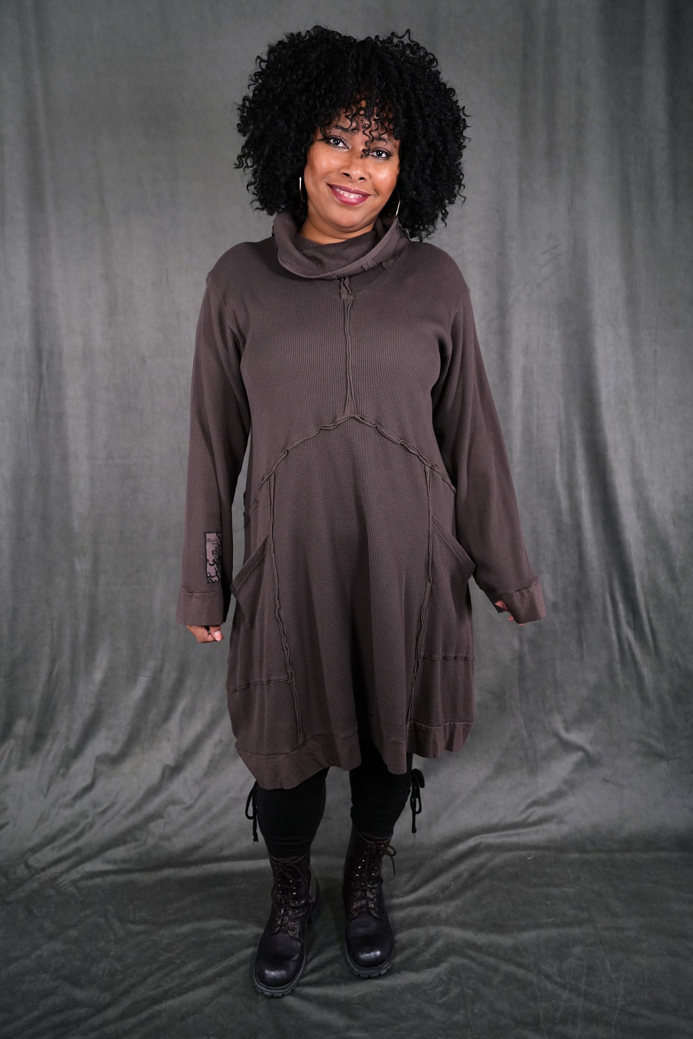 Vintage 1999 patch on sleeve. color Italian Umber. Our best and most fun to wear piece for the heart of winter; one that you reach for time and time again. An oversized long thermal tunic dress with inside out roll to raw seaming and deep pockets, an extra wide high neck and wide sleeves so that you can easily layer this over other pieces to keep warm & feel cozy. blue fish patch! don't miss out.