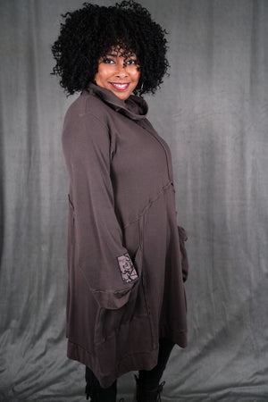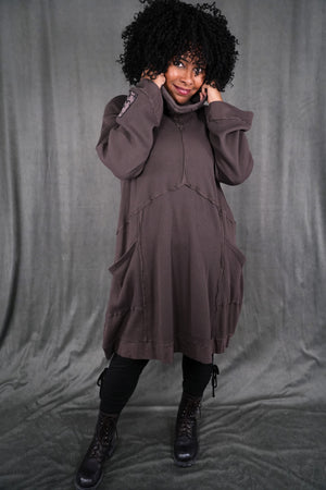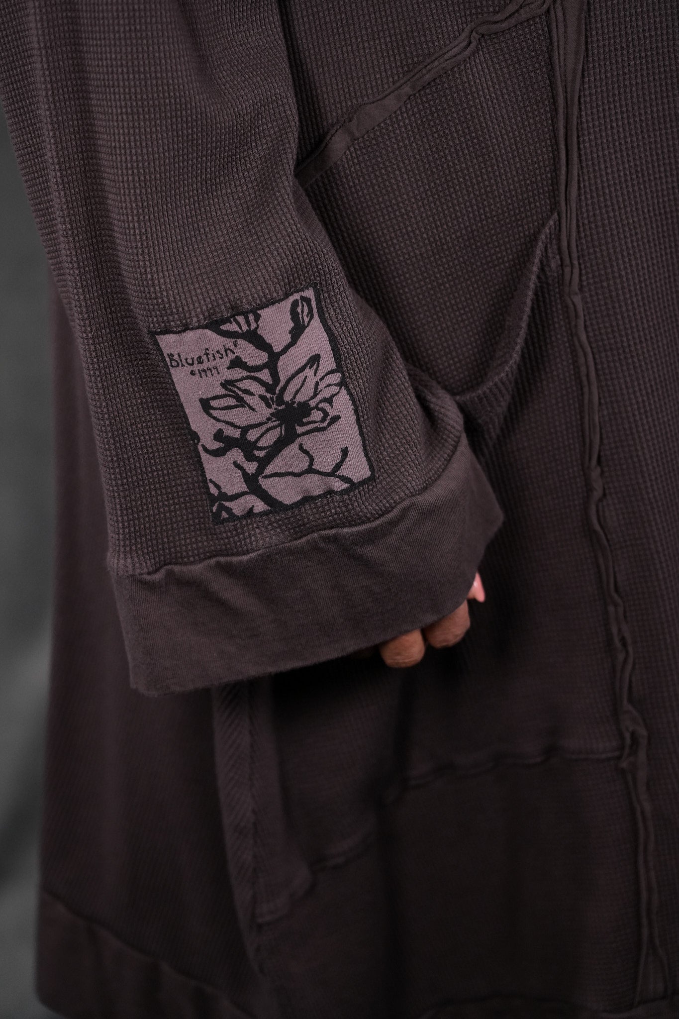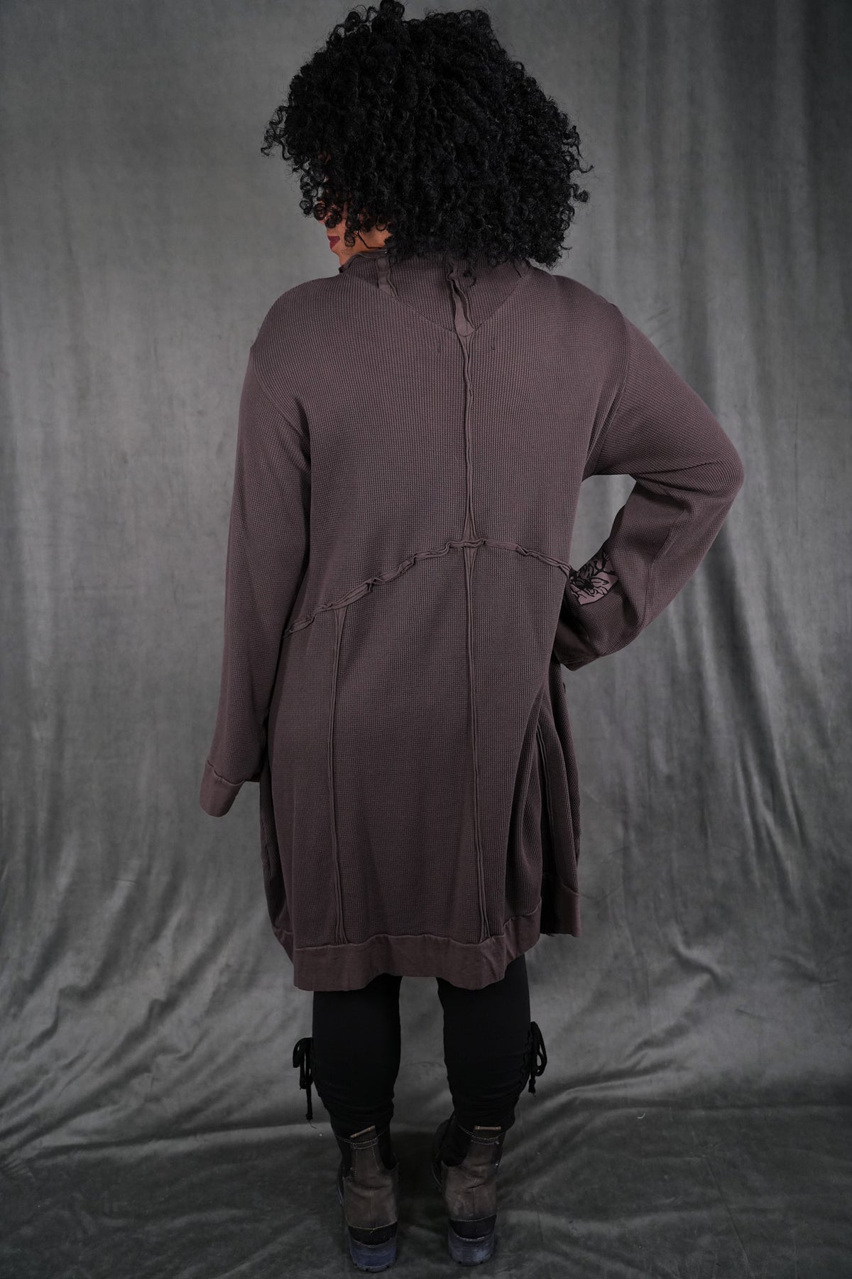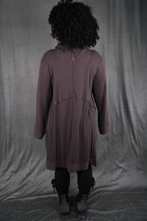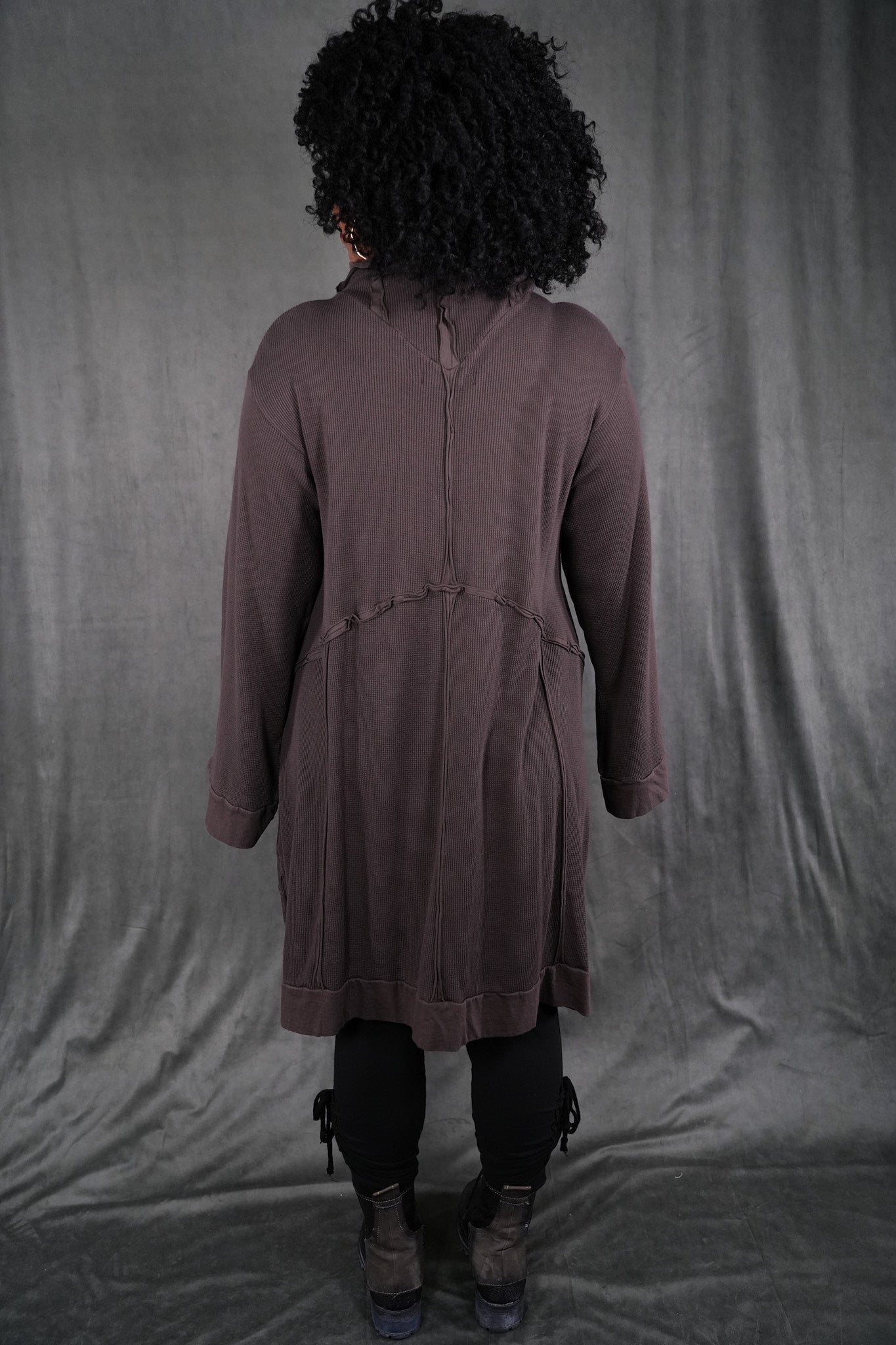 Vintage 1999 patch on sleeve. color Italian Umber. Our best and most fun to wear piece for the heart of winter; one that you reach for time and time again. An oversized long thermal tunic dress with inside out roll to raw seaming and deep pockets, an extra wide high neck and wide sleeves so that you can easily layer this over other pieces to keep warm & feel cozy. blue fish patch! don't miss out.
