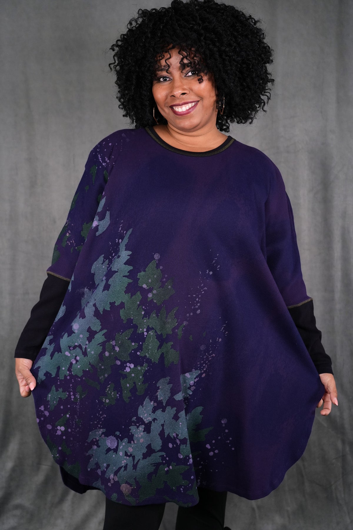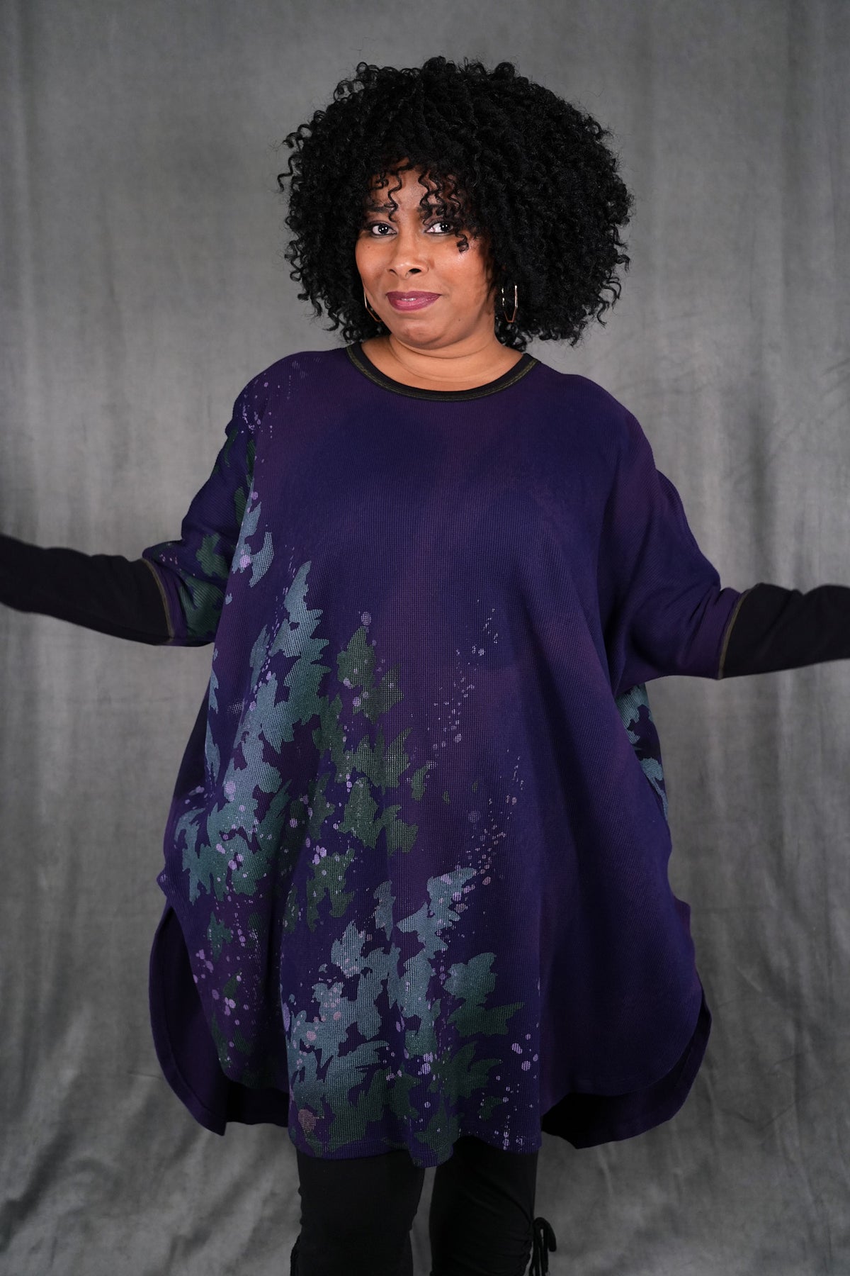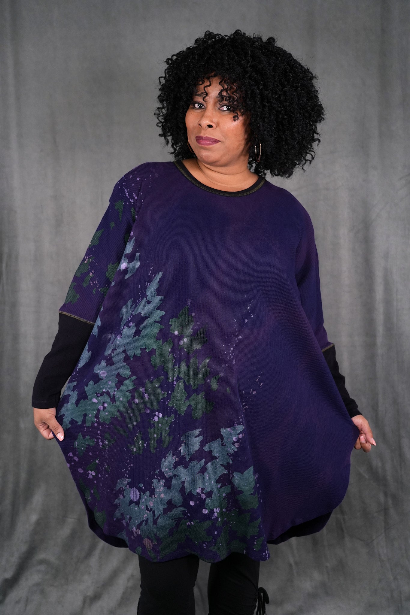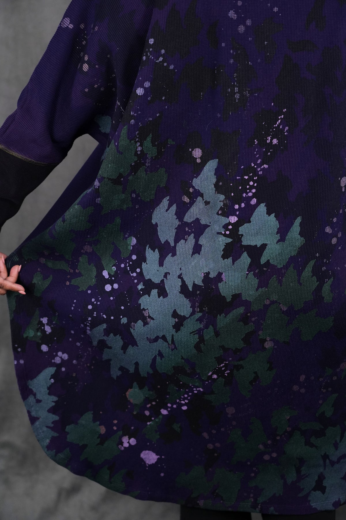 This organic, stylish, one-size, thermal tunic is an instant classic. Color block trimmed at the neck and sleeves with a thick cotton/hemp blend and contrasting thread stitching. Printed with a plethora of layered artful designs from our studio artists... a true work of art! The last of its kind, there will be no more made in its likeness so get it while you can!