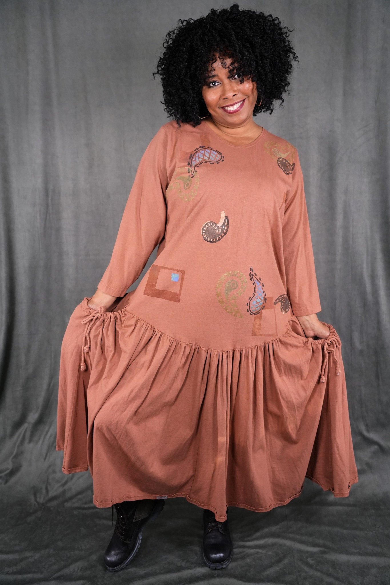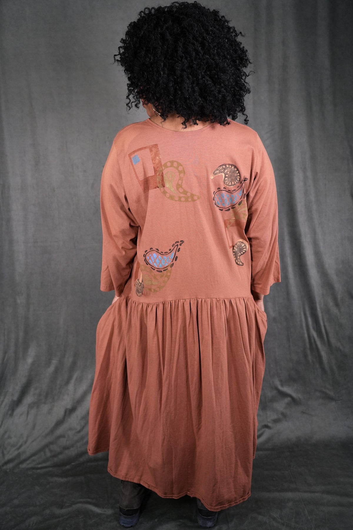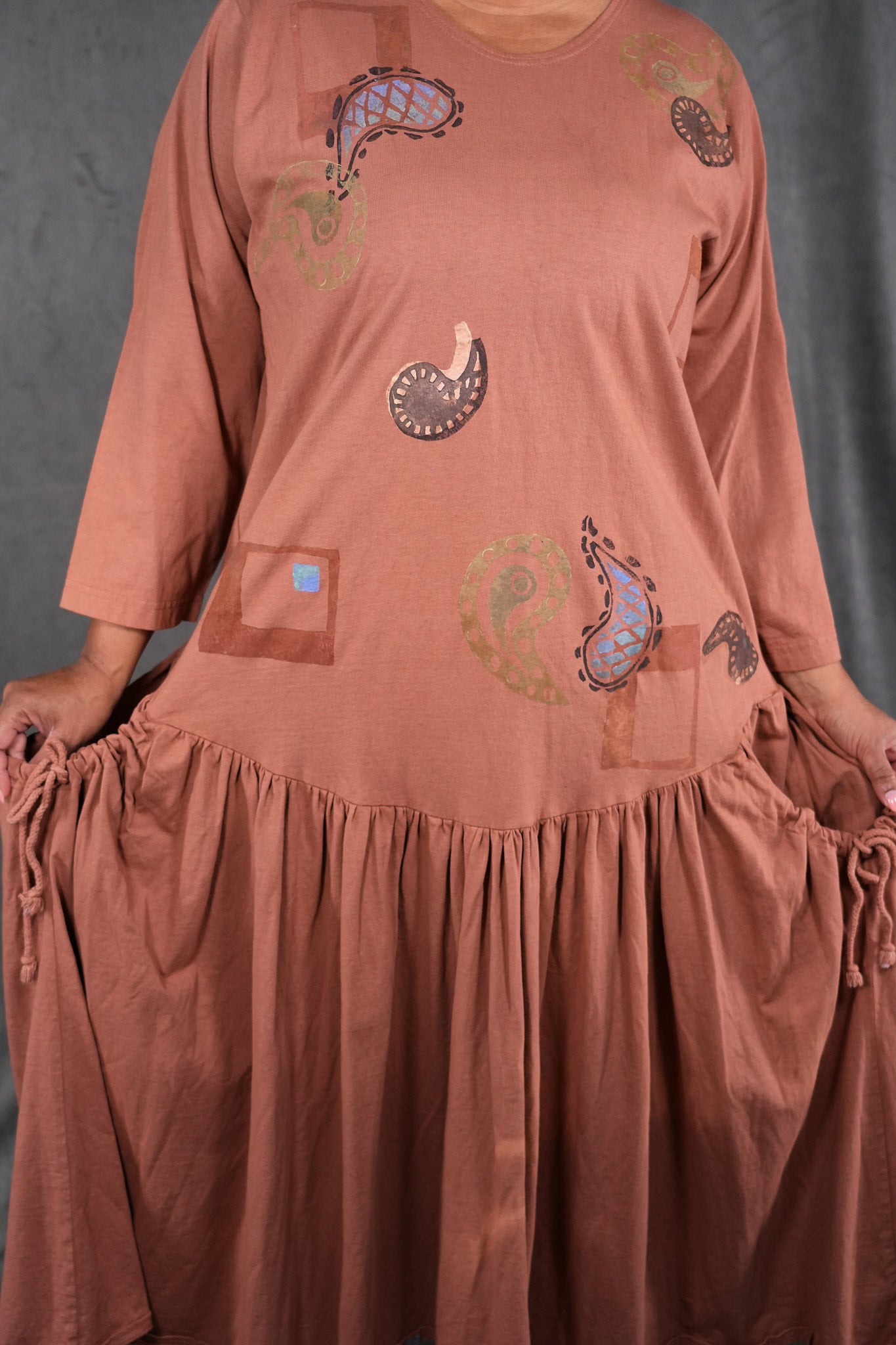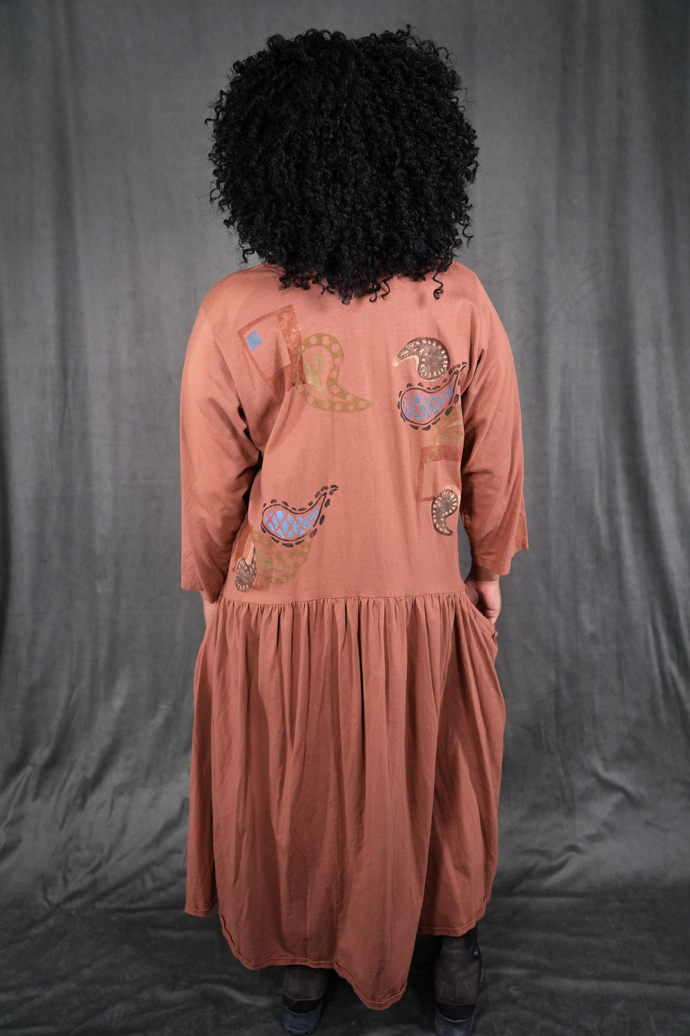 CLASSIC VINTAGE COLLECTOR ITEM 100% cotton jersey with tag that says frenchtown on it. This dress is a long peach colored beauty, with paisley block printed paisley patterns all over the front and back. The top half sports wrist length sleeves, along with a rounded neckline and all of the beautiful prints. The bottom half shows off a frilly and open hem, complete with two medium depth drawstring pockets. this dress is a comfortable and pretty length, and is wonderful for any season! This dress is the last of its kind, a oldy and goldy don't let it slip away! The skirt has some lighter dye areas in the center front they do not detract from its beauty.