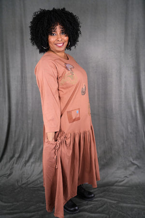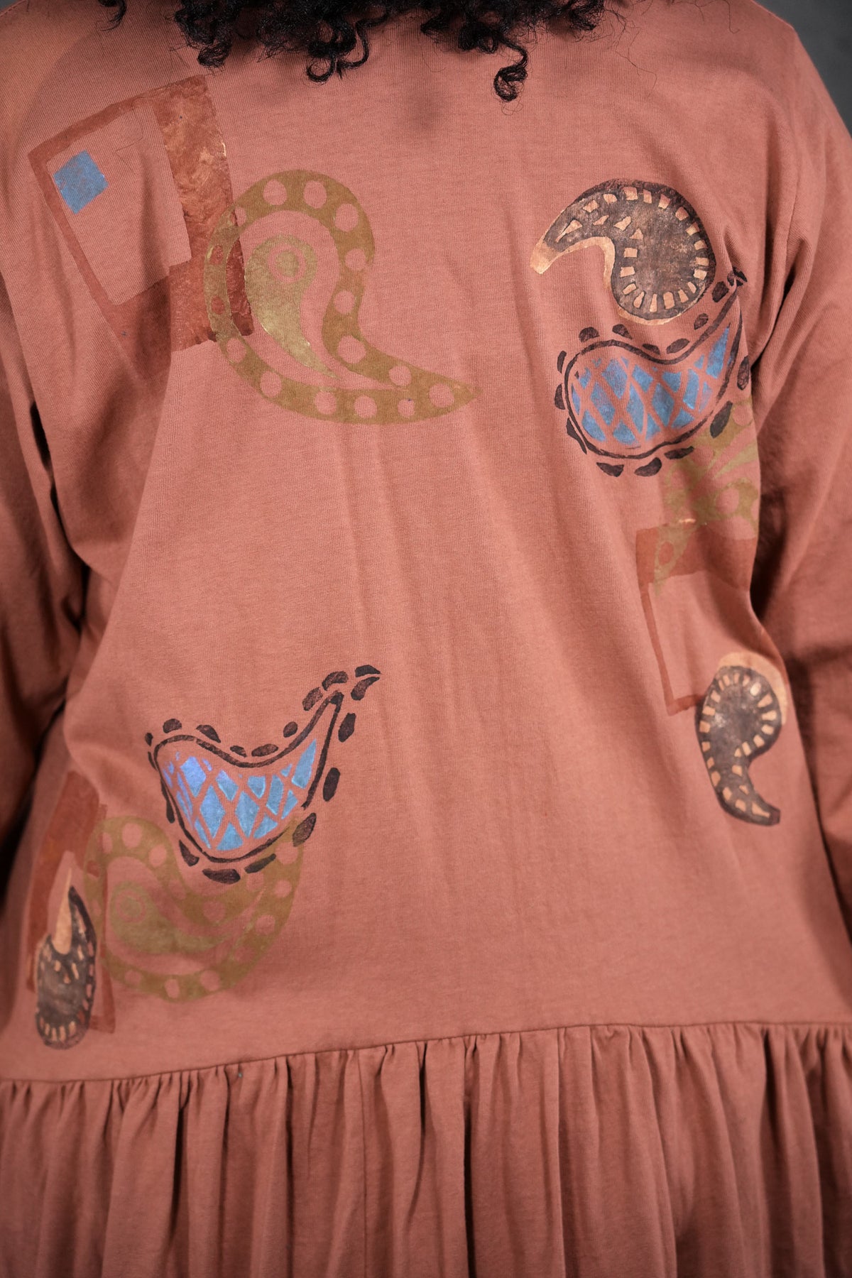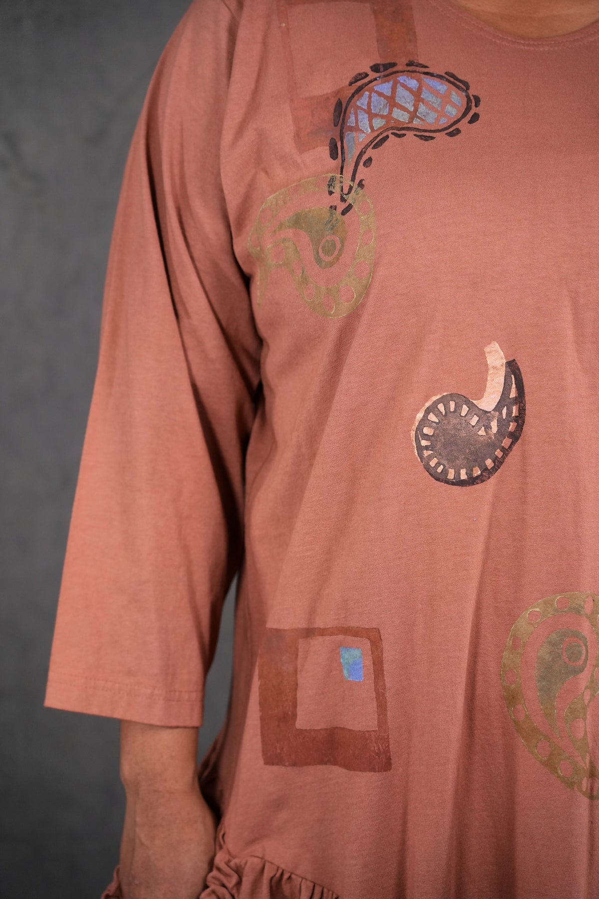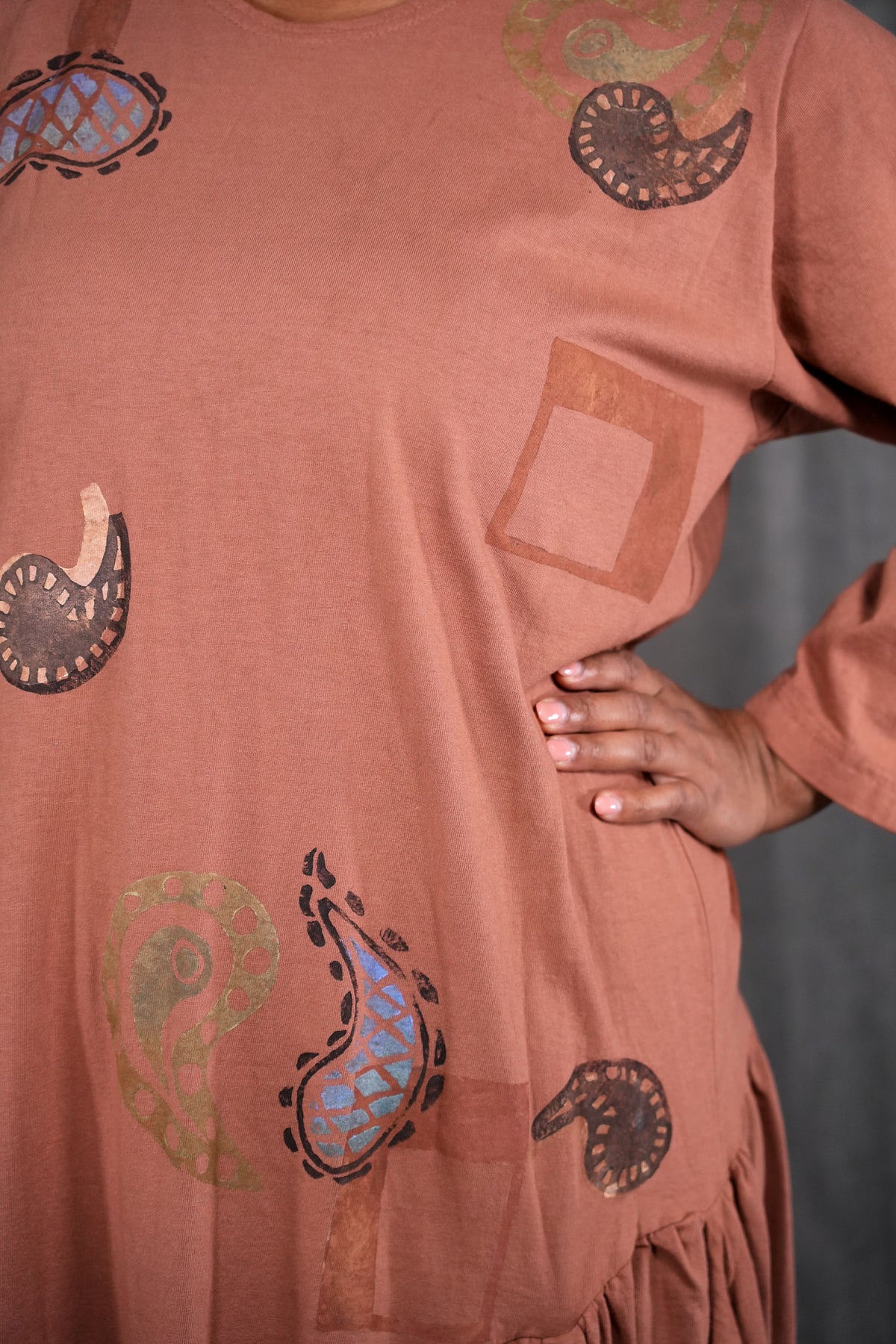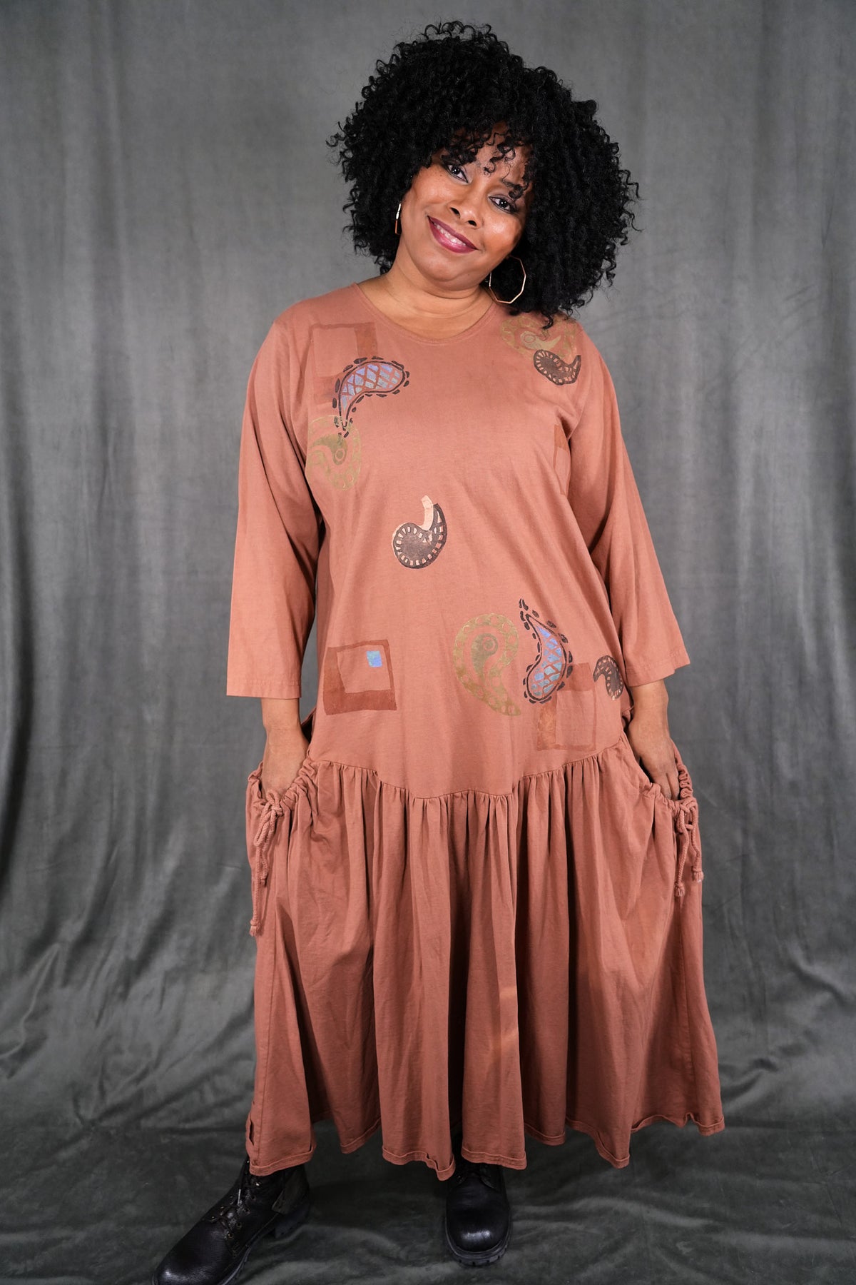 CLASSIC VINTAGE COLLECTOR ITEM 100% cotton jersey with tag that says frenchtown on it. This dress is a long peach colored beauty, with paisley block printed paisley patterns all over the front and back. The top half sports wrist length sleeves, along with a rounded neckline and all of the beautiful prints. The bottom half shows off a frilly and open hem, complete with two medium depth drawstring pockets. this dress is a comfortable and pretty length, and is wonderful for any season! This dress is the last of its kind, a oldy and goldy don't let it slip away! The skirt has some lighter dye areas in the center front they do not detract from its beauty.