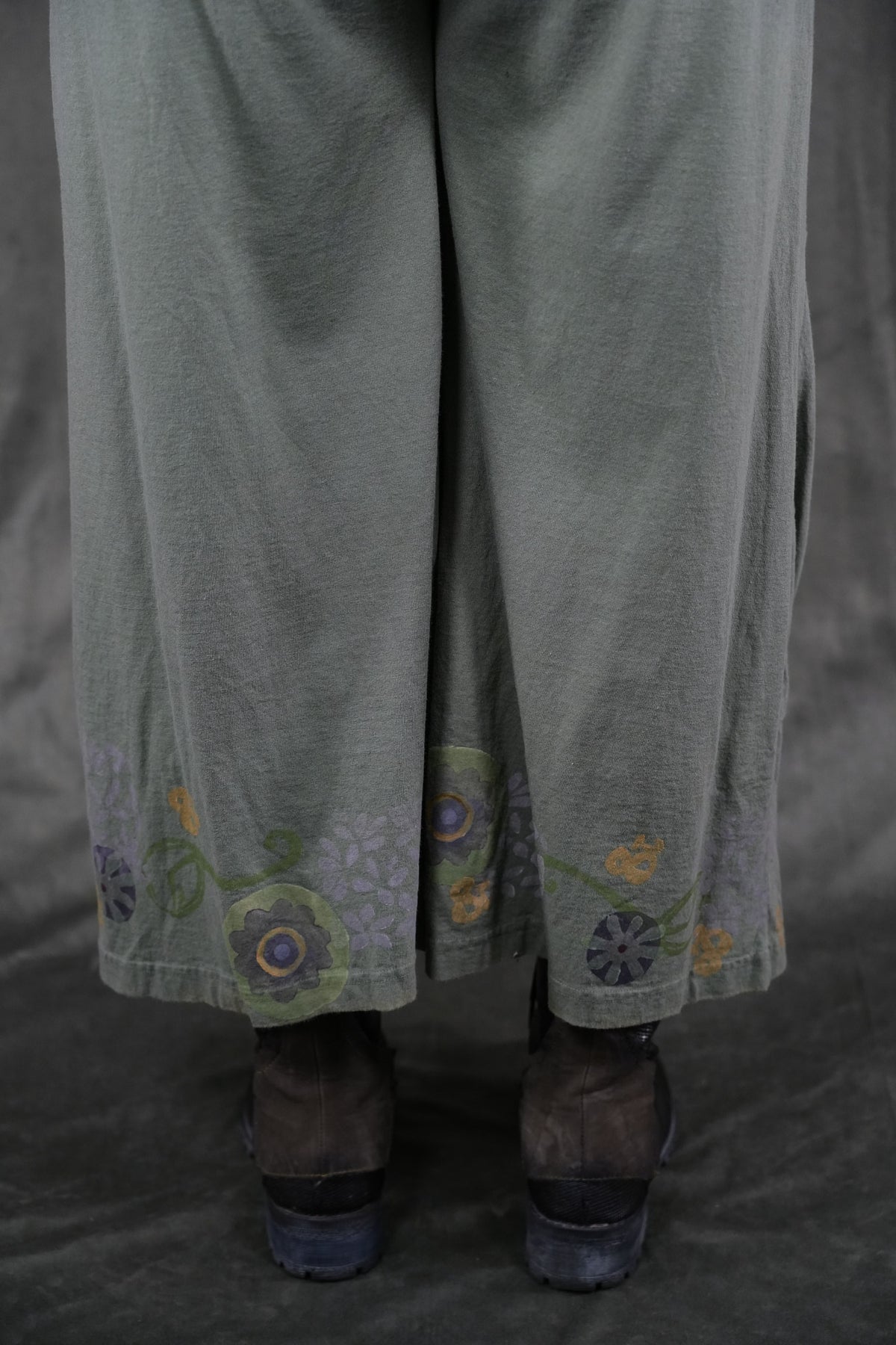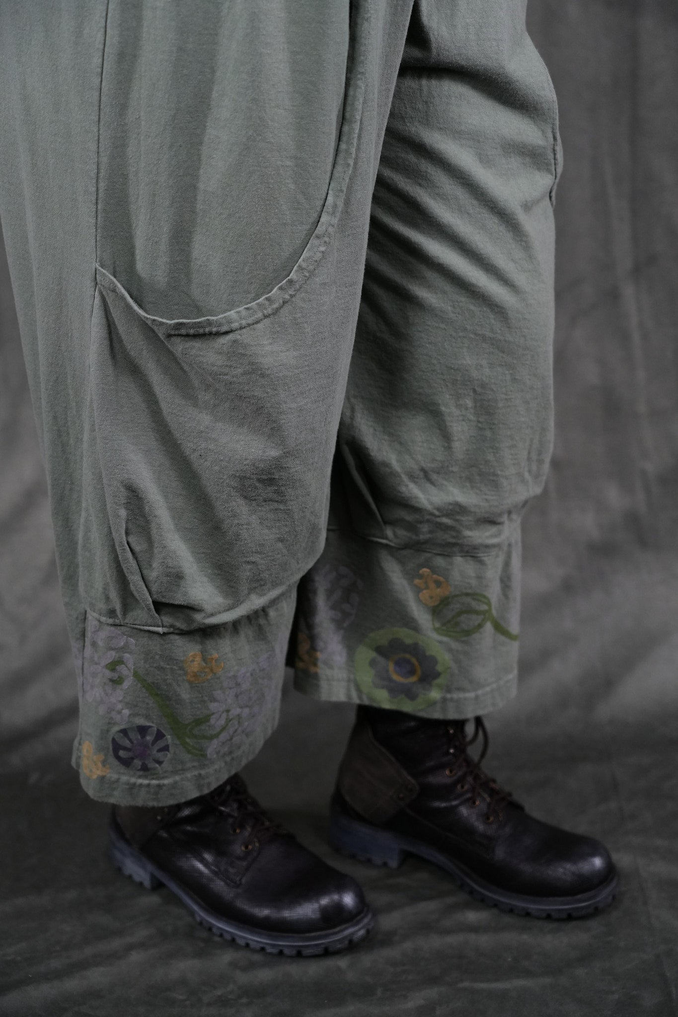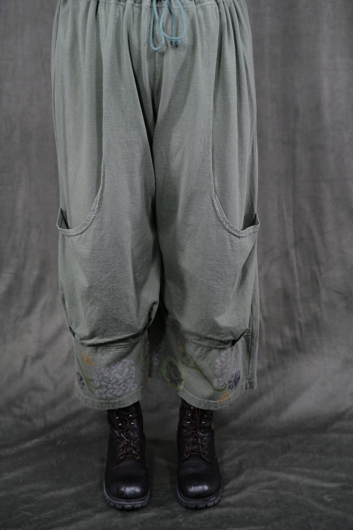 COLLECTOR's SAMPLE Old size 1- fits like a 0 SWEET VINTAGE cotton pants, contemporary swampy Vintage Blue Fish block printed botanic patterns on the cuff of the legs. Moss-colored drawstring to tighten the waist. 100% Organic Cotton and deep very low-set pockets. They pair nicely with colors like woodsy browns and deep lake blues.