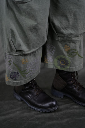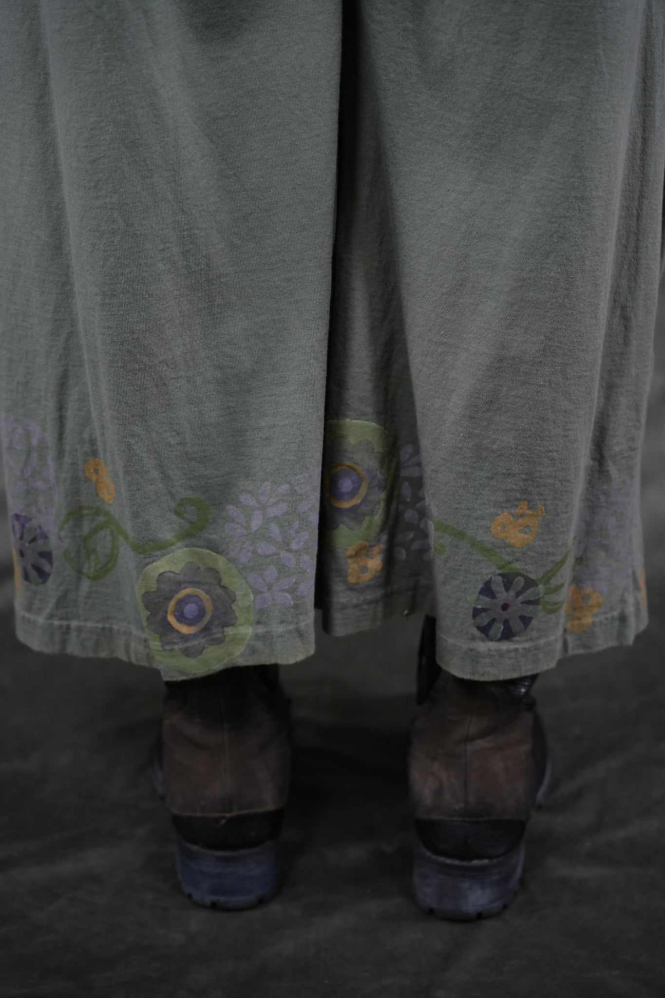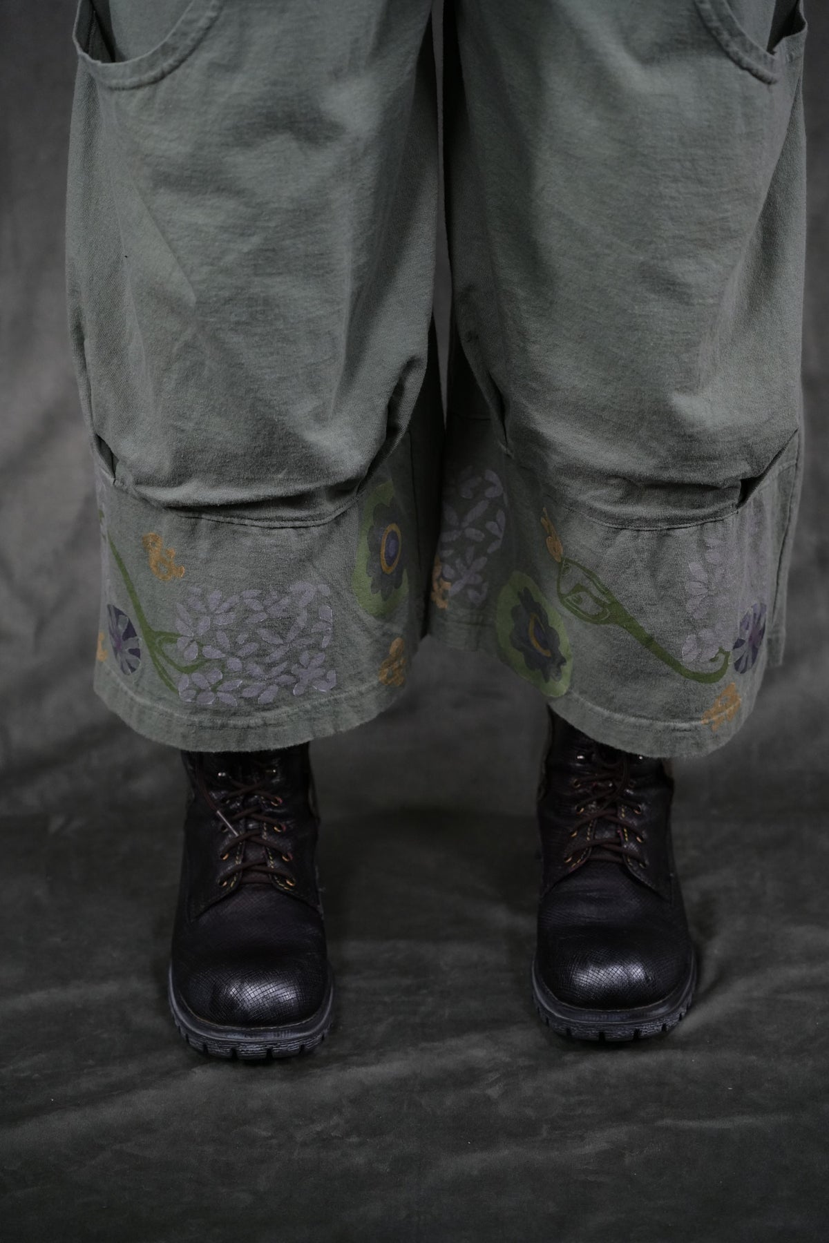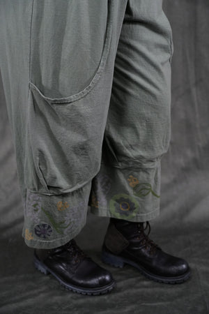 COLLECTOR's SAMPLE Old size 1- fits like a 0 SWEET VINTAGE cotton pants, contemporary swampy Vintage Blue Fish block printed botanic patterns on the cuff of the legs. Moss-colored drawstring to tighten the waist. 100% Organic Cotton and deep very low-set pockets. They pair nicely with colors like woodsy browns and deep lake blues.