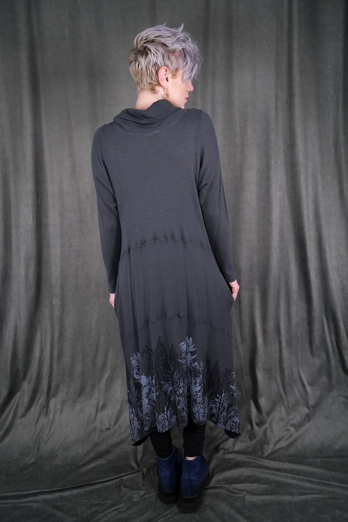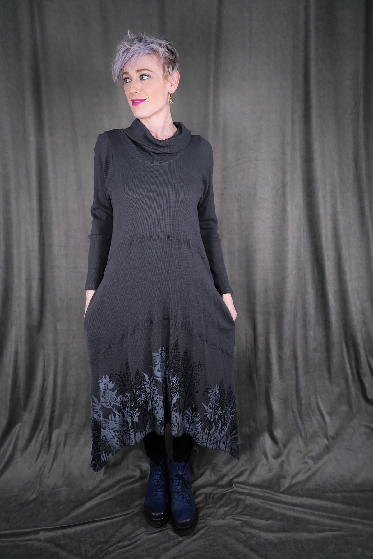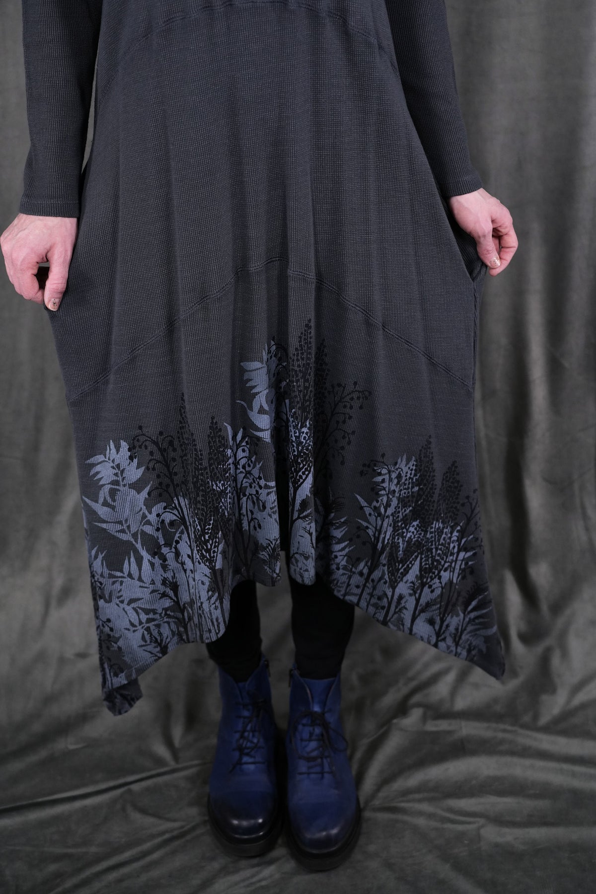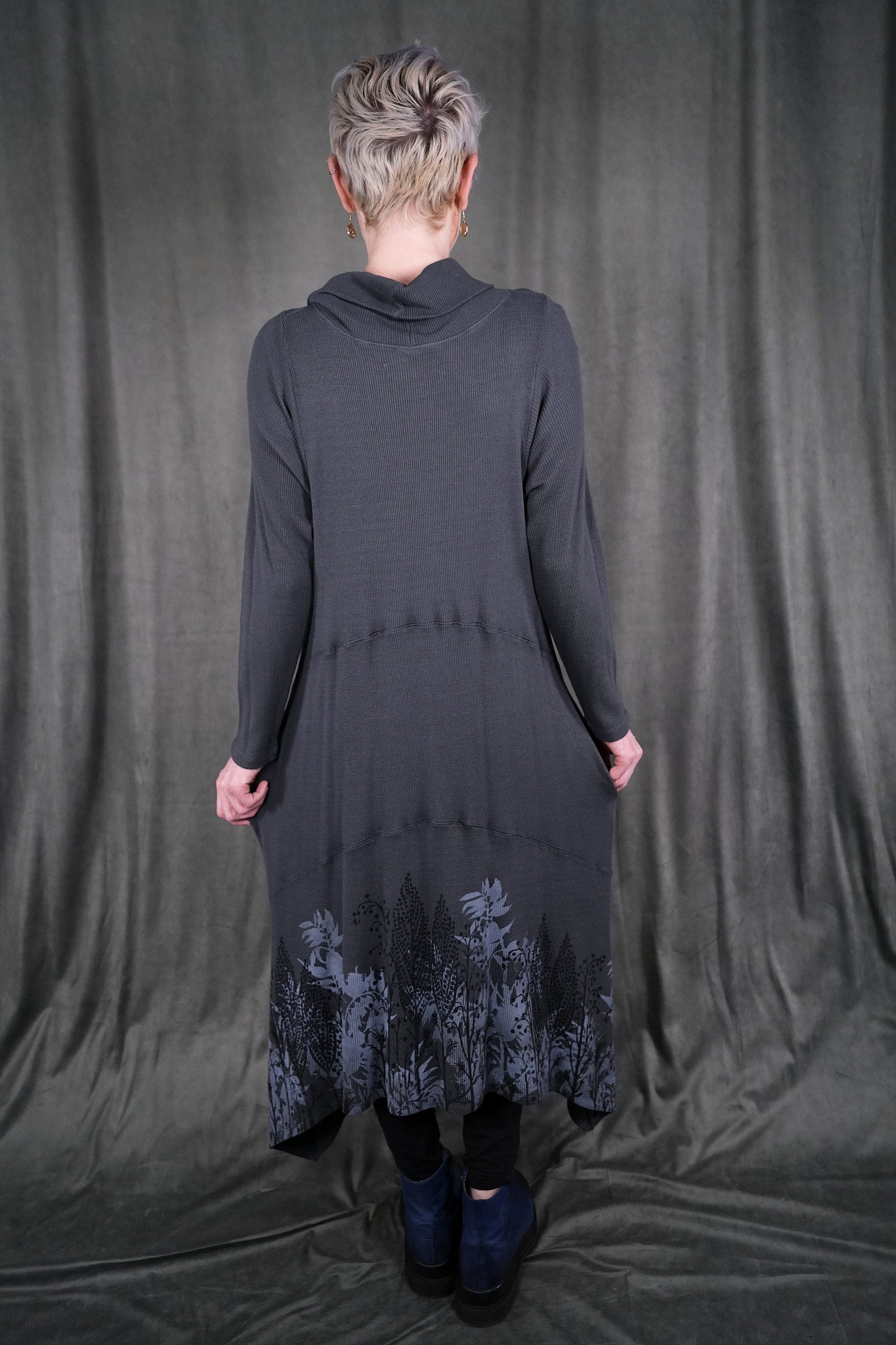 Botanical prints on front and back of this long thermal tunic dress. Longer thermal tunic with pockets for your winter wardrobe. Paneled for shaping. Length works well layered over leggings, wide pants or a long skirt. Did we mention it has pockets? Printed on the front & the back with art fresh from our studio. This top's bottom hem has a beautiful light grey icy floral print. This dress is the last of its cut and color!