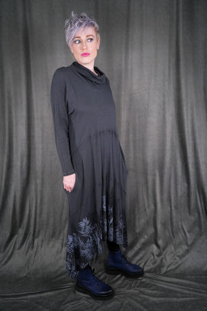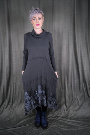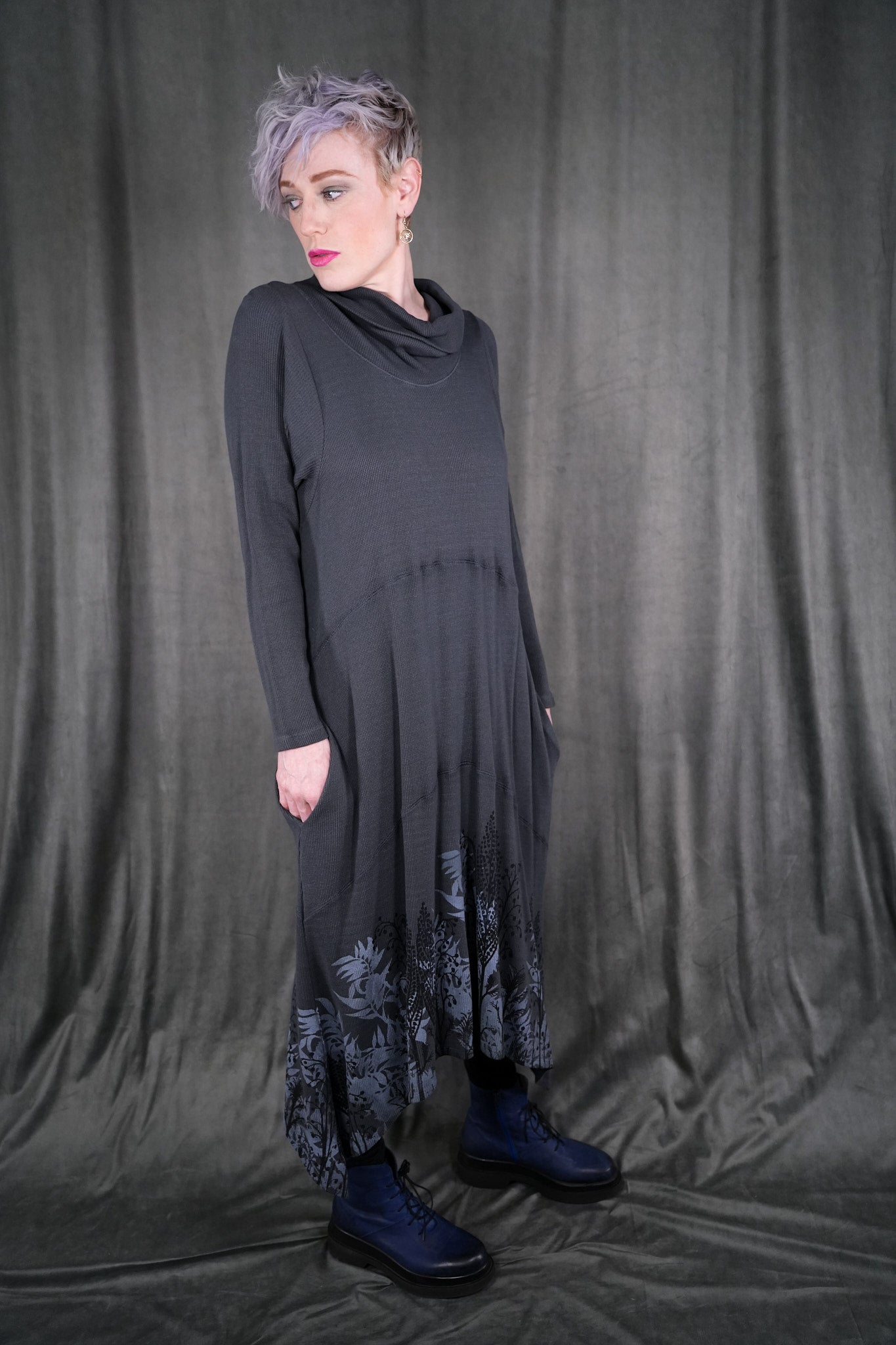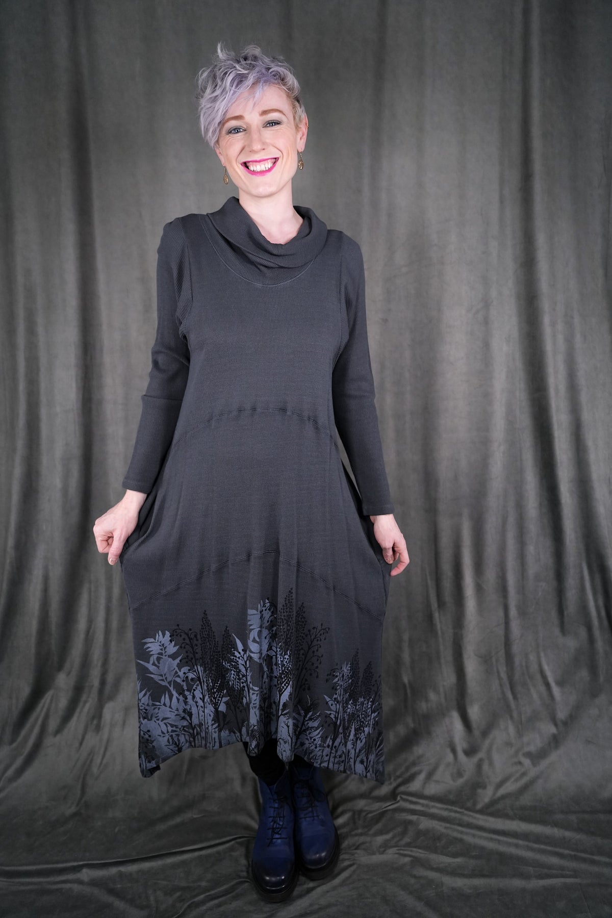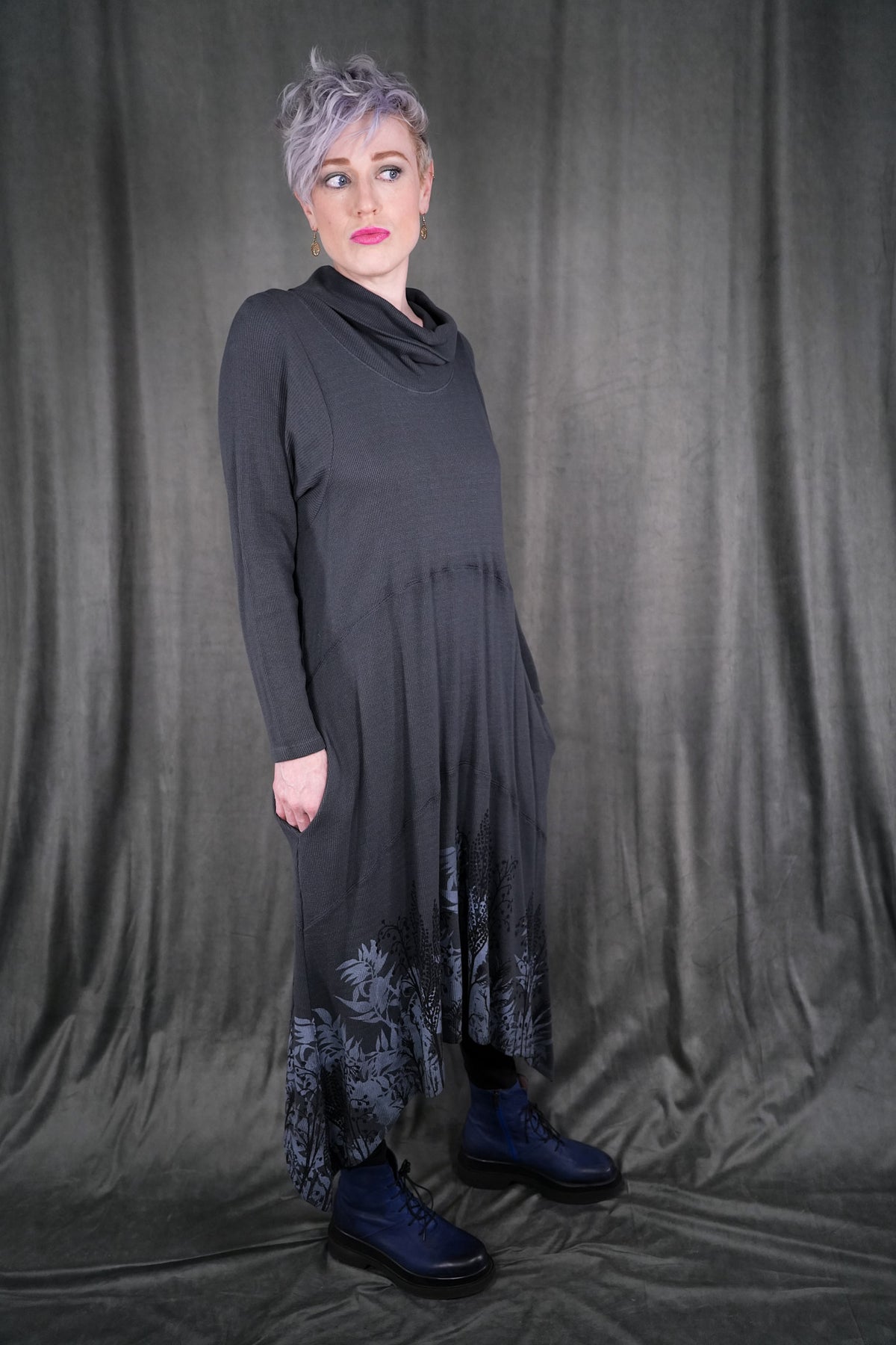 Botanical prints on front and back of this long thermal tunic dress. Longer thermal tunic with pockets for your winter wardrobe. Paneled for shaping. Length works well layered over leggings, wide pants or a long skirt. Did we mention it has pockets? Printed on the front & the back with art fresh from our studio. This top's bottom hem has a beautiful light grey icy floral print. This dress is the last of its cut and color!