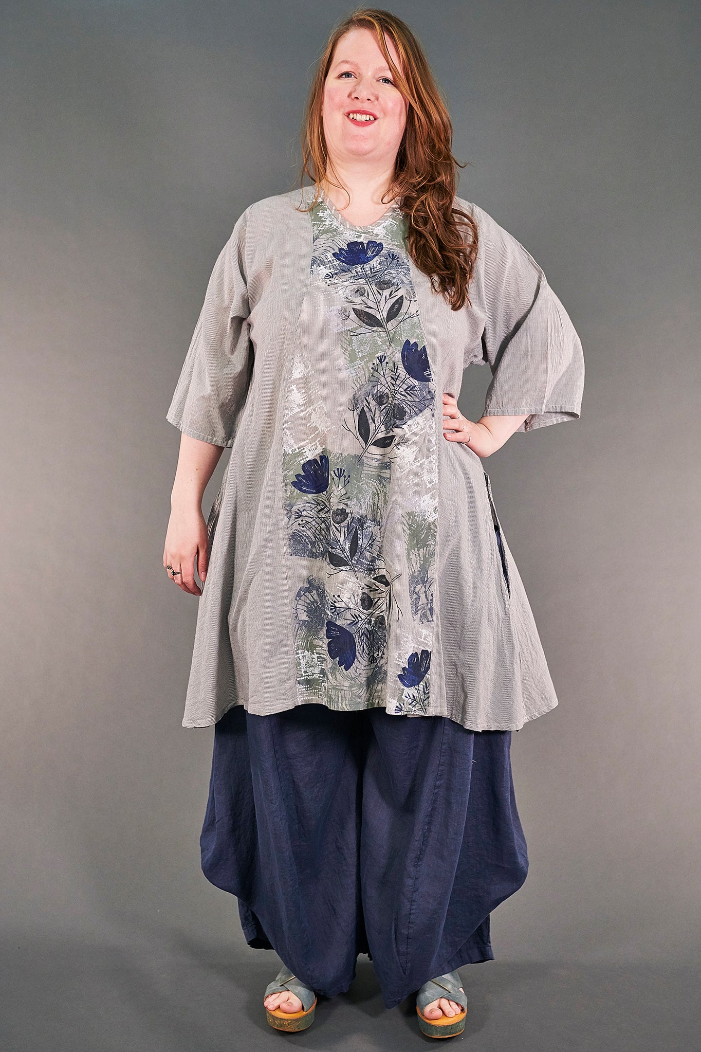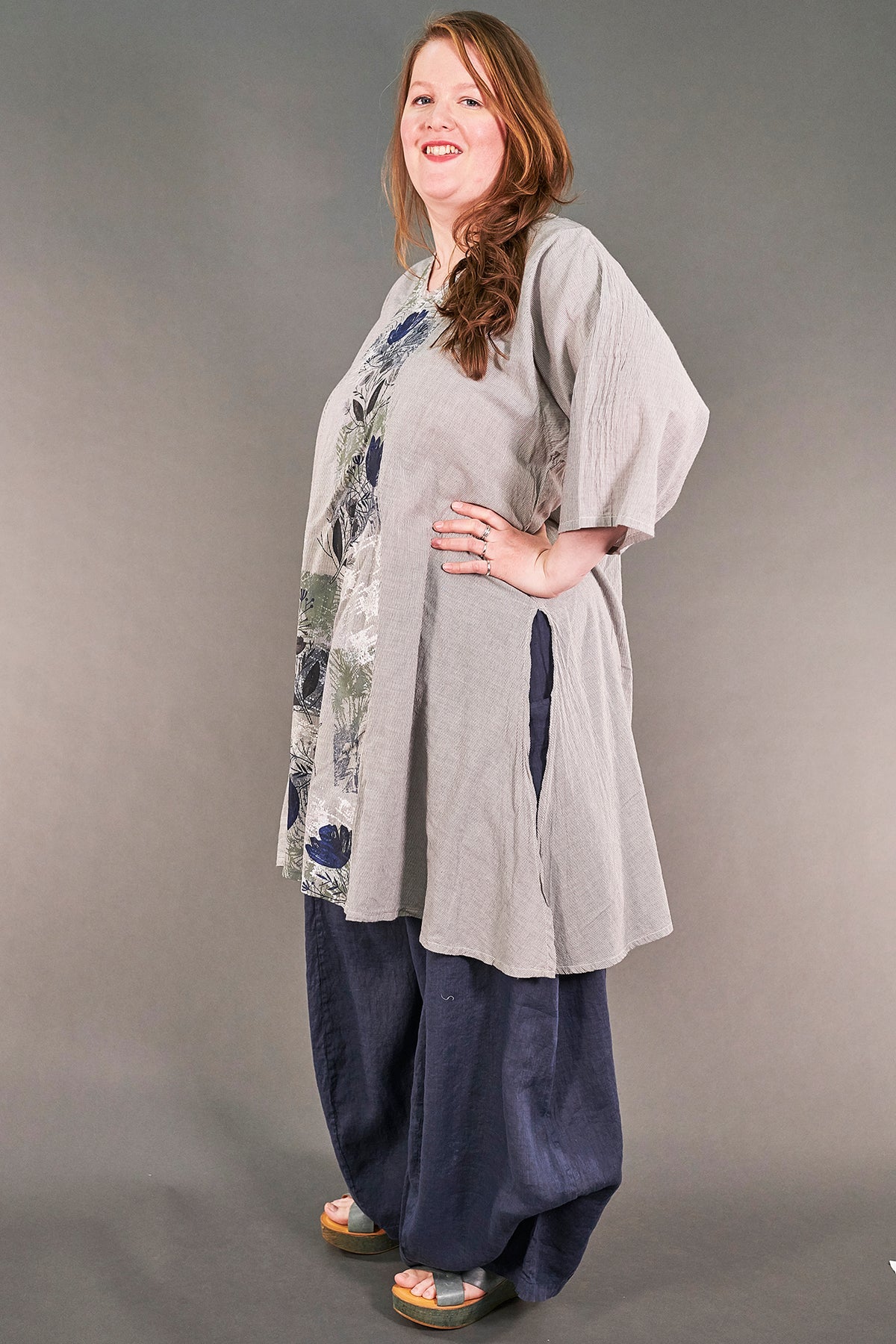 - A useful longer tunic length with deep slits on the side, a curved hemline that drops to points and a soft V neckline which flatters.