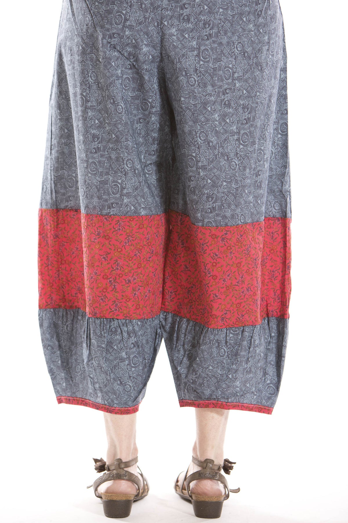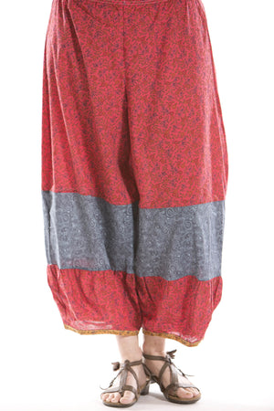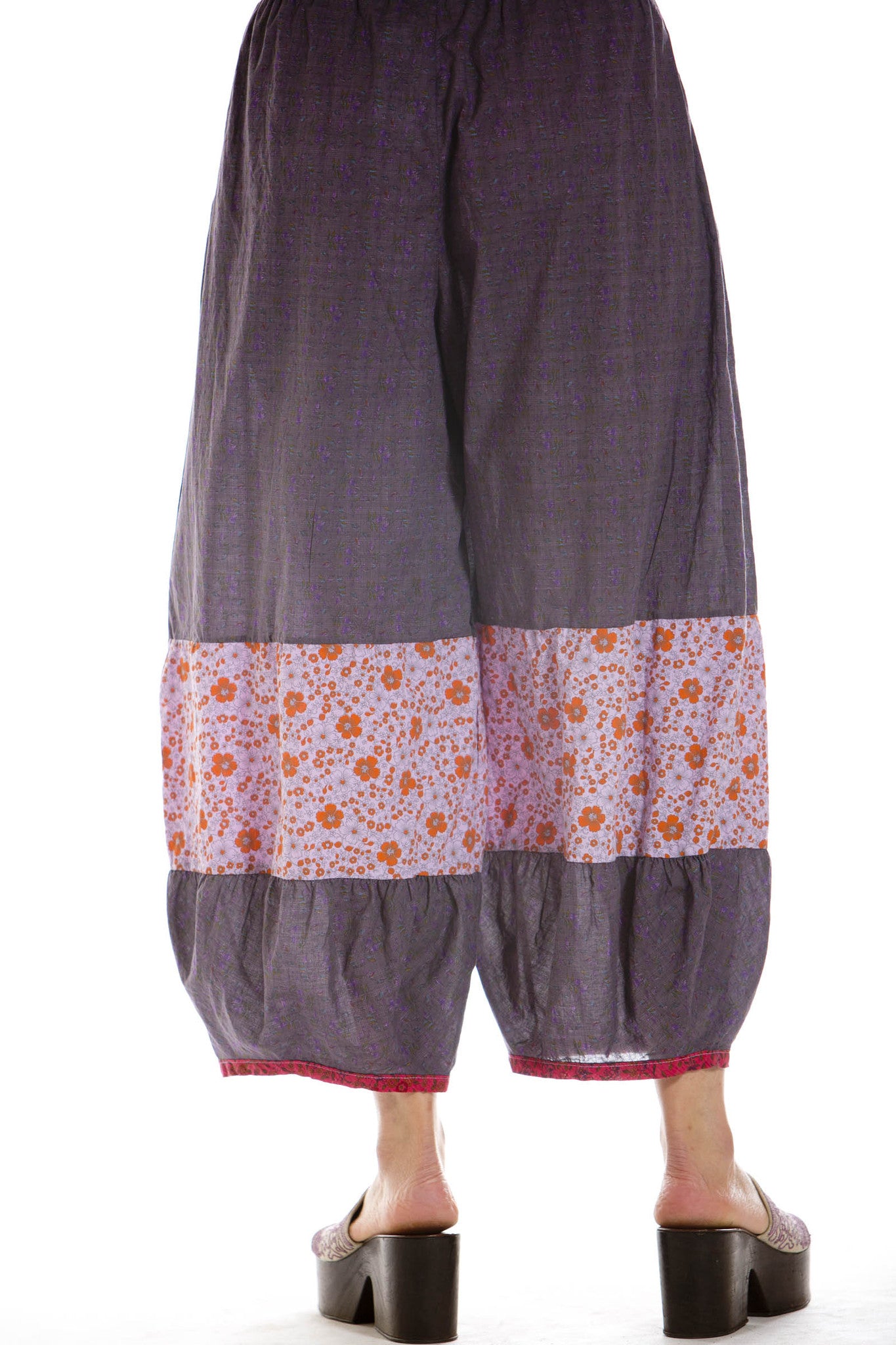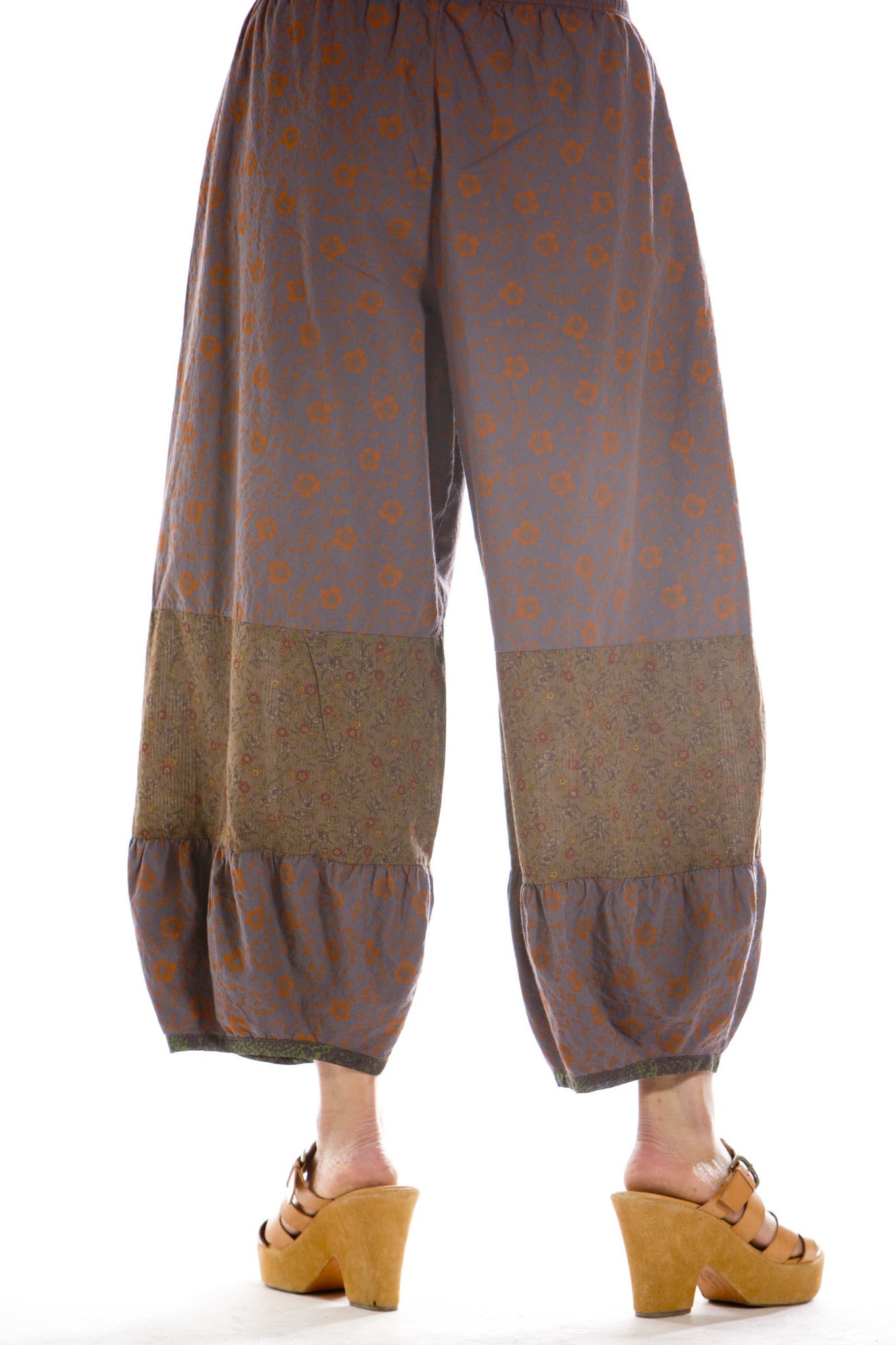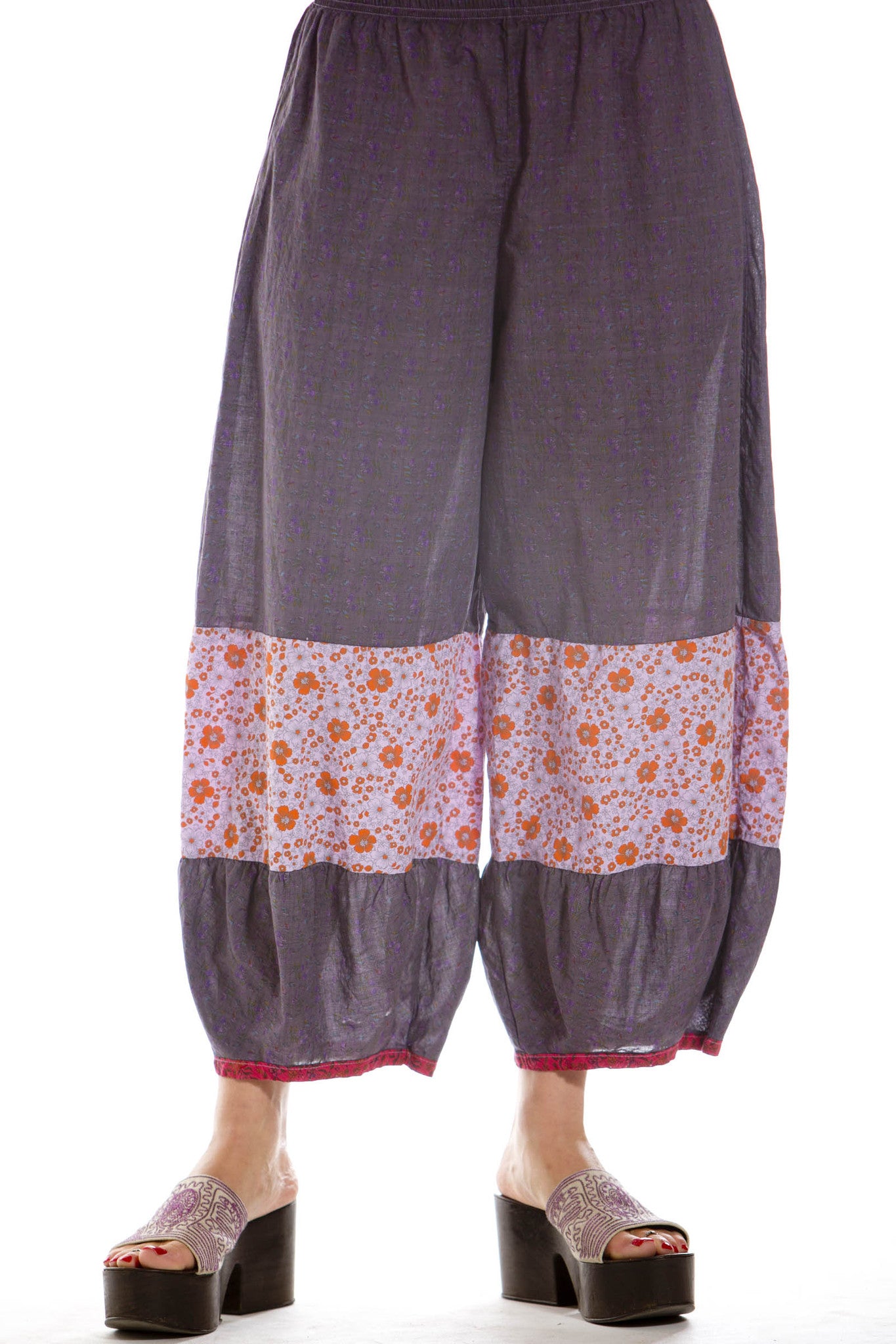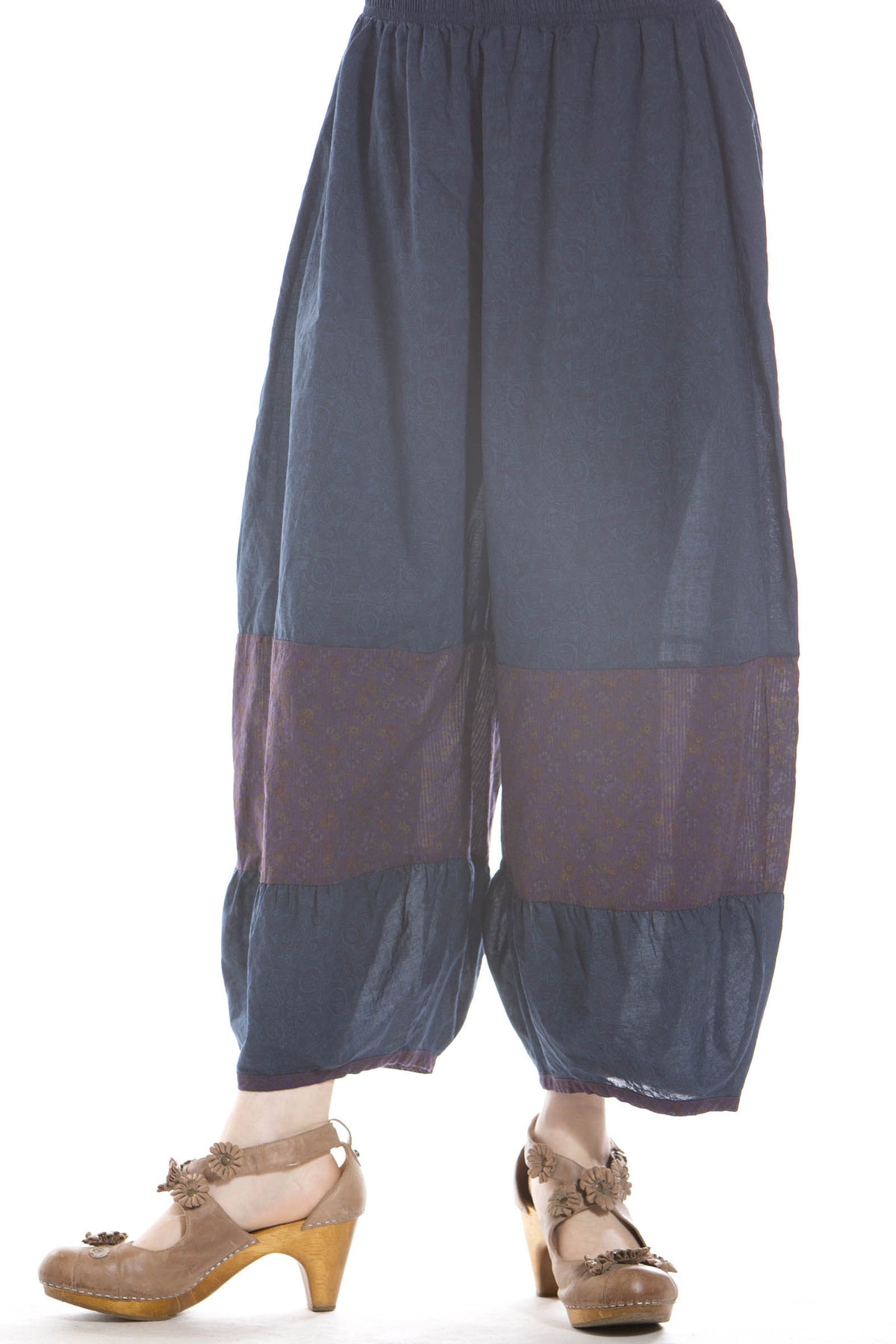 These Meadow Pants are fun to wear anywhere! The eclectic heavy weight voile prints, are united in color during our hand dyeing process. The result is unexpected, feminine, and unique. Each pair is different, and varied. To see the exact print combination you will get please give us a call.