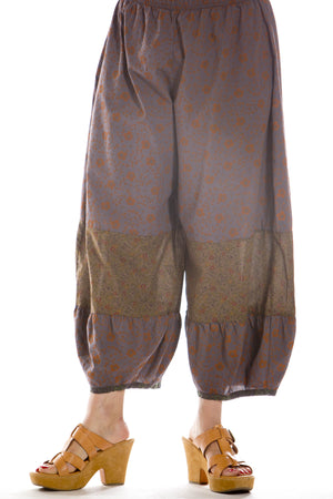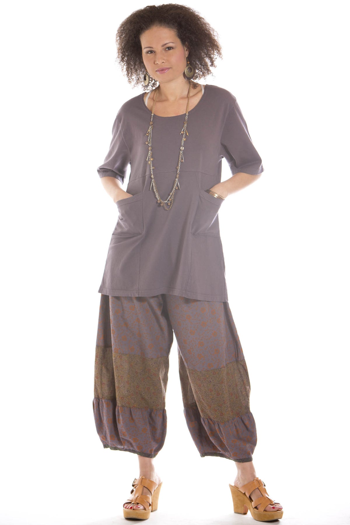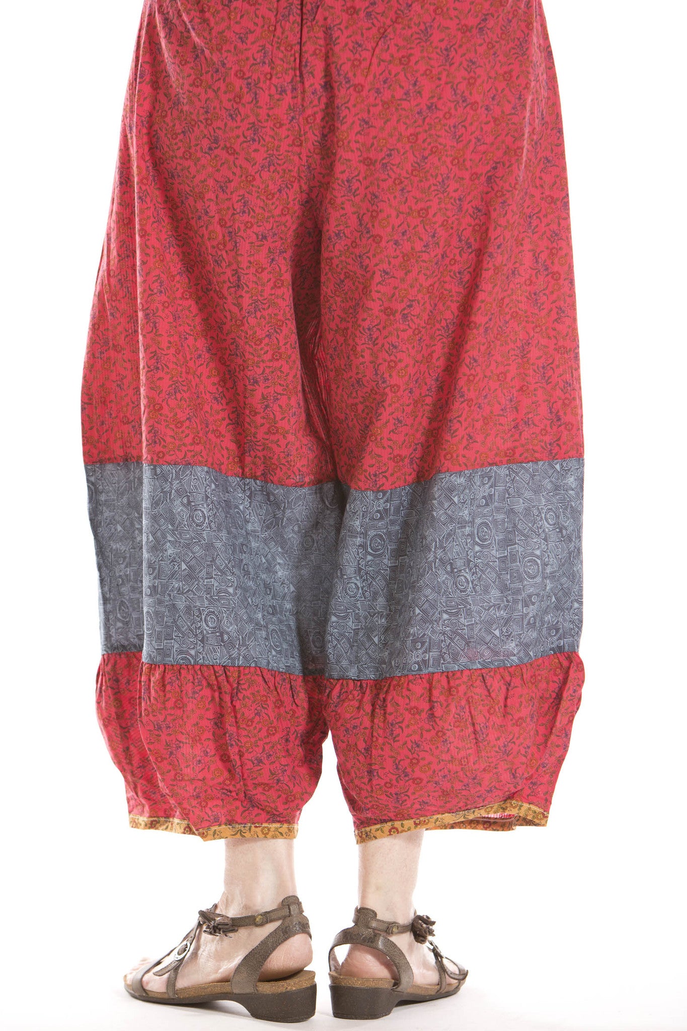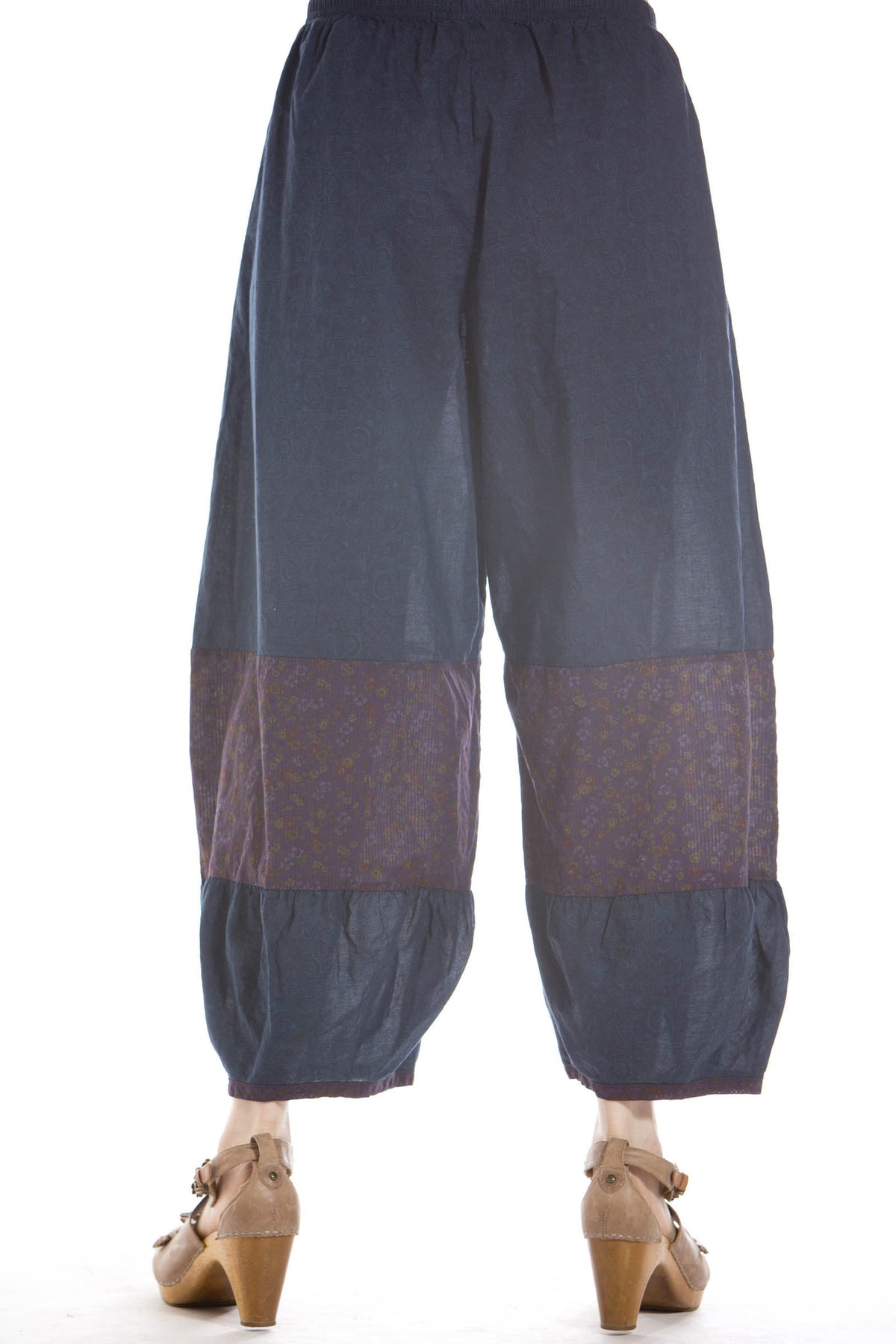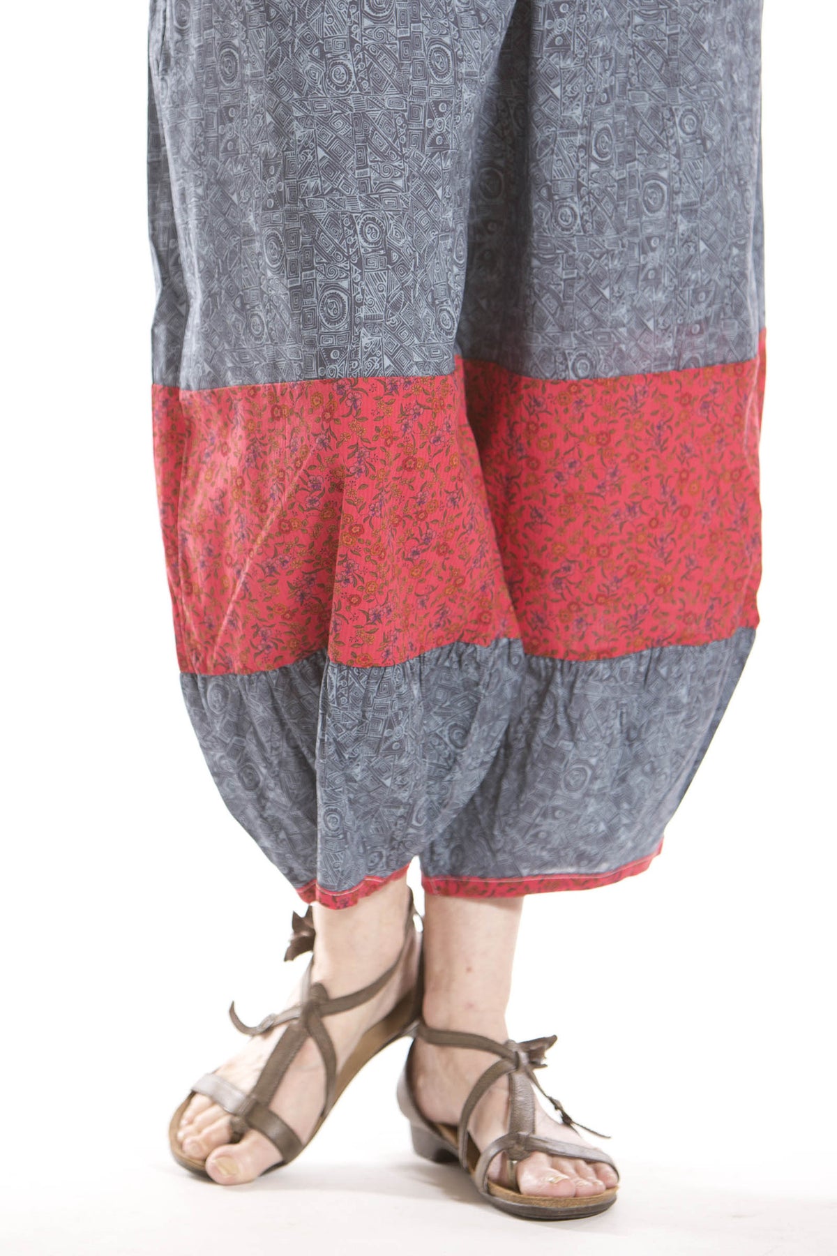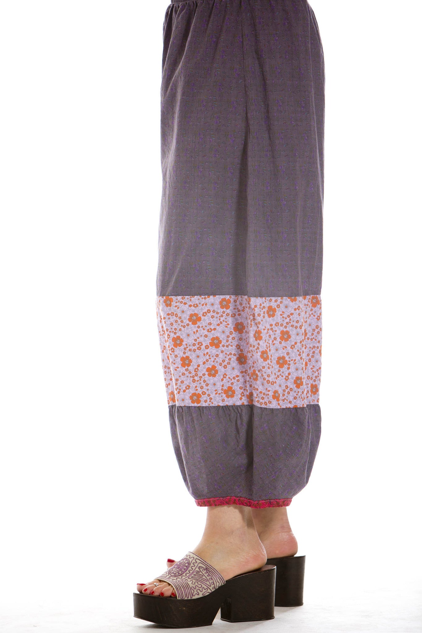 These Meadow Pants are fun to wear anywhere! The eclectic heavy weight voile prints, are united in color during our hand dyeing process. The result is unexpected, feminine, and unique. Each pair is different, and varied. To see the exact print combination you will get please give us a call.