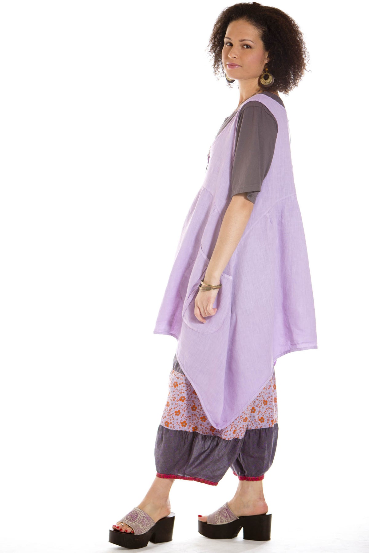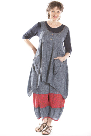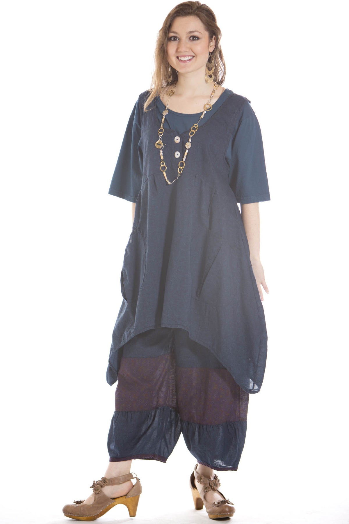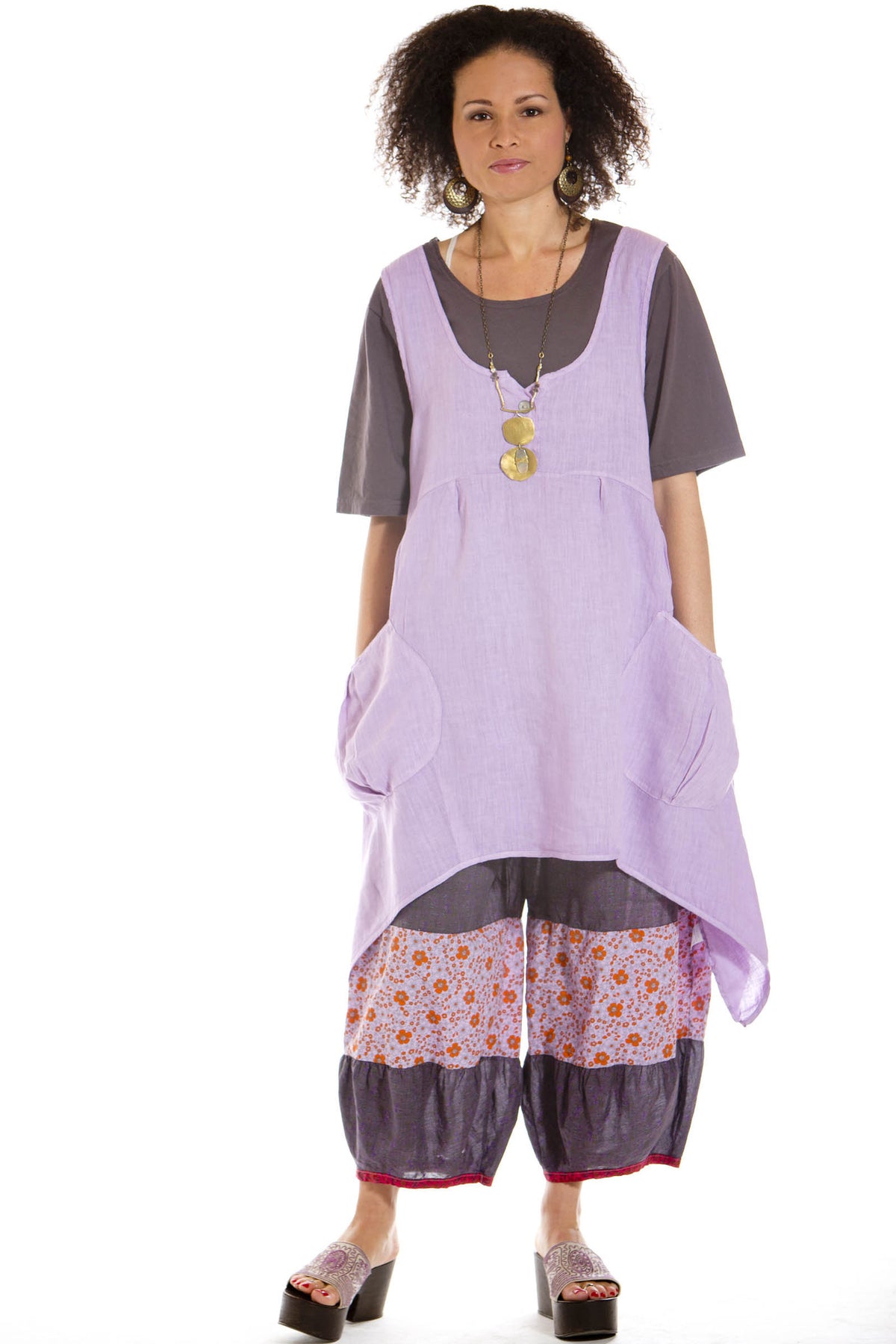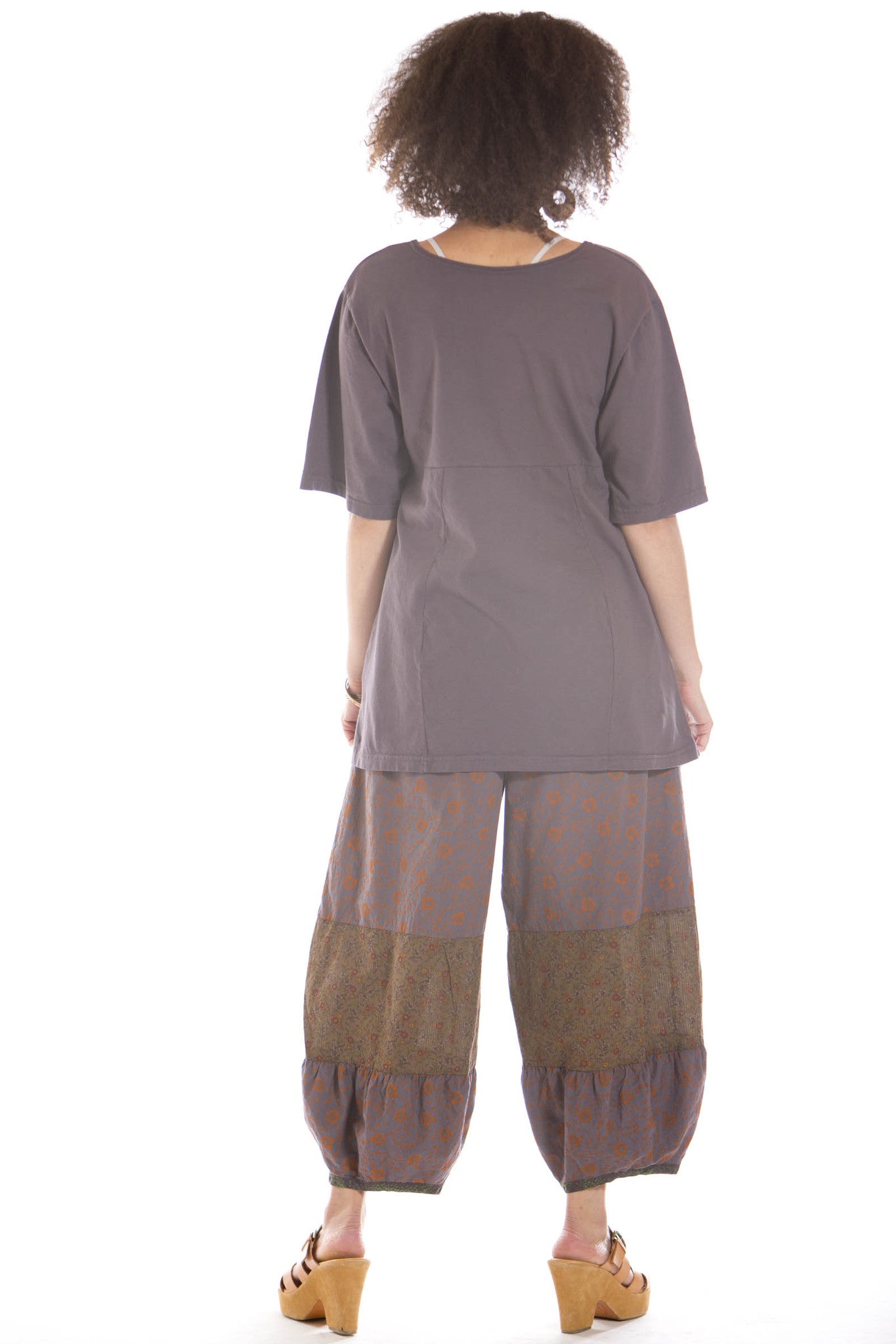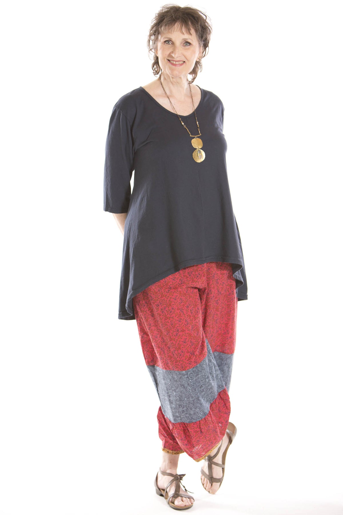 These Meadow Pants are fun to wear anywhere! The eclectic heavy weight voile prints, are united in color during our hand dyeing process. The result is unexpected, feminine, and unique. Each pair is different, and varied. To see the exact print combination you will get please give us a call.